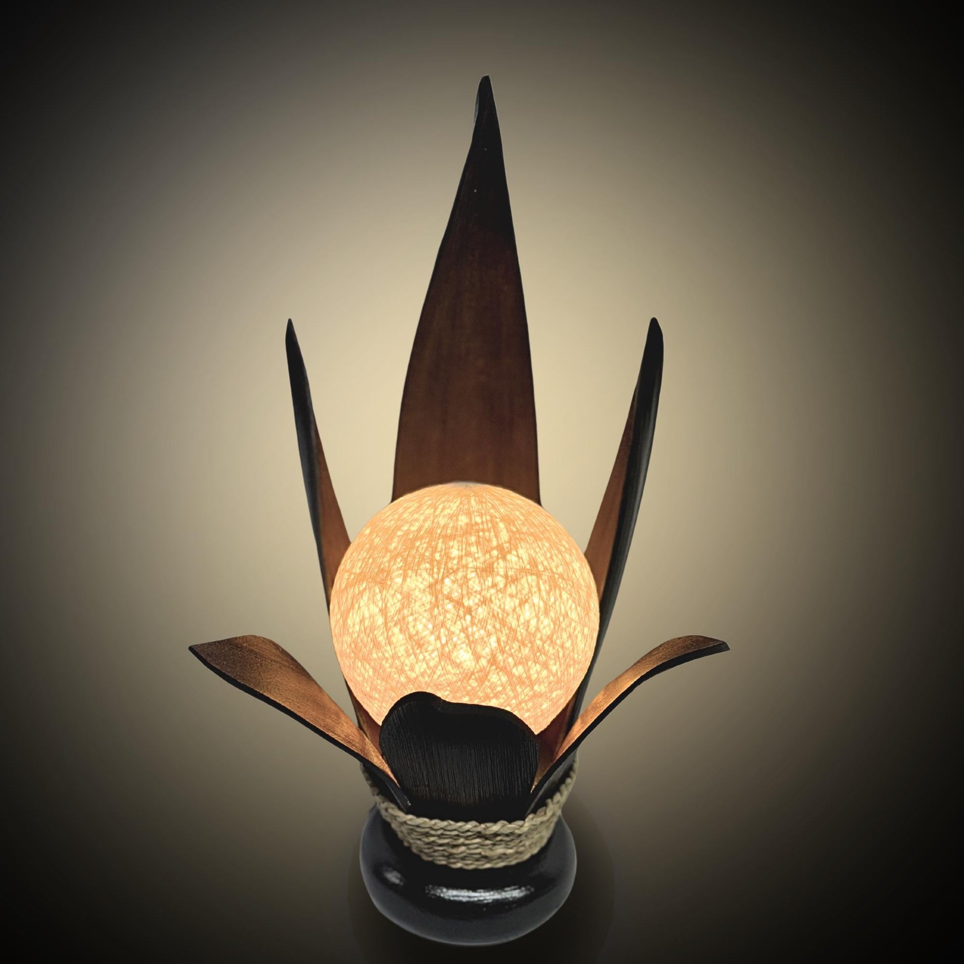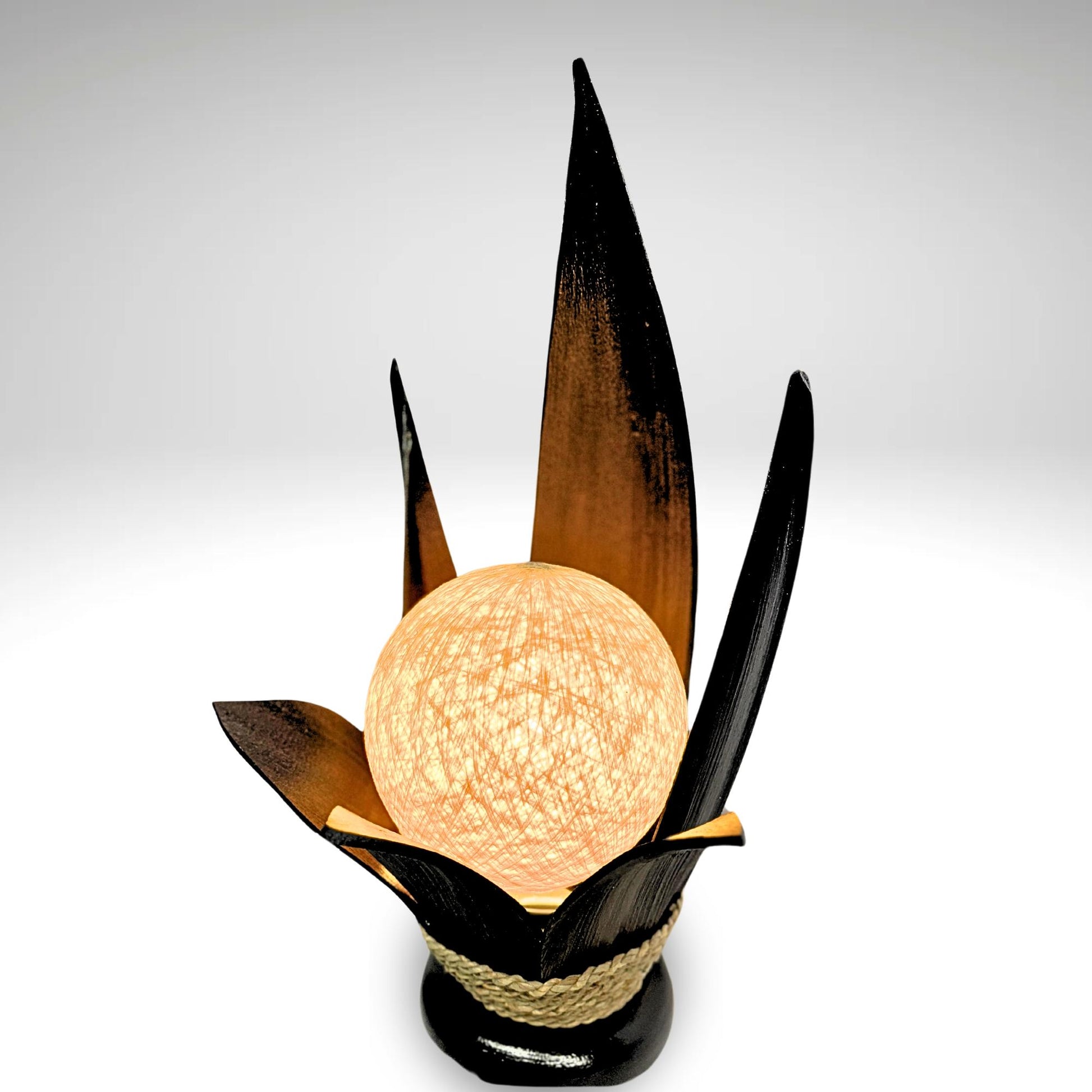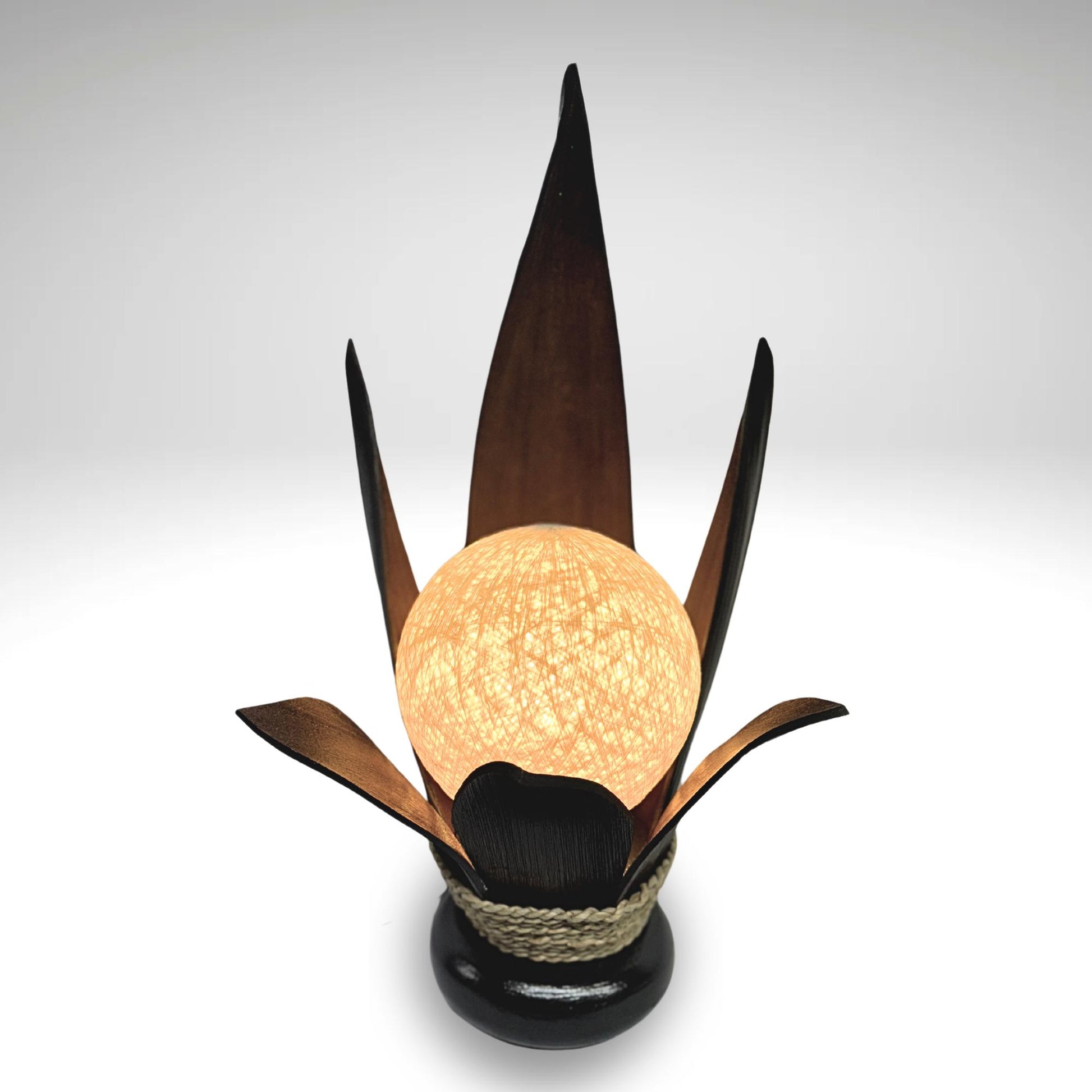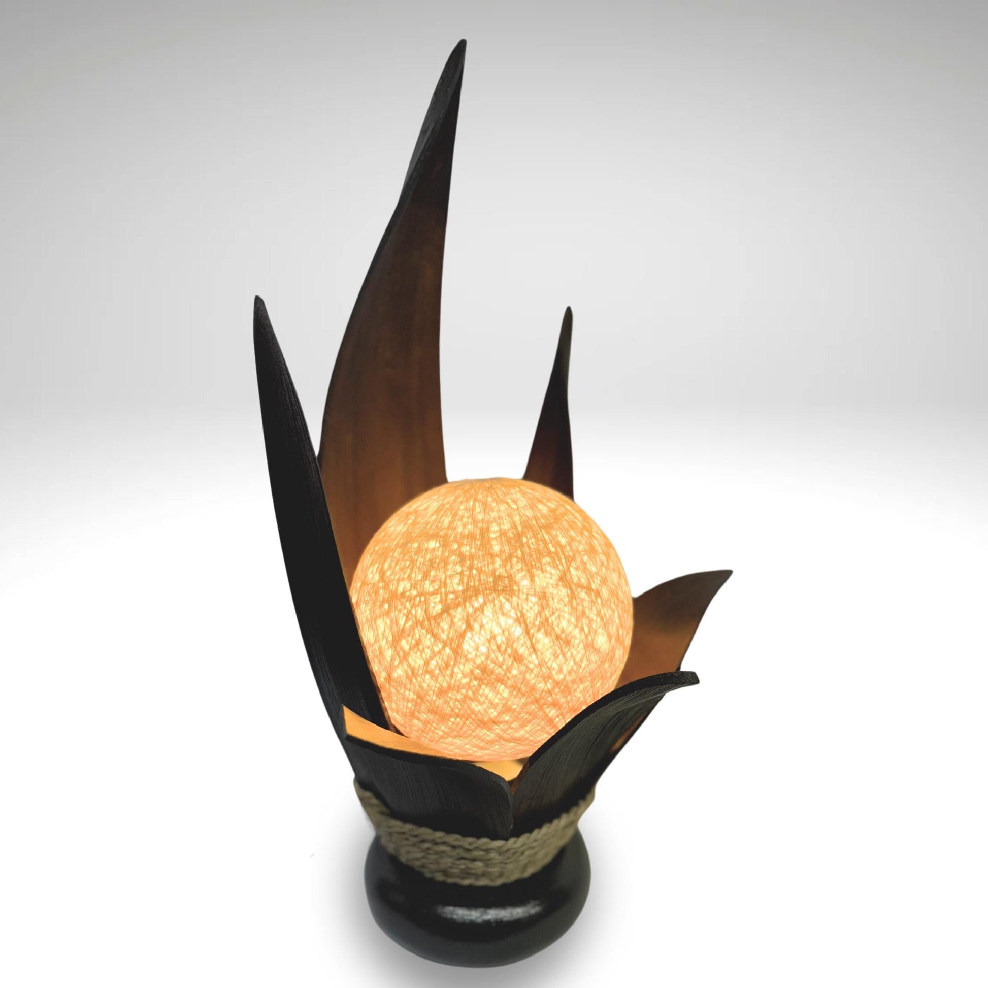 Palm Frond Lotus Accent Lamp, crafted from the upcycled sheaths that incase of palm fronds before they unfurl. The sheaths are carefully harvested and dyed with natural dyes in the shade of black coffee. Then carefully formed into this Lotus Flower shape and wrapped with sisal cord. It is then mounted upon a wooden base and wired with a lamp socket and cord-set. The globe shaped shade is formed from cotton fiber wound into a sphere, which sits over the light bulb to softly diffuse the light. Creates a beautiful warm ambiance that will add a glowing warmth to your funky eclectic decor.