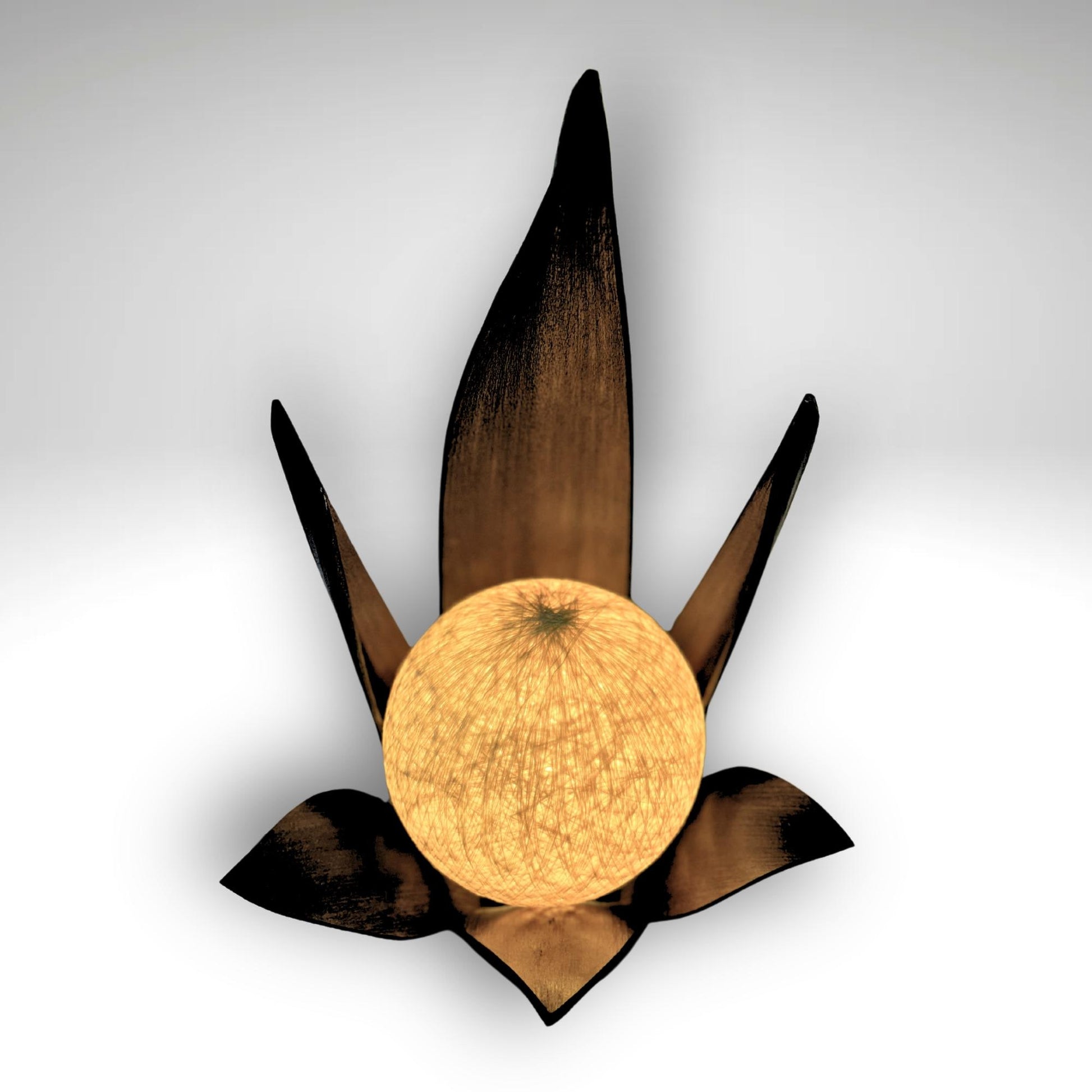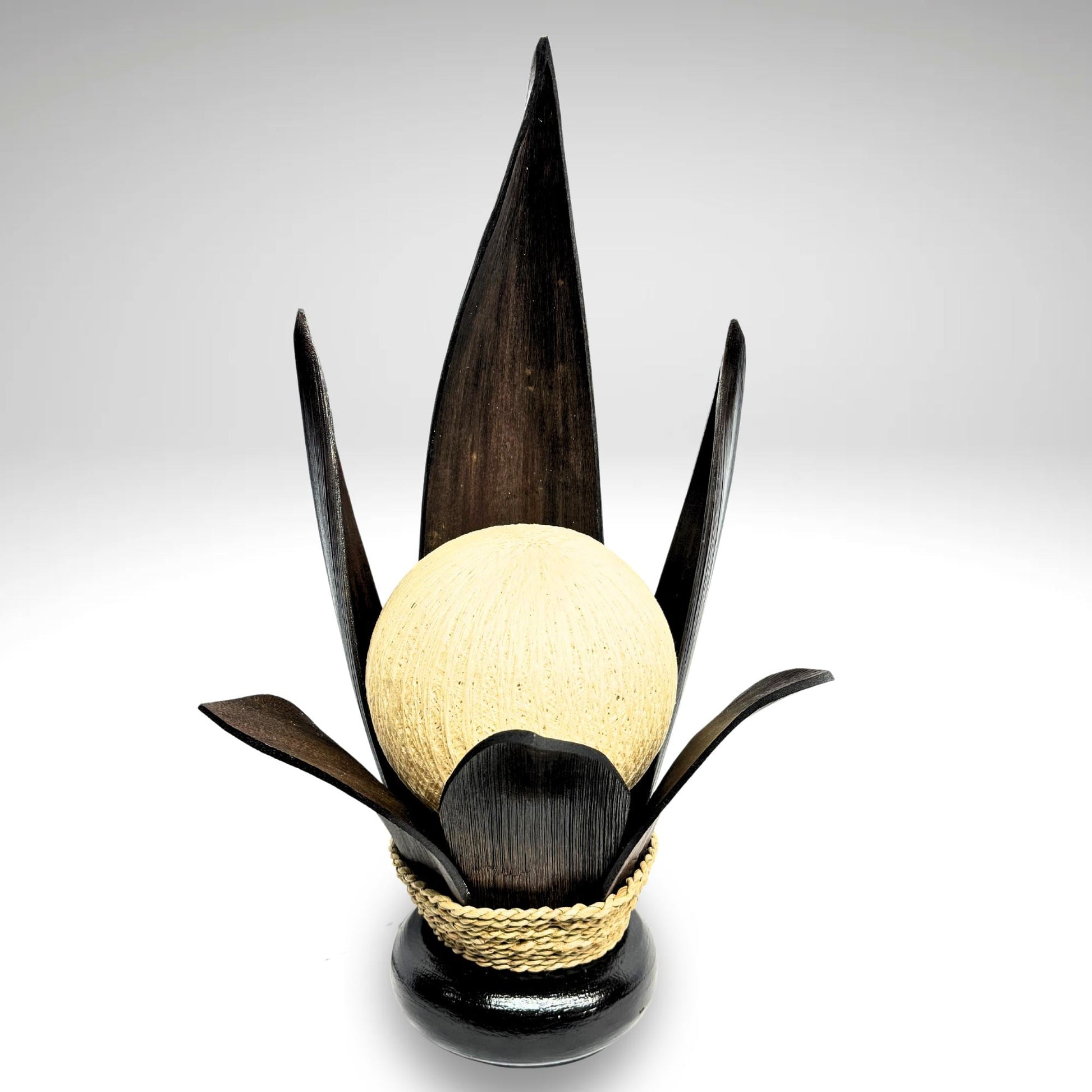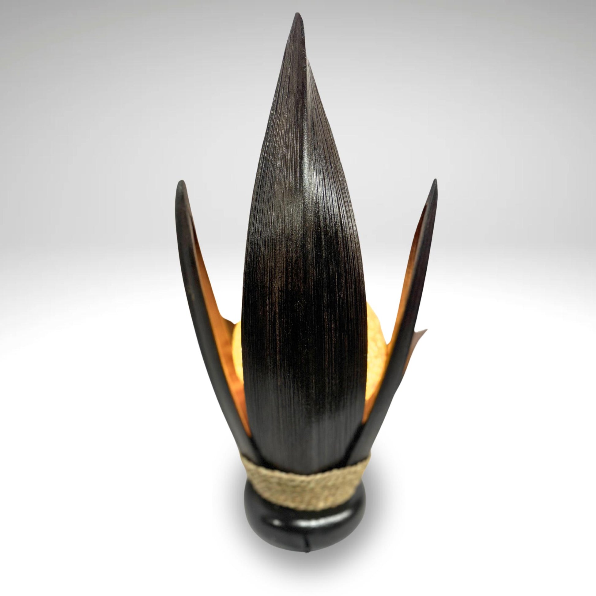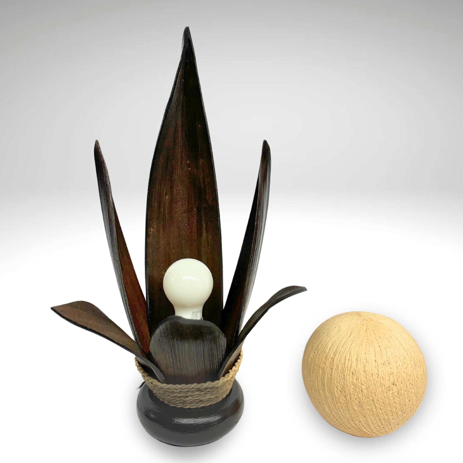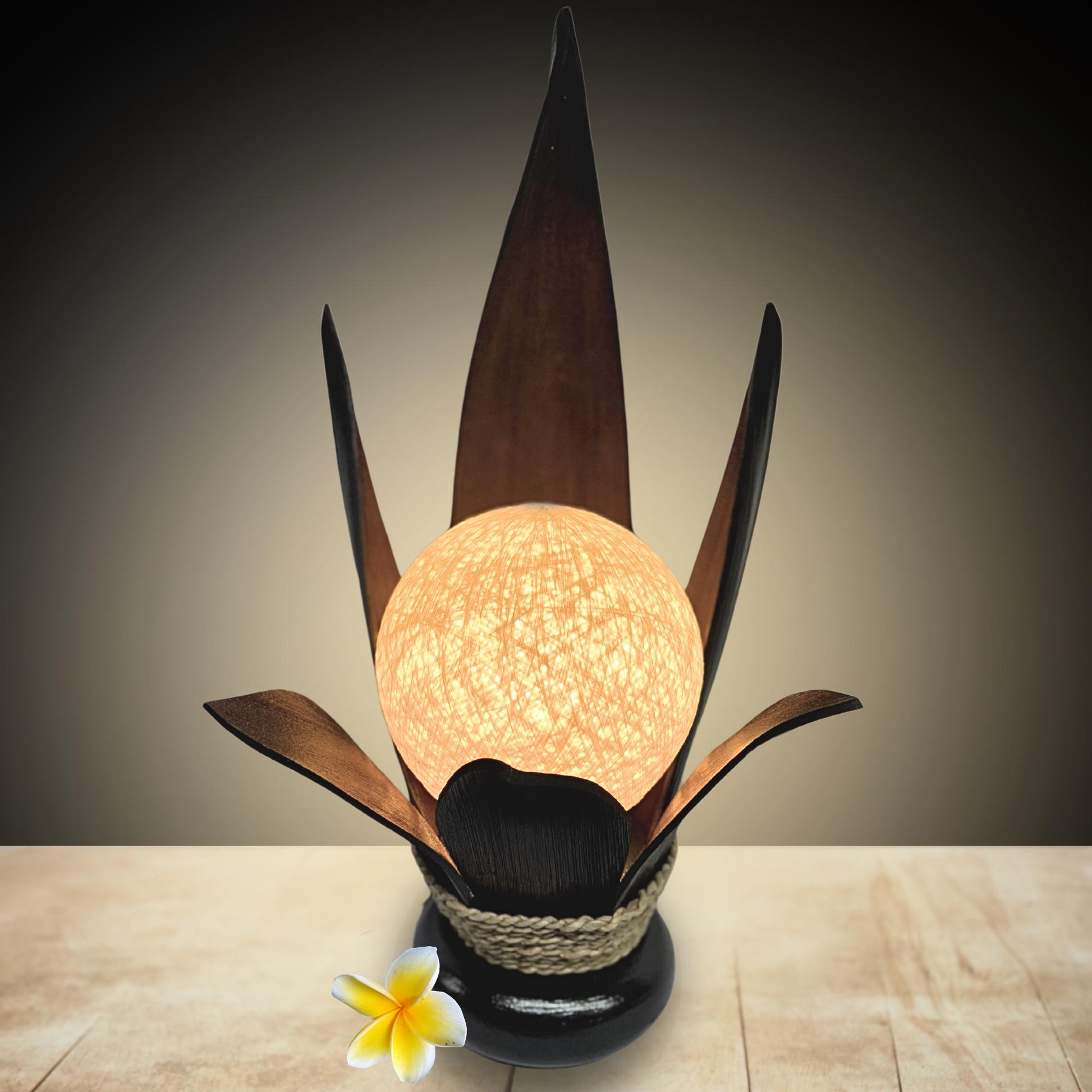 Palm Frond Lotus Accent Lamp, crafted from the upcycled sheaths that incase of palm fronds before they unfurl. The sheaths are carefully harvested and dyed with natural dyes in the shade of black coffee. Then carefully formed into this Lotus Flower shape and wrapped with sisal cord. It is then mounted upon a wooden base and wired with a lamp socket and cord-set. The globe shaped shade is formed from cotton fiber wound into a sphere, which sits over the light bulb to softly diffuse the light. Creates a beautiful warm ambiance that will add a glowing warmth to your funky eclectic decor.