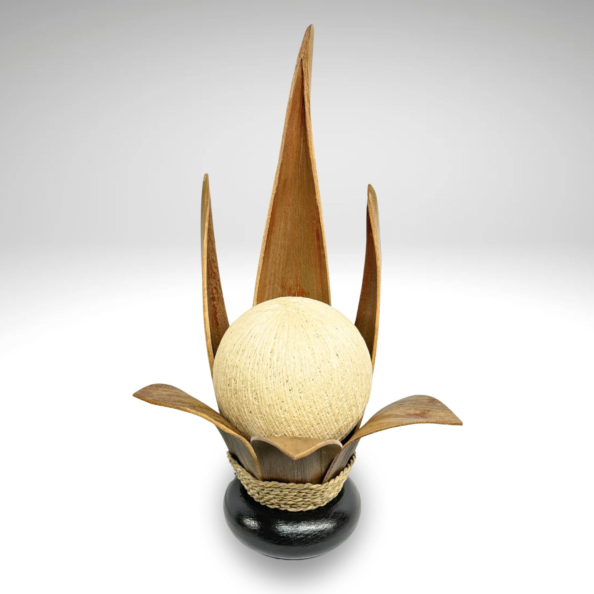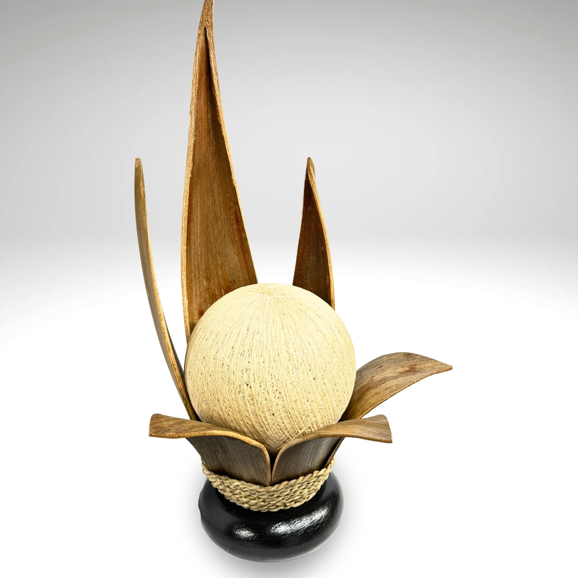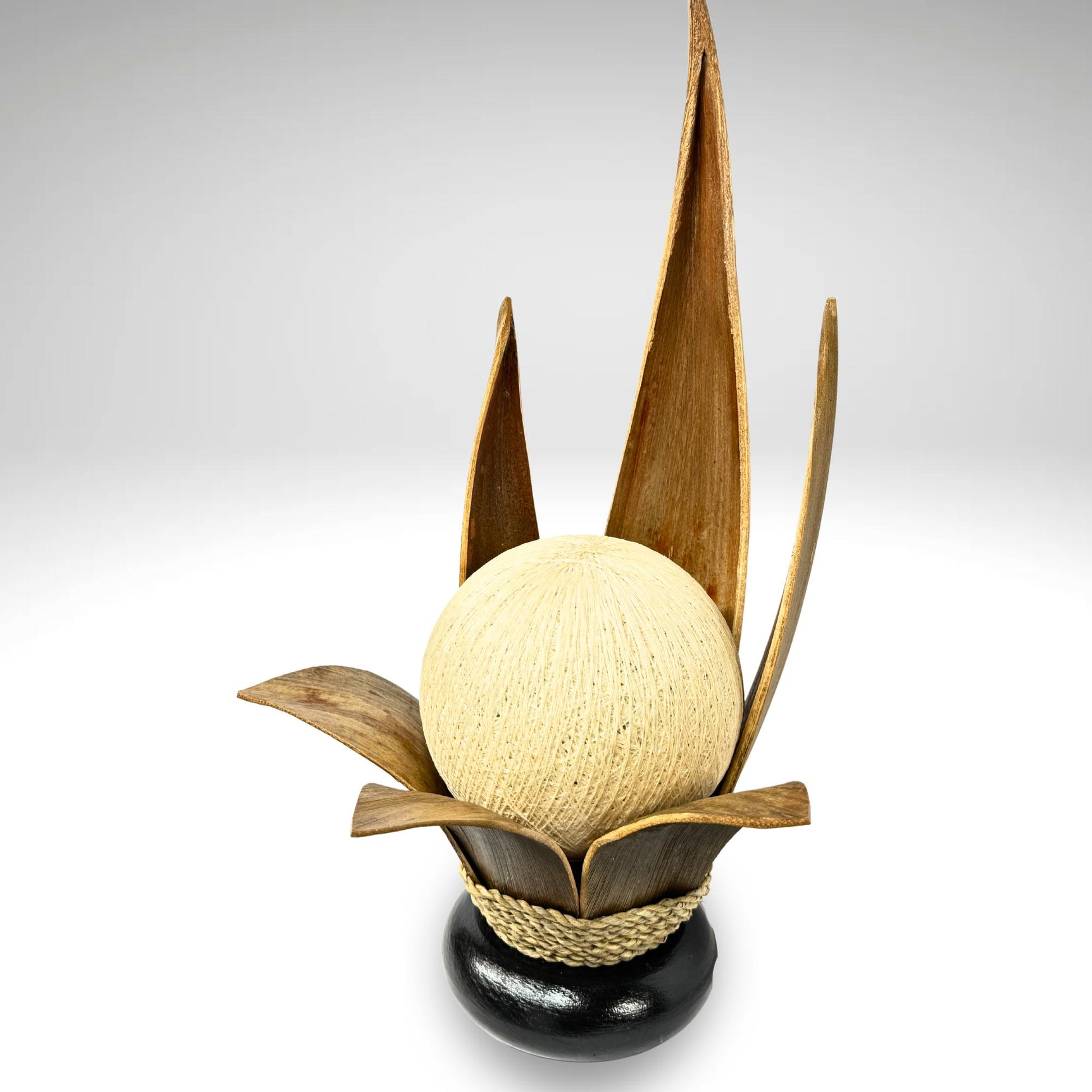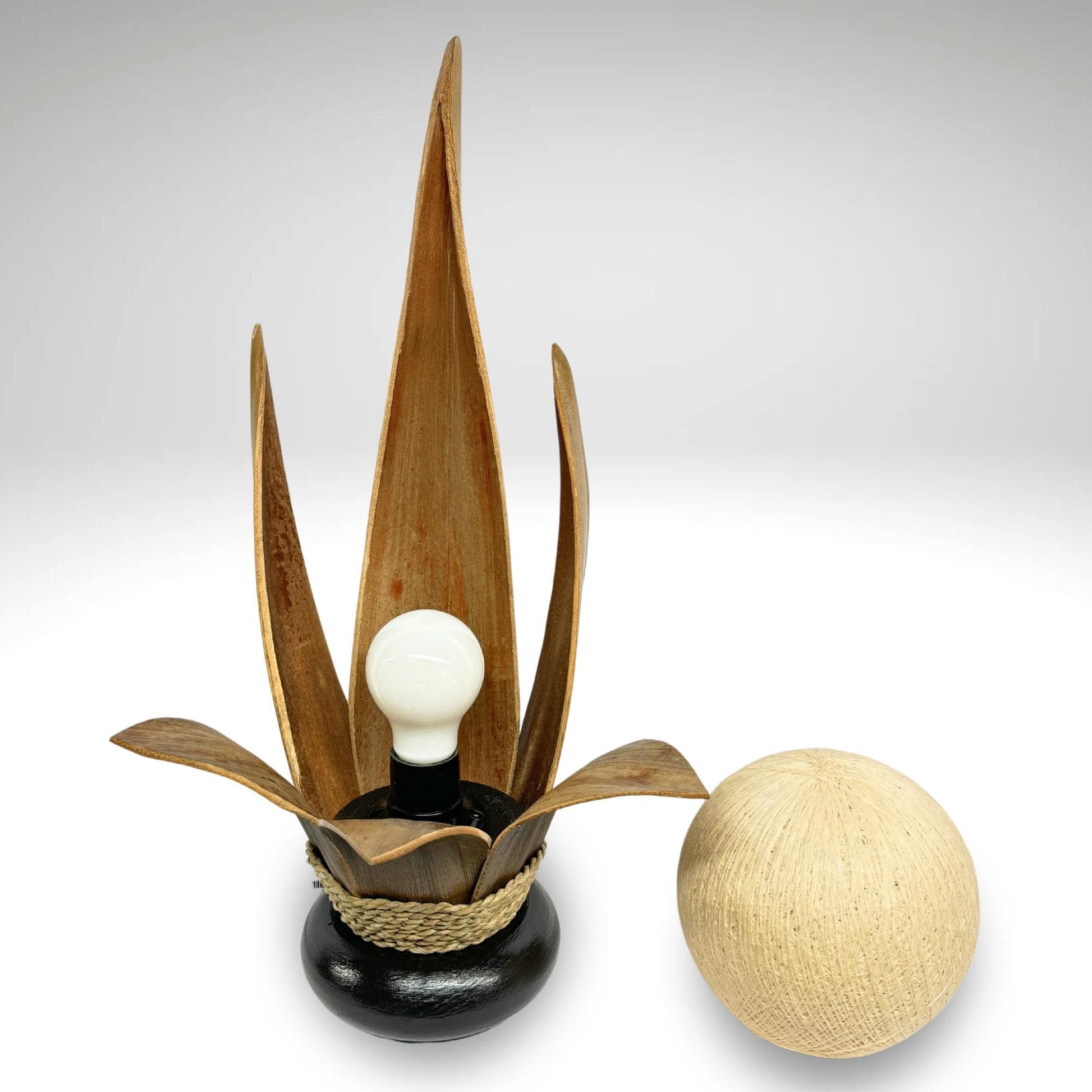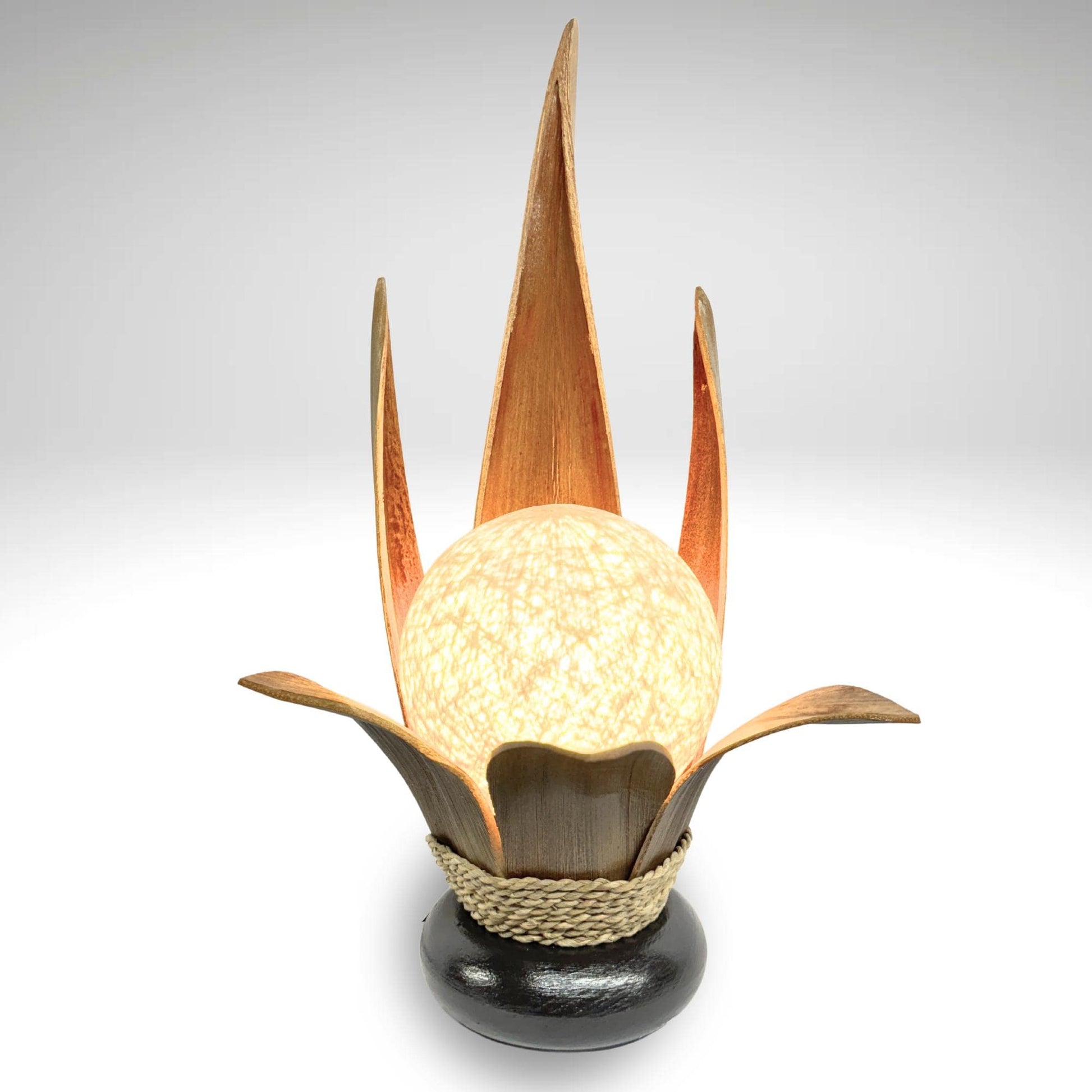 Palm Frond Lotus Accent Lamp, crafted from the upcycled sheaths that incase of palm fronds before they unfurl. The sheaths are carefully harvested and dyed with natural dyes in the shade of tobacco. Then carefully formed into this Lotus Flower shape. It is then mounted upon a wooden base and wired with a lamp socket and cord-set. The globe shaped shade is formed from cotton fiber wound into a sphere, which sits over the light bulb to softly diffuse the light. Creates a beautiful warm ambiance that will add a glowing warmth to your funky eclectic decor.