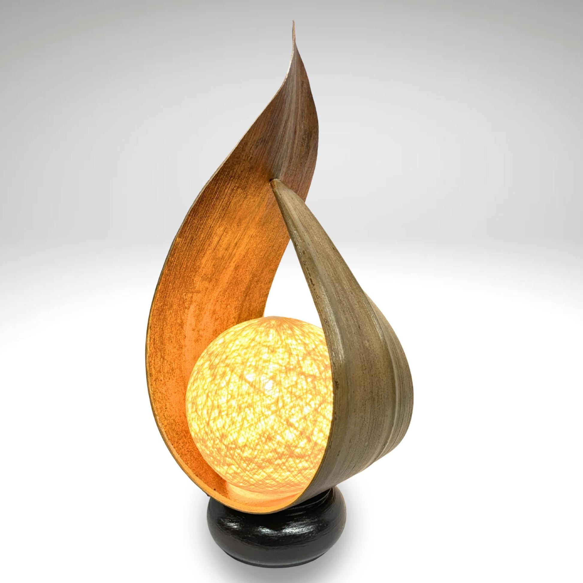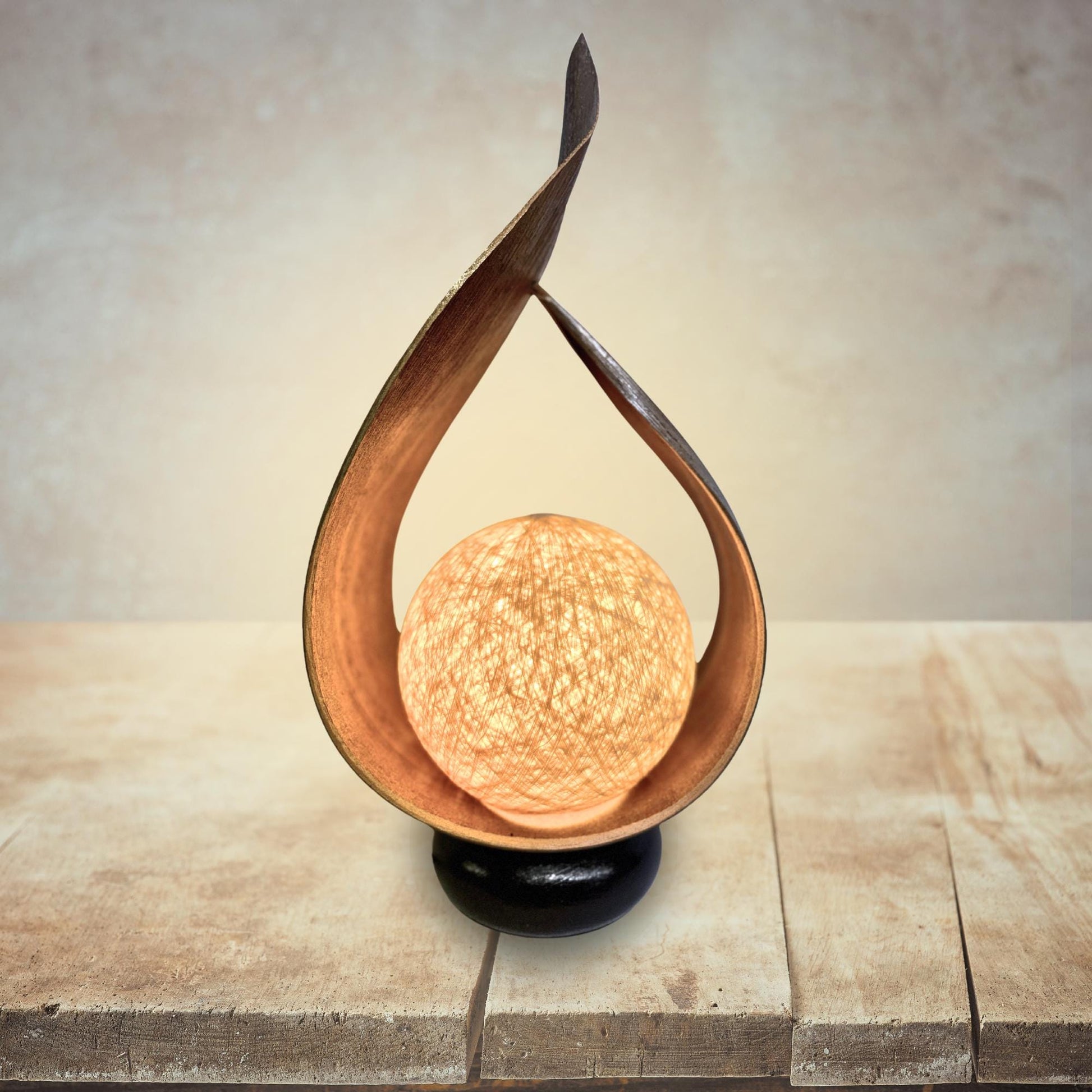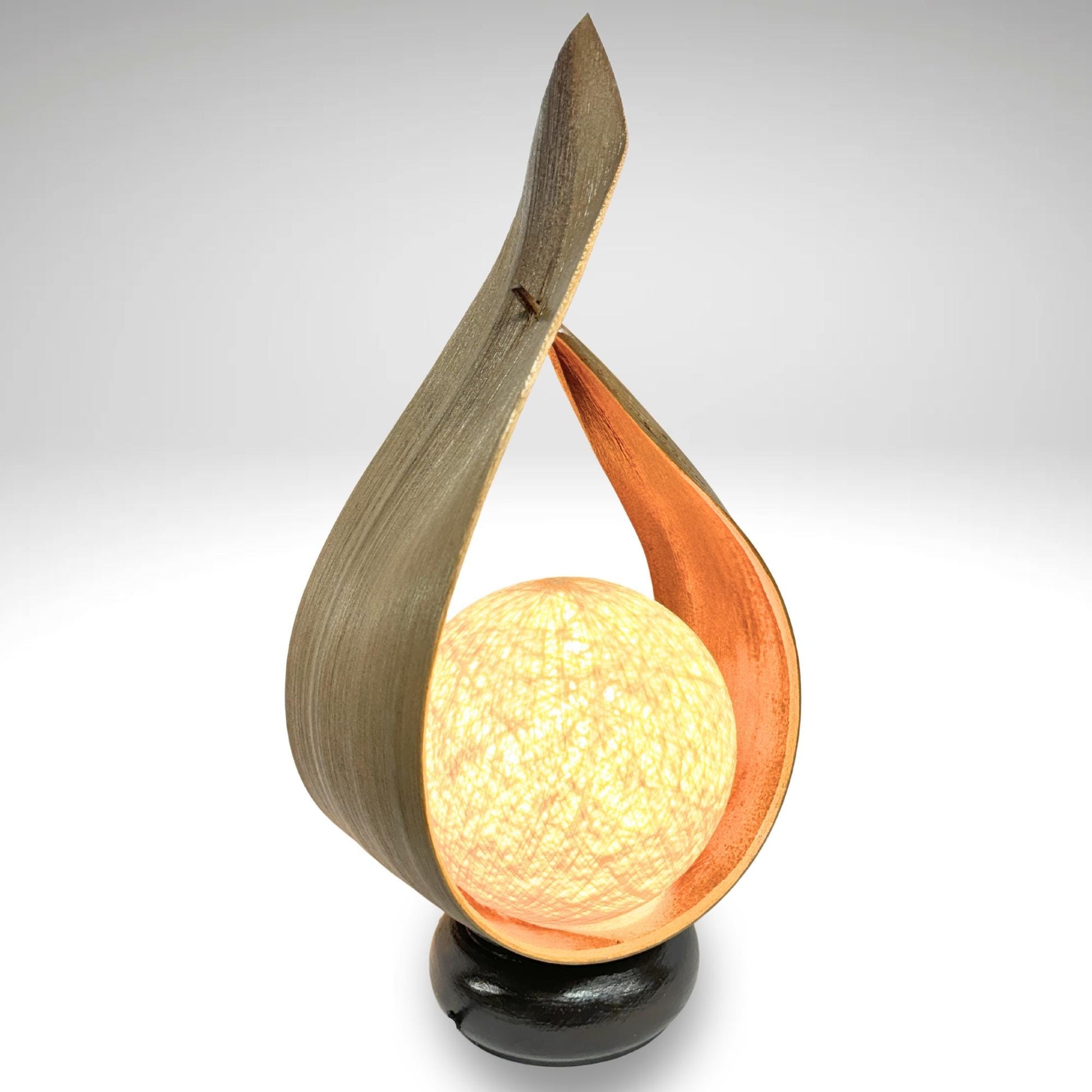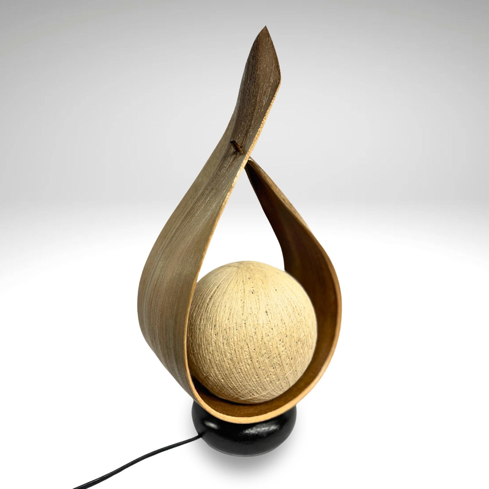 Palm Frond Teardrop Accent Lamp, crafted from the upcycled sheaths that incase of palm fronds before they unfurl. The sheaths are carefully harvested and dyed with natural dyes in the shade of tobacco. Then carefully formed into this teardrop shape. It is then mounted upon a wooden base and wired with a lamp socket and cord-set. The globe shaped shade is formed from cotton fiber wound into a sphere, which sits over the light bulb to softly diffuse the light. Creates a beautiful warm ambiance that will add a glowing warmth to your funky eclectic decor.