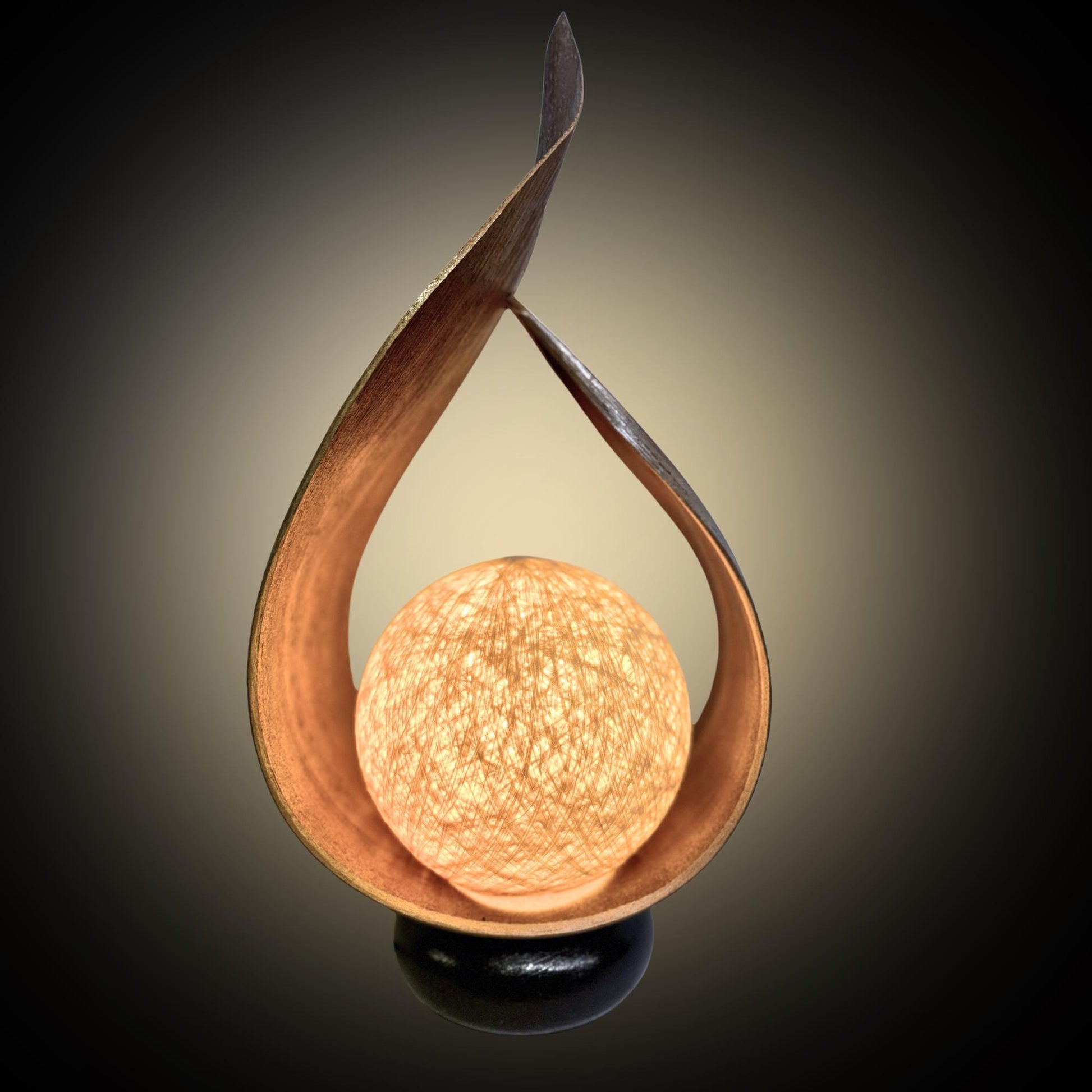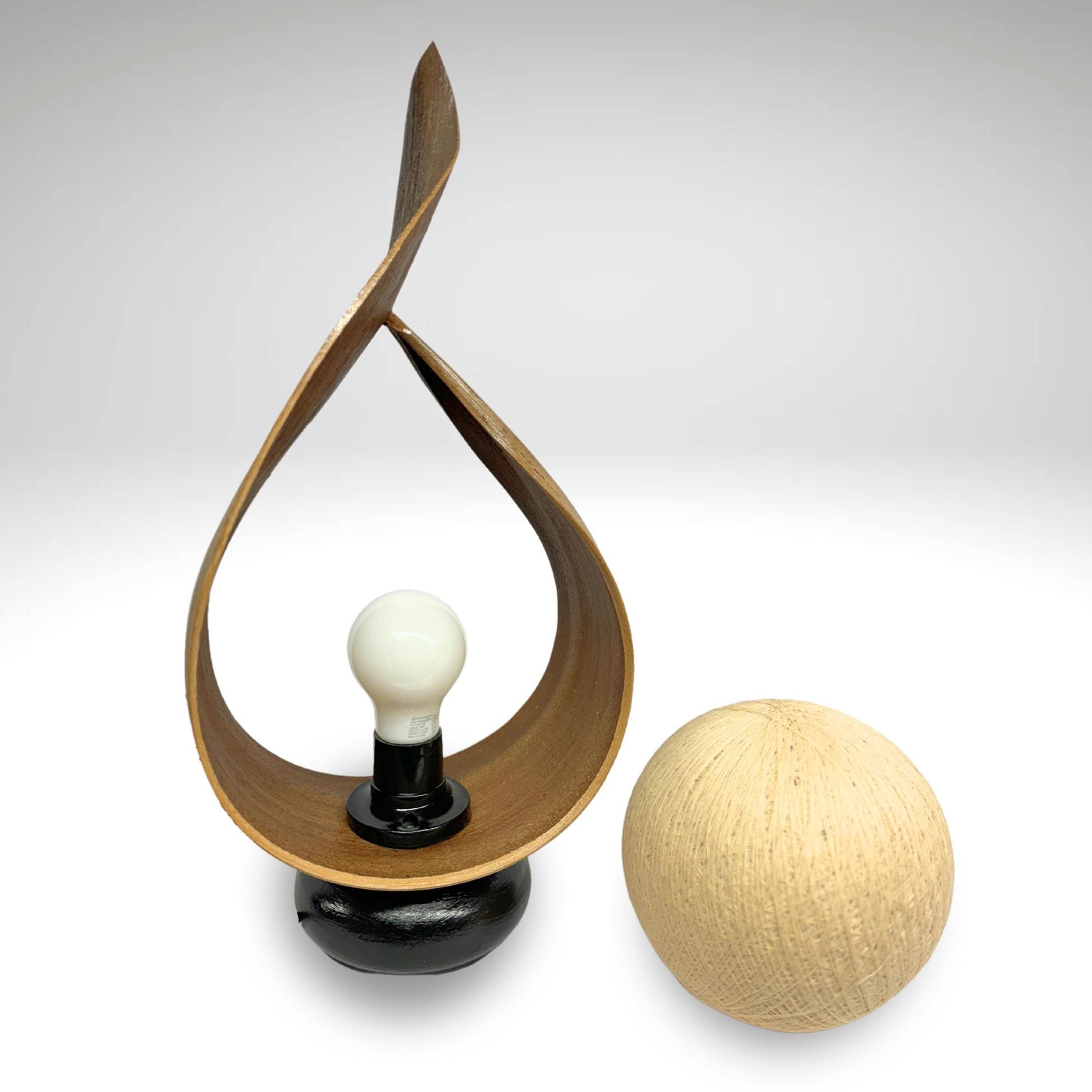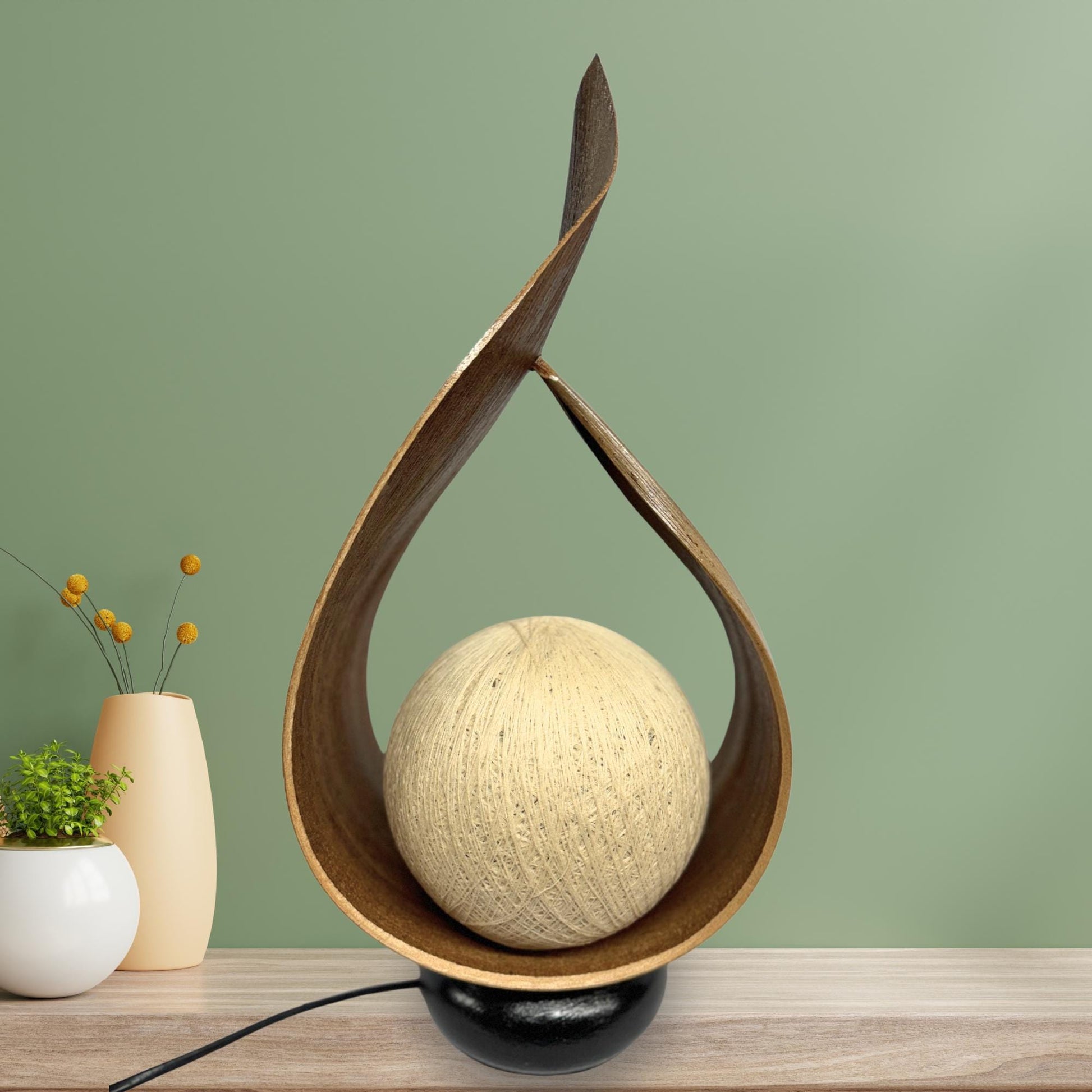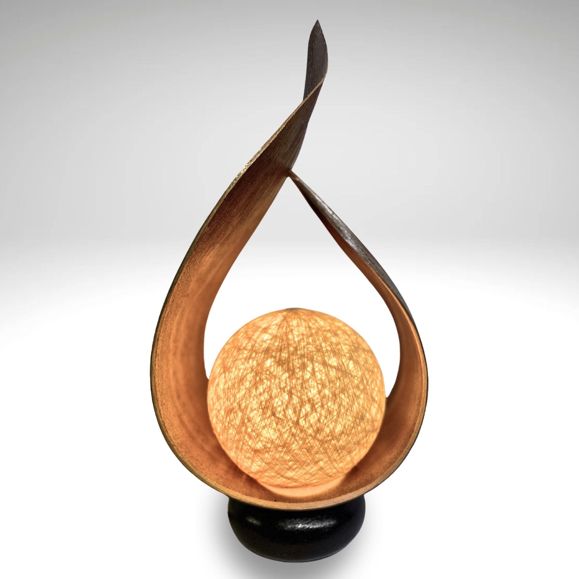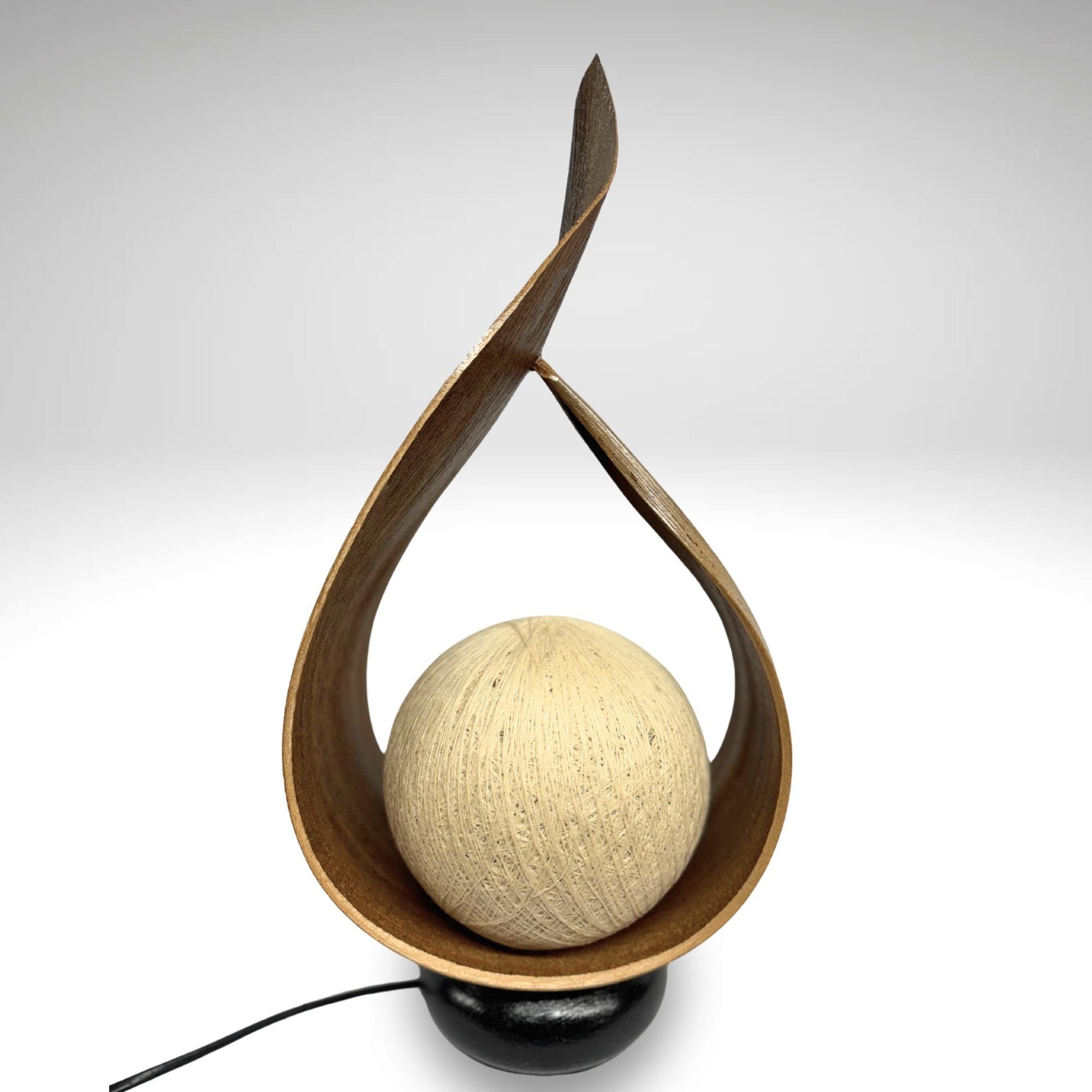 Palm Frond Teardrop Accent Lamp, crafted from the upcycled sheaths that incase of palm fronds before they unfurl. The sheaths are carefully harvested and dyed with natural dyes in the shade of tobacco. Then carefully formed into this teardrop shape. It is then mounted upon a wooden base and wired with a lamp socket and cord-set. The globe shaped shade is formed from cotton fiber wound into a sphere, which sits over the light bulb to softly diffuse the light. Creates a beautiful warm ambiance that will add a glowing warmth to your funky eclectic decor.