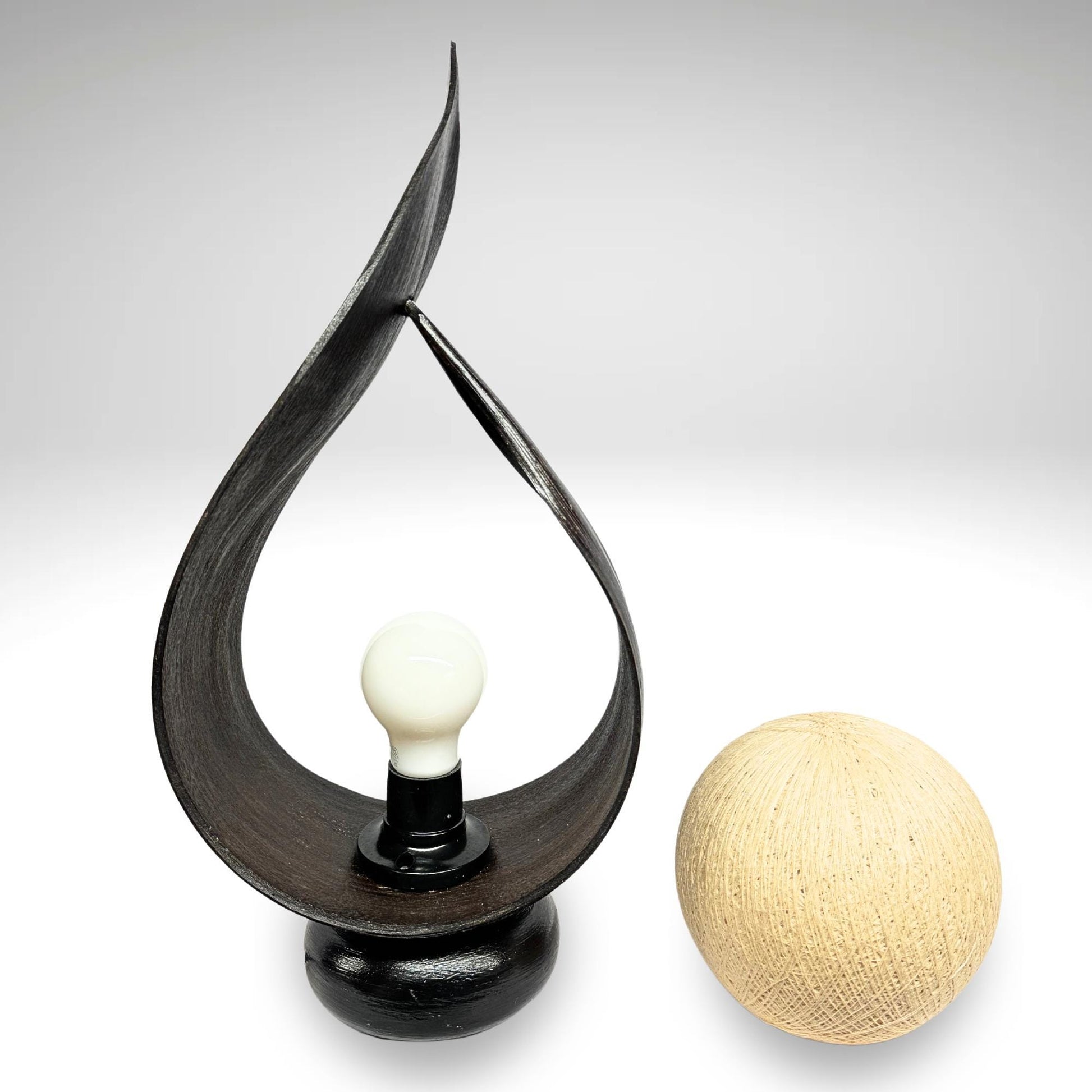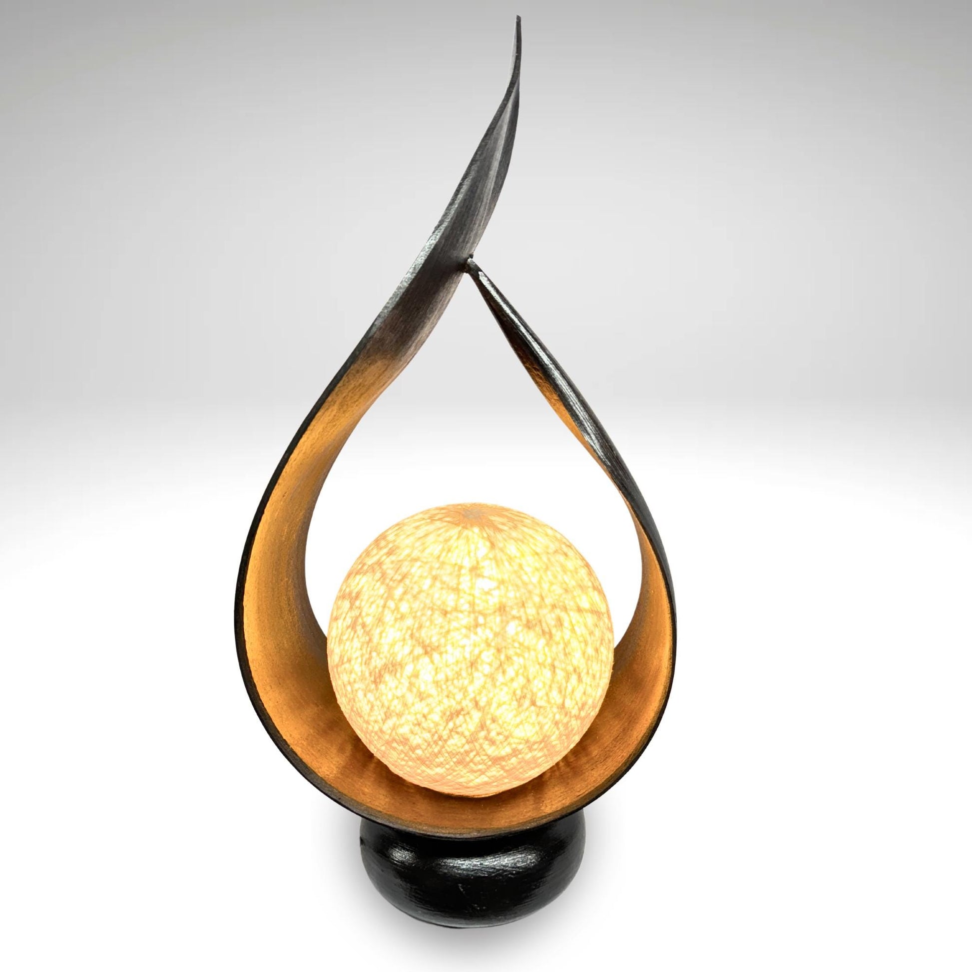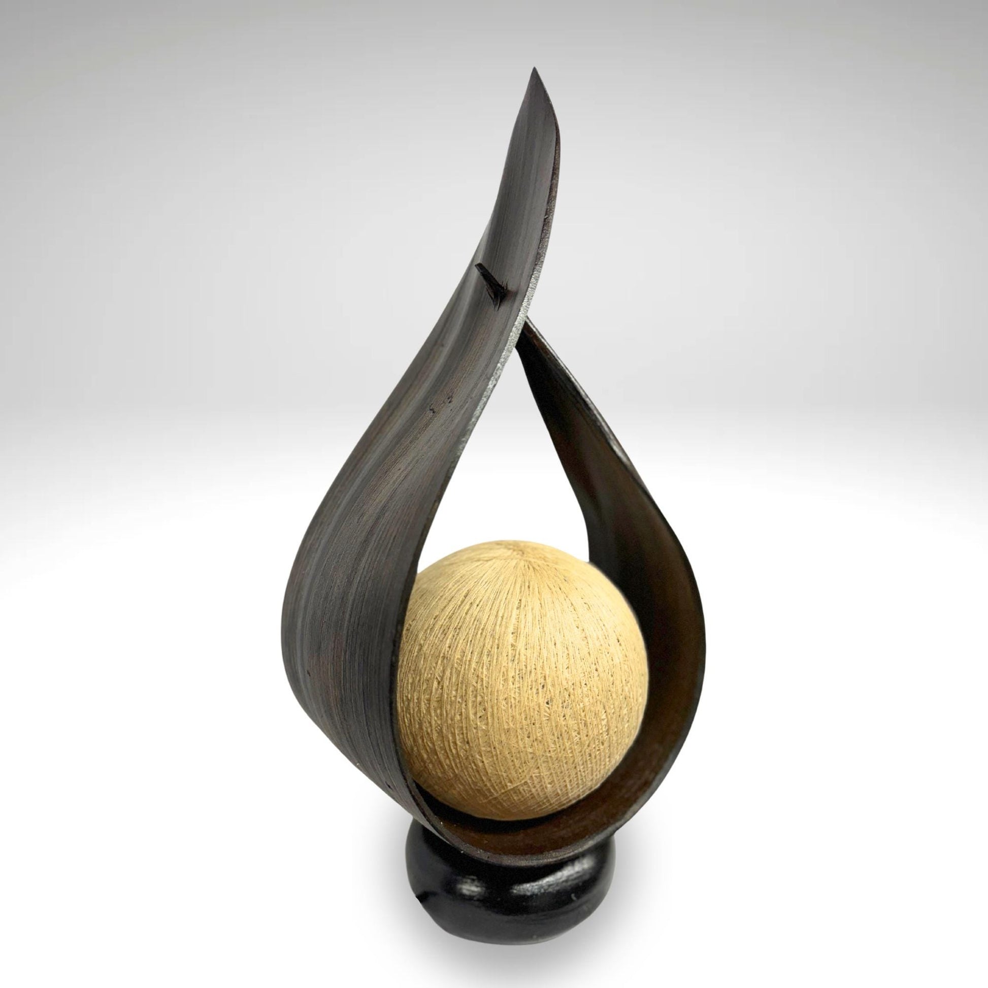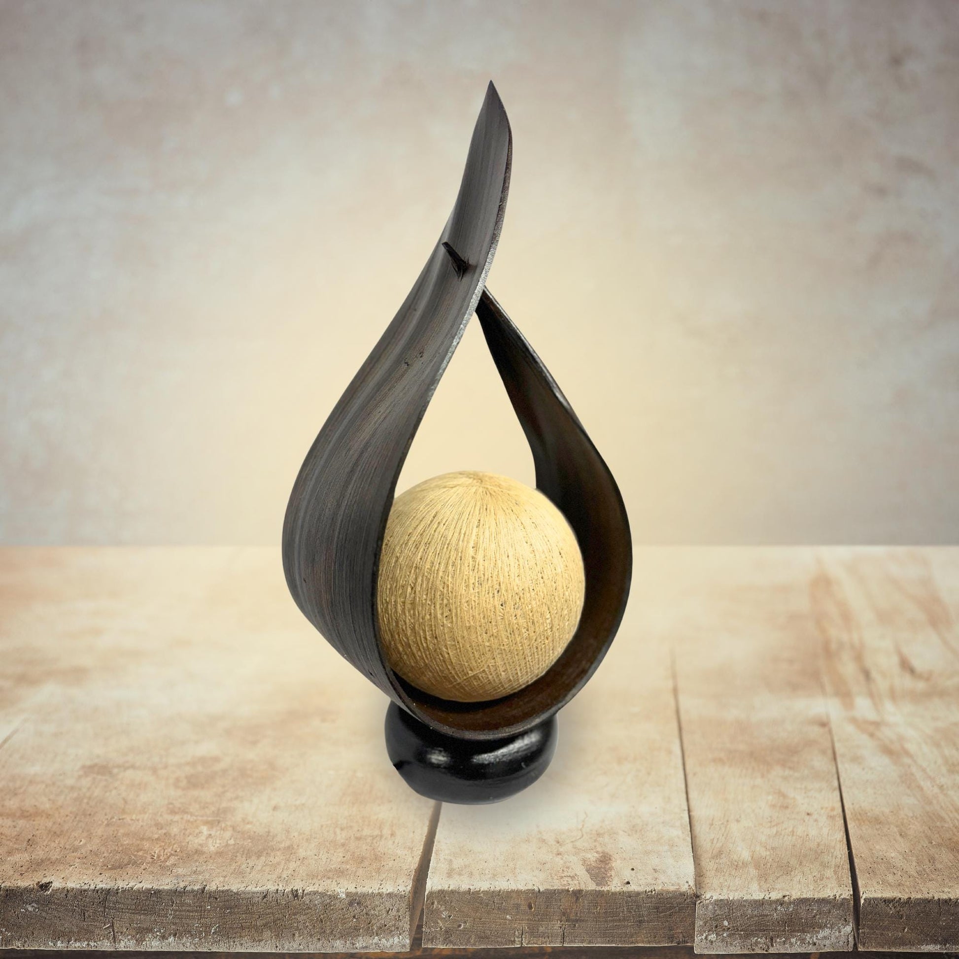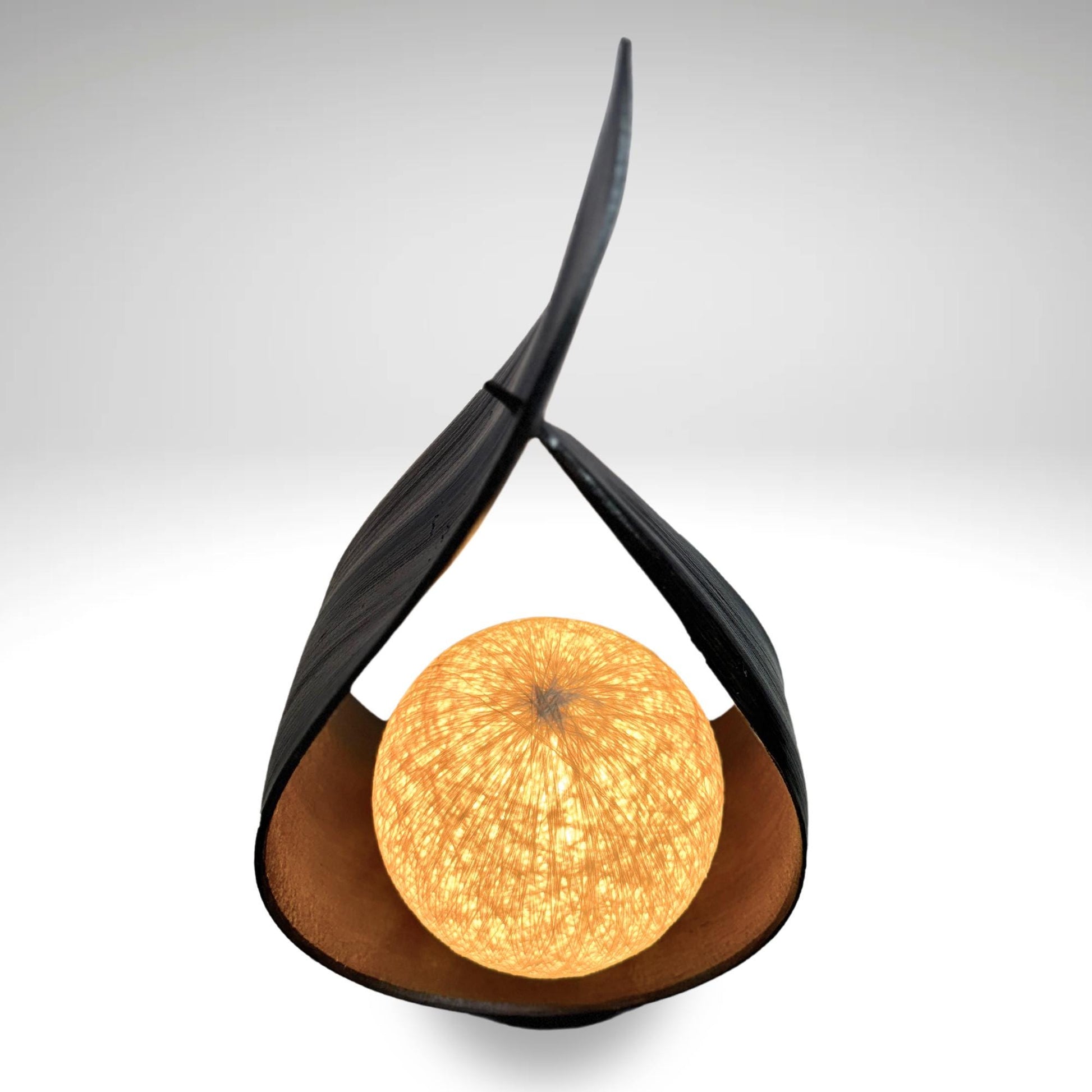 Palm Frond Teardrop Accent Lamp, crafted from the upcycled sheaths that incase of palm fronds before they unfurl. The sheaths are carefully harvested and dyed with natural dyes in the shade of black Coffee. Then carefully formed into this teardrop shape. It is then mounted upon a wooden base and wired with a lamp socket and cord-set. The globe shaped shade is formed from cotton fiber wound into a sphere, which sits over the light bulb to softly diffuse the light. Creates a beautiful warm ambiance that will add a glowing warmth to your funky eclectic decor.