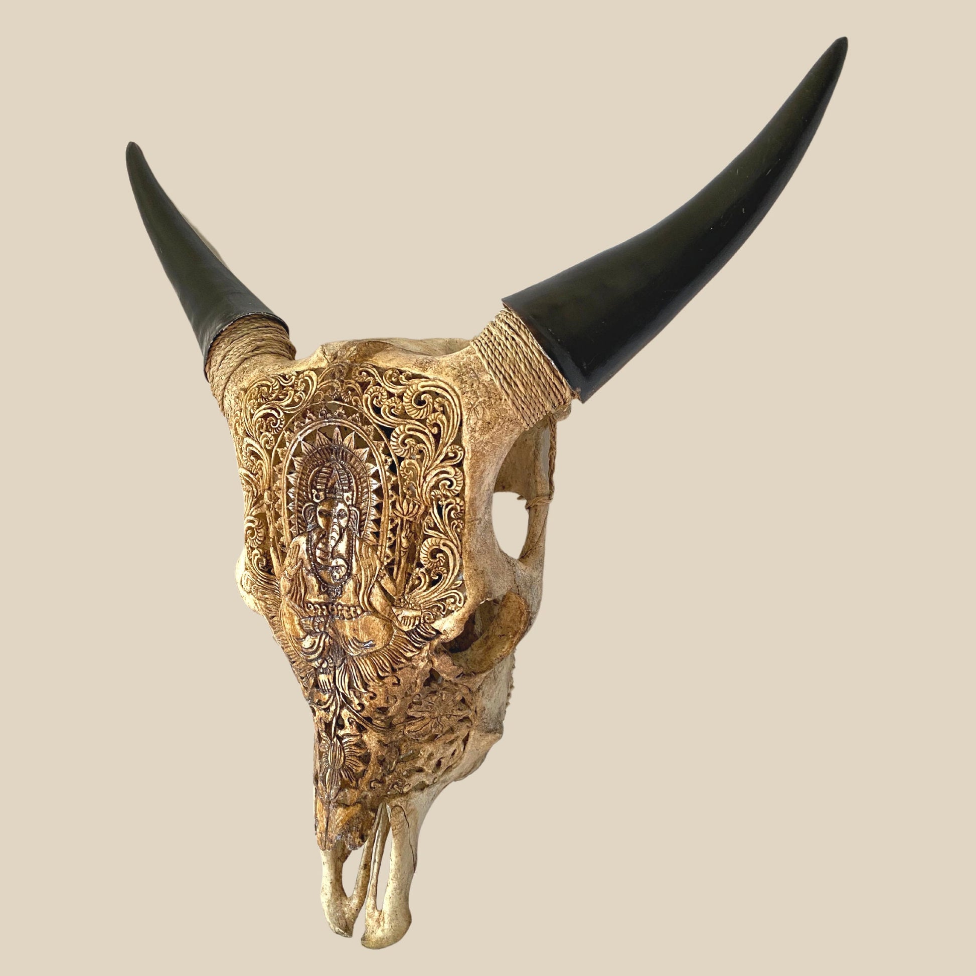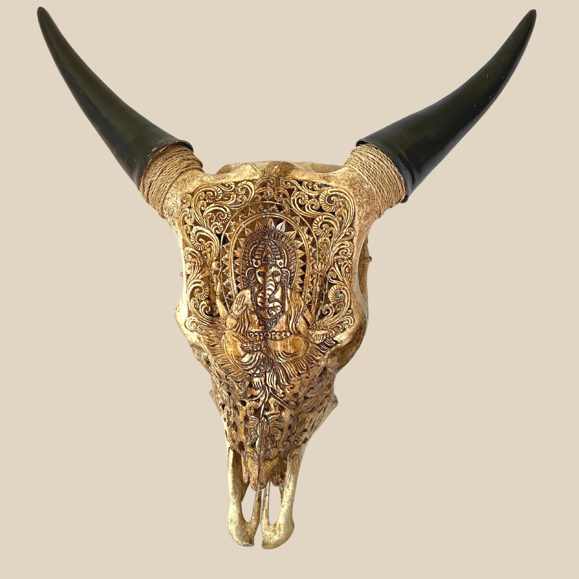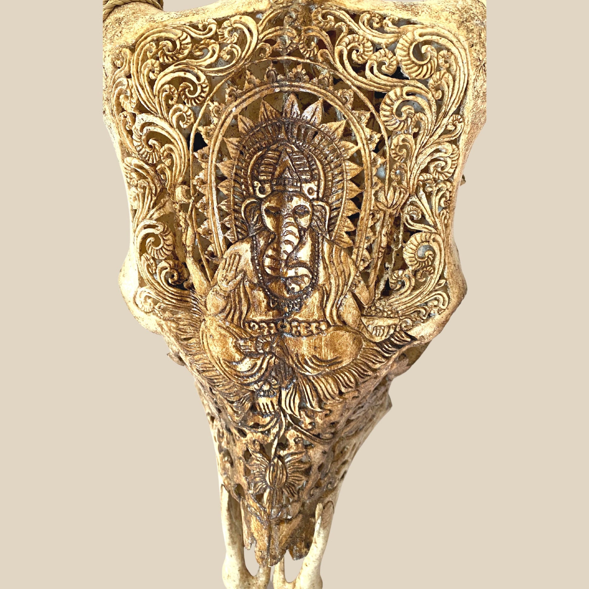 Genuine Steer skull with the intricate Carving of the image of Ganesha ; completely handcrafted in Bali by Balinese Master Carvers. It takes 2 to 3 days of drawing and then carving to craft these skulls into a true work of original Balinese art.