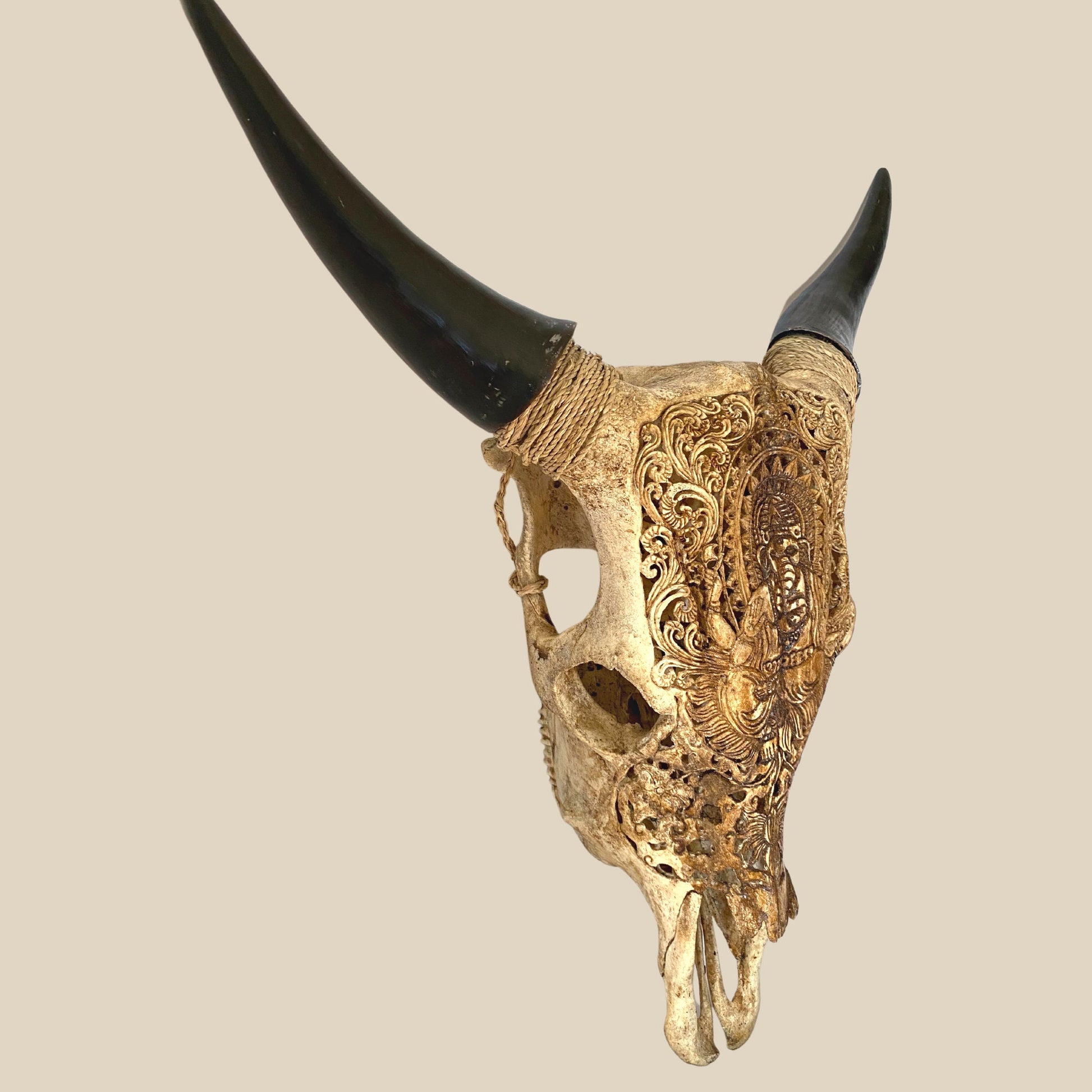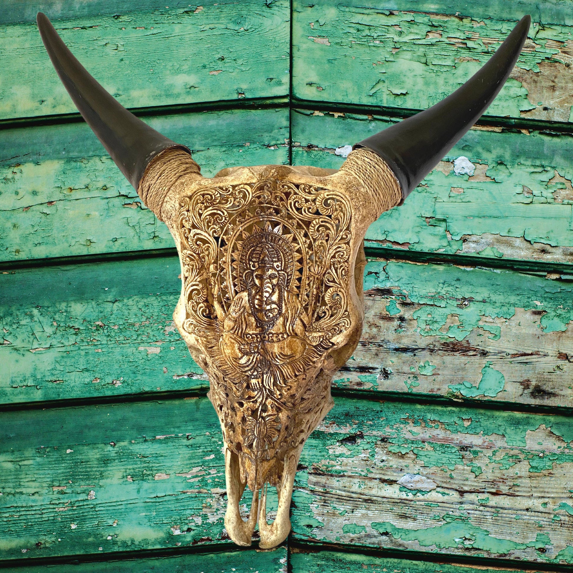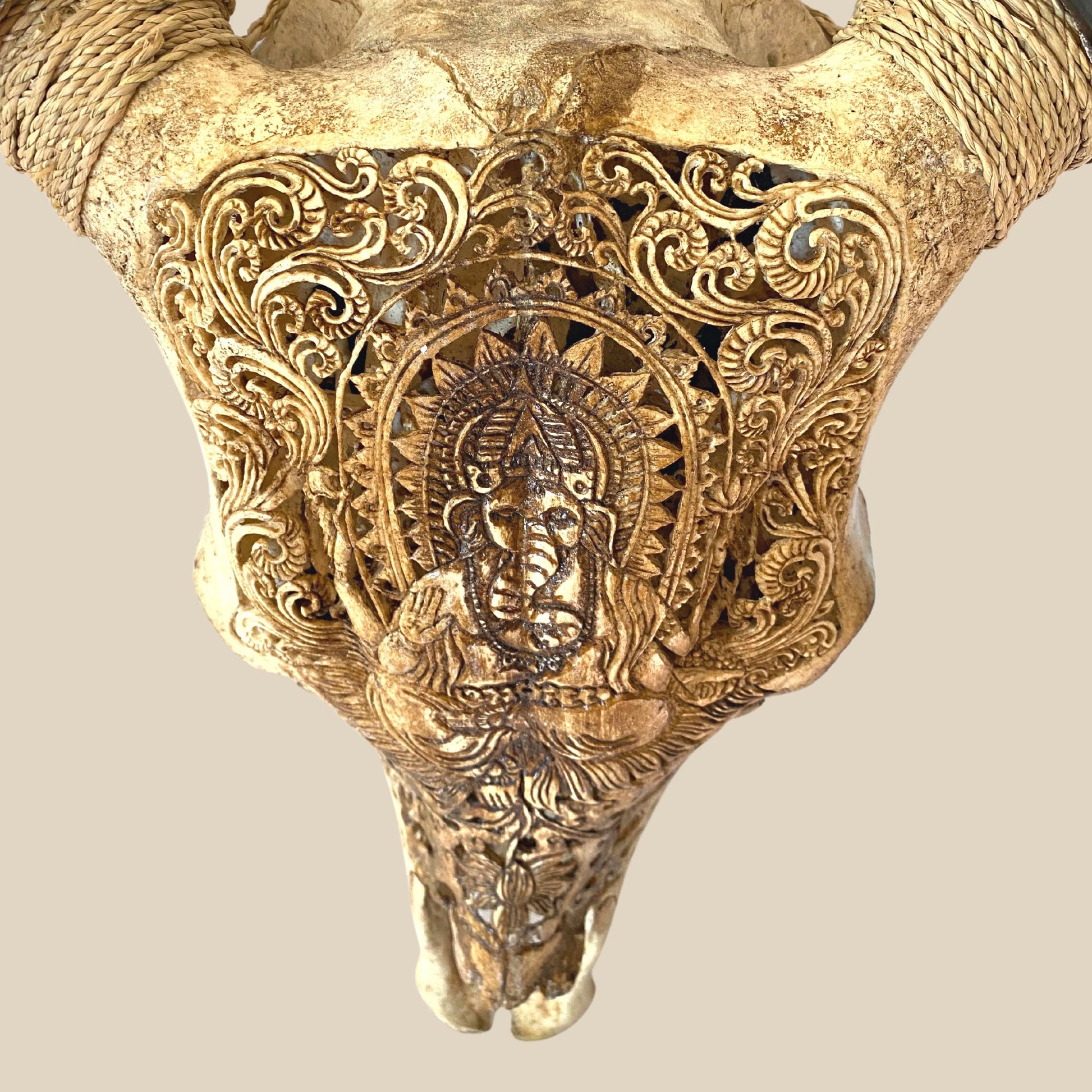 Genuine Steer skull with the intricate Carving of the image of Ganesha ; completely handcrafted in Bali by Balinese Master Carvers. It takes 2 to 3 days of drawing and then carving to craft these skulls into a true work of original Balinese art.
