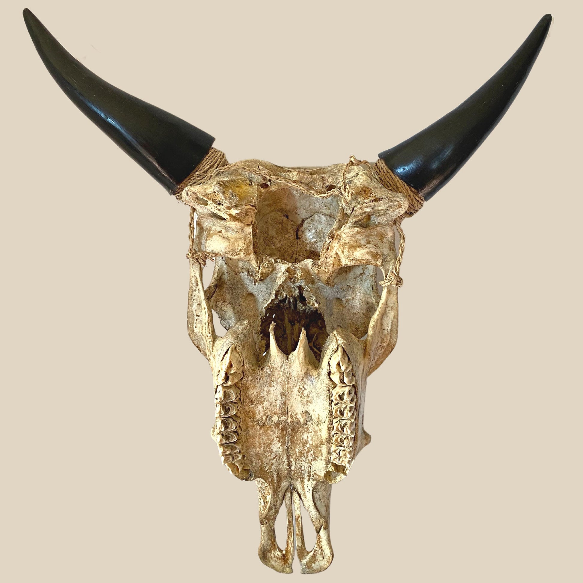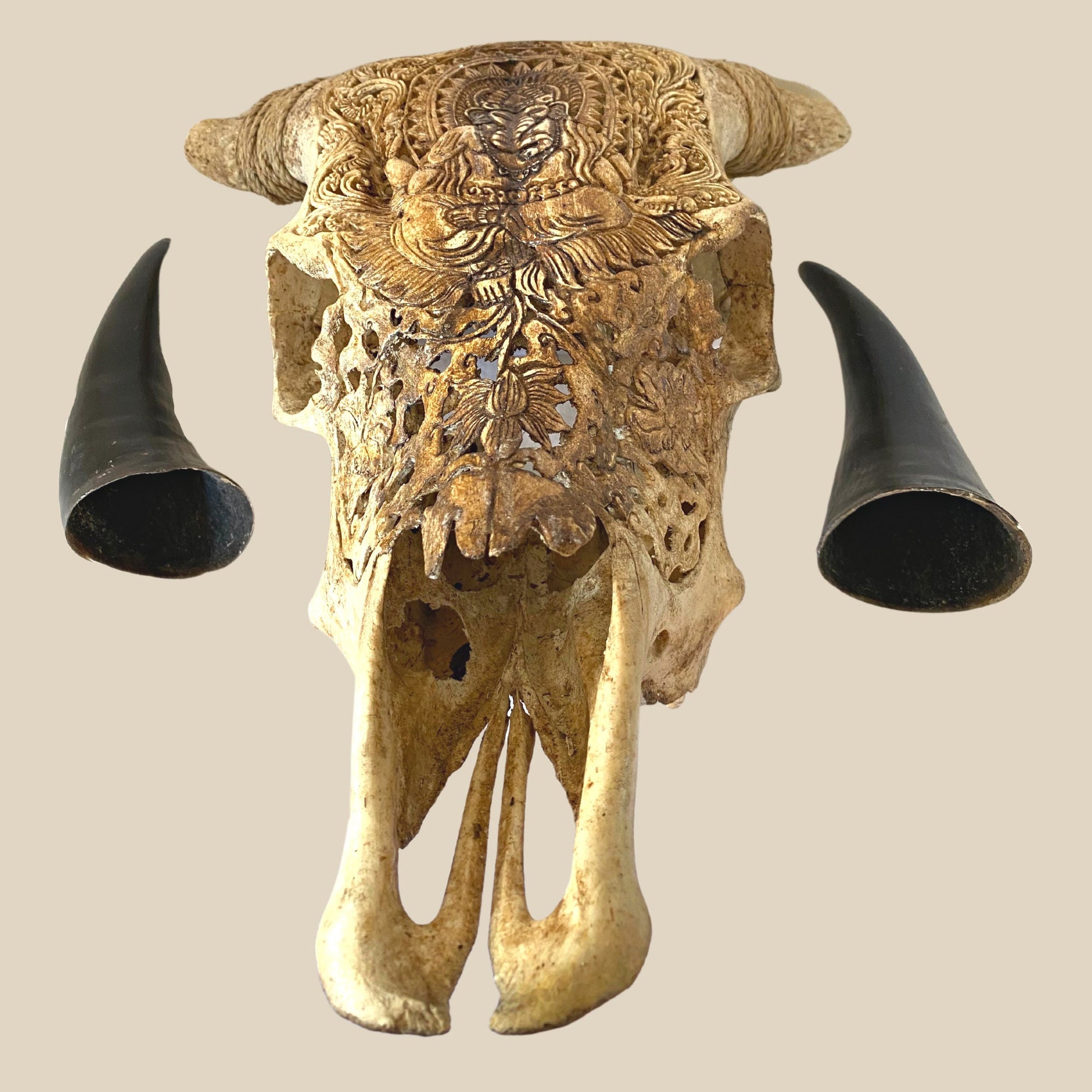 Bali Ganesha HAND CARVED Cow Steer SKULL horn Taxidermy Bull Wall Mount Balinese Bone Carving Art Eclectic Boho Decor