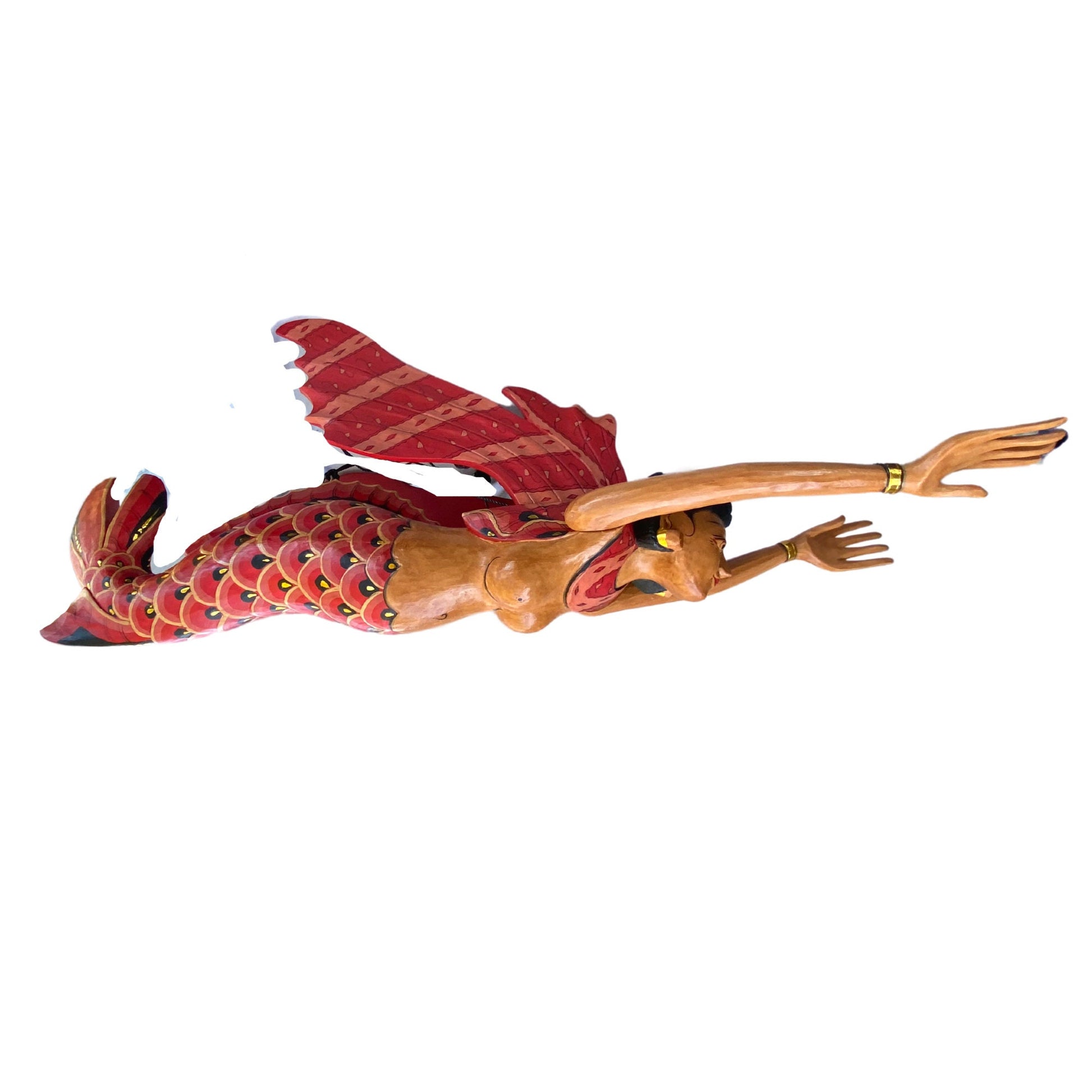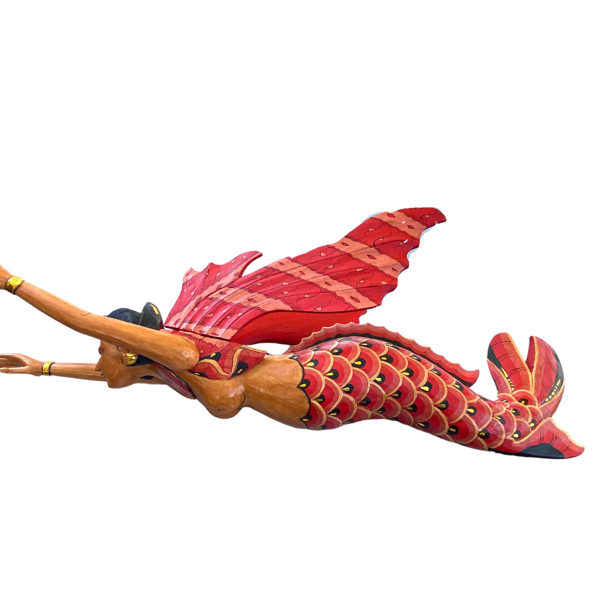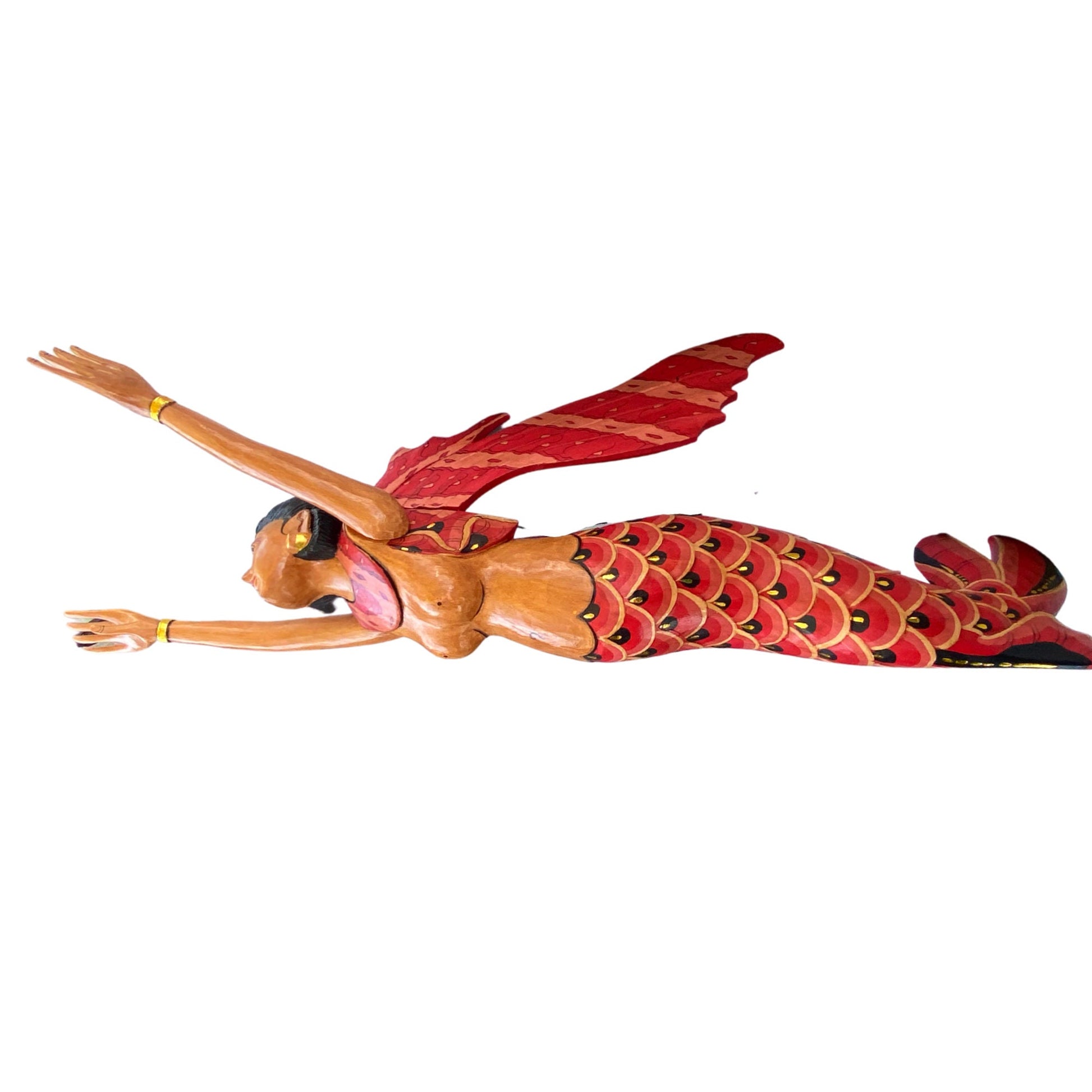 Bali Winged Flying Mermaid Mobile Spiritchaser cradle guardian Carved wood Balinese wood carving art Red 37"