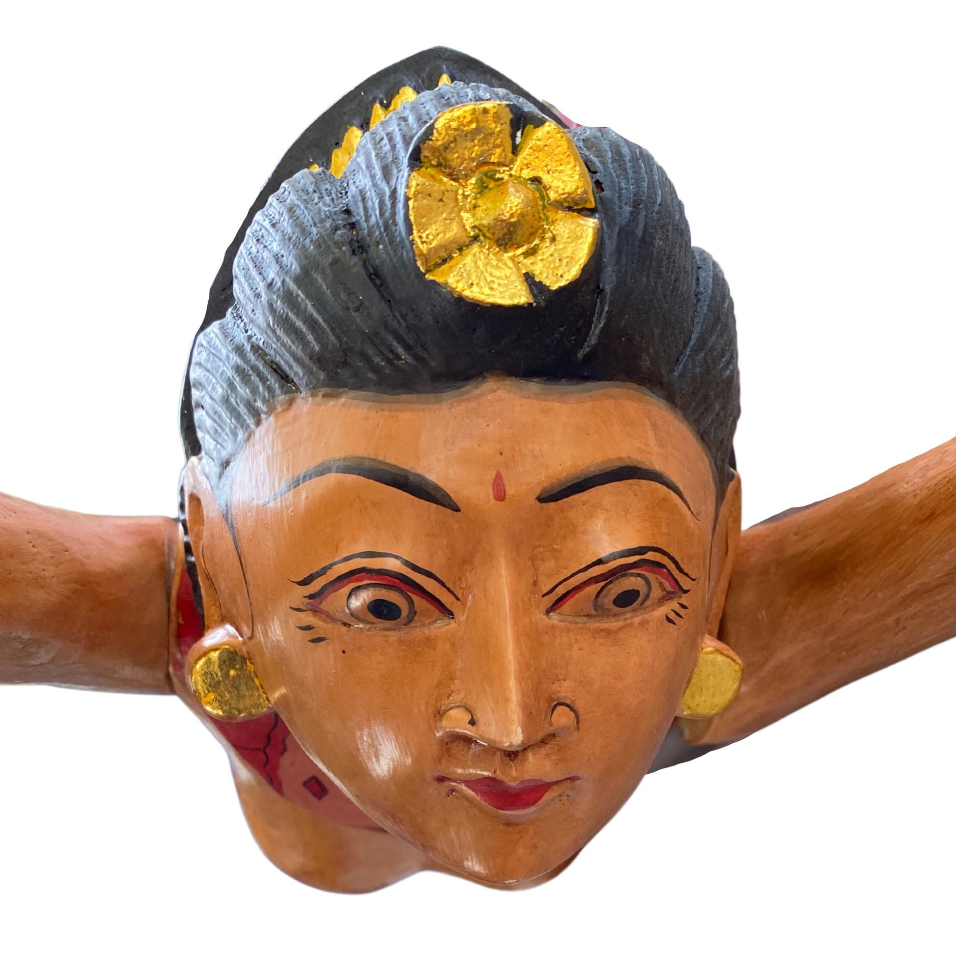 The Flying Winged Spirit Guardians (also sometimes called "Cradle Guardians") myth goes all the way back ancient Majapahit Mythology, the roots of Balinese culture and art.These Guardian figures are still produced by Balinese artisans today for they have deep cultural & spiritual significance. Typically these carvings have been used in temples or homes since ancient times to ward off evil spirits. They are always hung in a high spot, or if a statue placed on a beam or shelf looking down towards a door or window. Many types may be found from flying angels (known as "Dewi" which means "Goddess" in Balinese), animals or strange hybrids, such as head of a horse head & tail of a fish, or "Gajamina" head of an elephant & tail of a fish. It is believed that a Flying Guardian placed in ones home or sacred space will drive away evil spirits and protect the premises from harm.