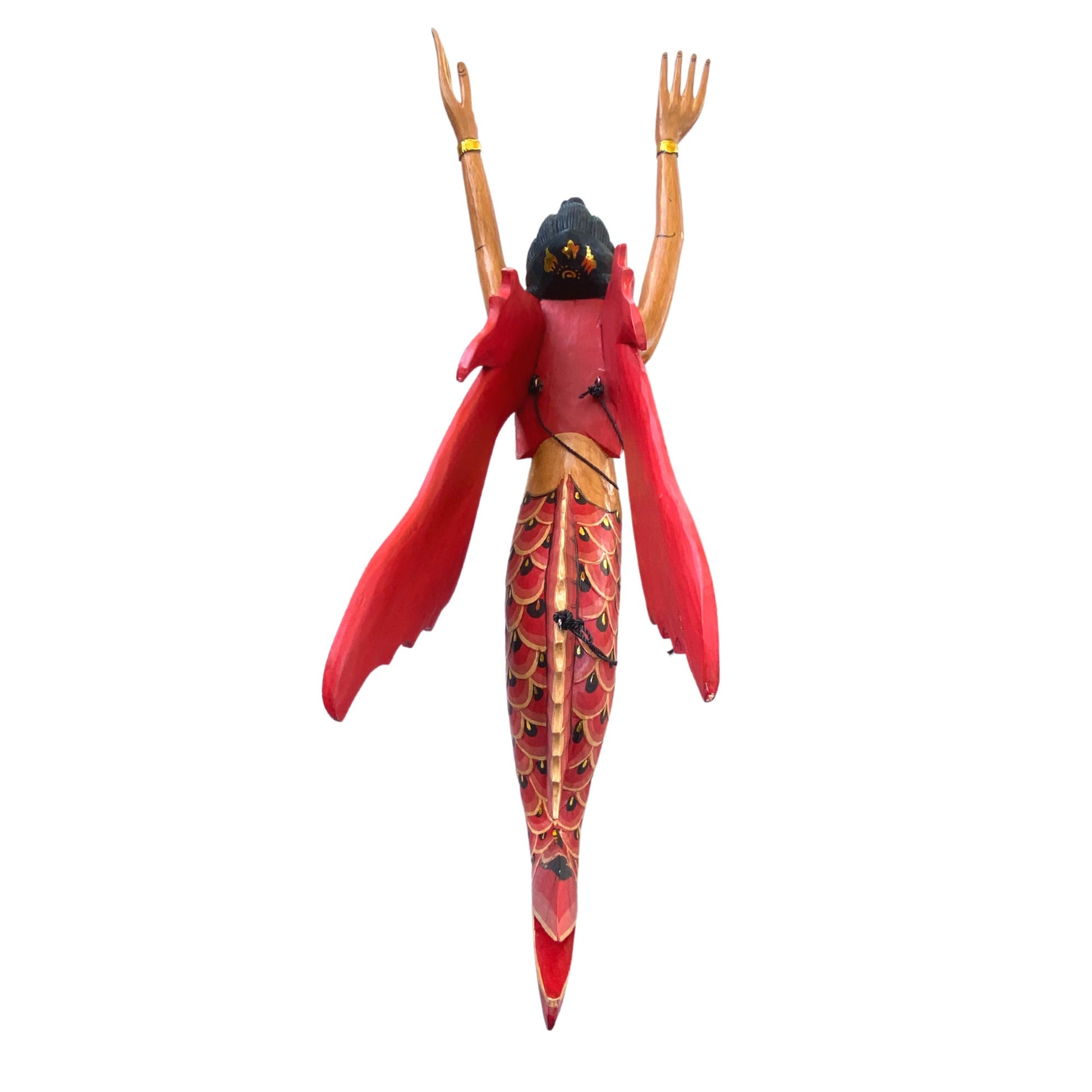 Hand Carved Winged Mermaid Mobile - Goddess Putri Duyung is crafted in Bali by a talented family of artisans. Albesia wood, a sustainable fast growing wood is hand carved & hand painted with acrylic paints in vibrant shades red & with highlights of goldleaf.