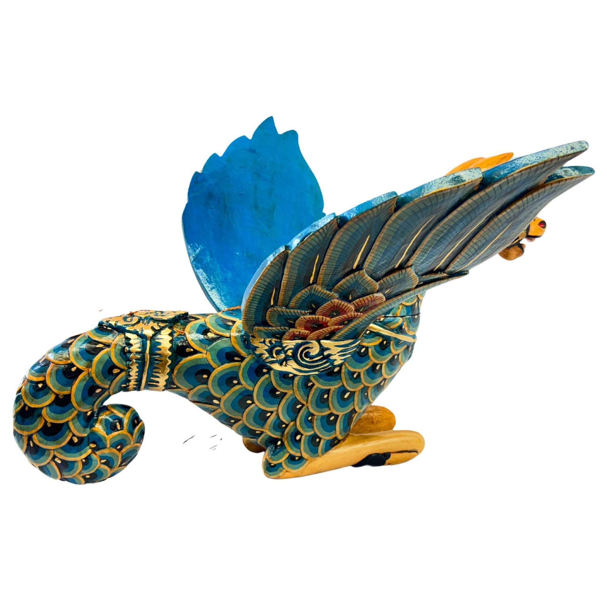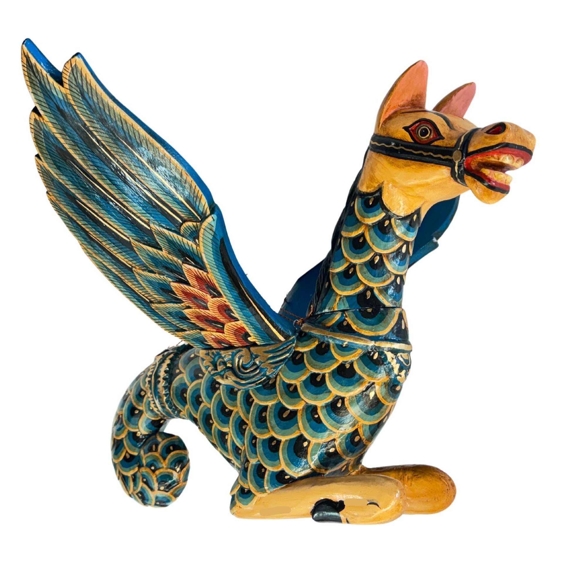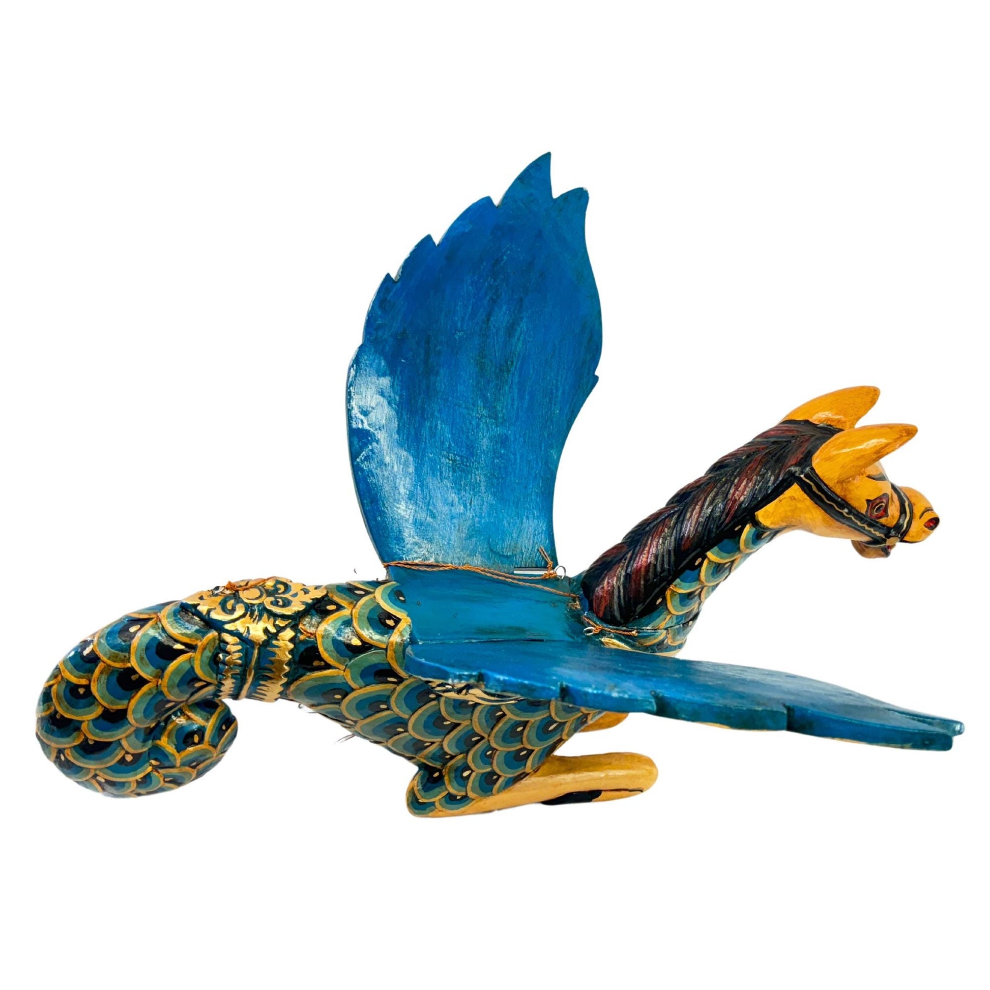 These Guardian figures are still produced by Balinese artisans today for they have deep cultural & spiritual significance. Typically these carvings have been used in temples or homes since ancient times to ward off evil spirits. They are always hung in a high spot, or if a statue placed on a beam or shelf looking down towards a door or window. Many types may be found from flying angels (known as "Dewi" which means "Goddess" in Balinese), animals or strange hybrids, such as head of a horse head & tail of a fish, or "Gajamina" head of an elephant & tail of a fish. It is believed that a Flying Guardian placed in one's home or sacred space will drive away evil spirits and protect the premises from harm.