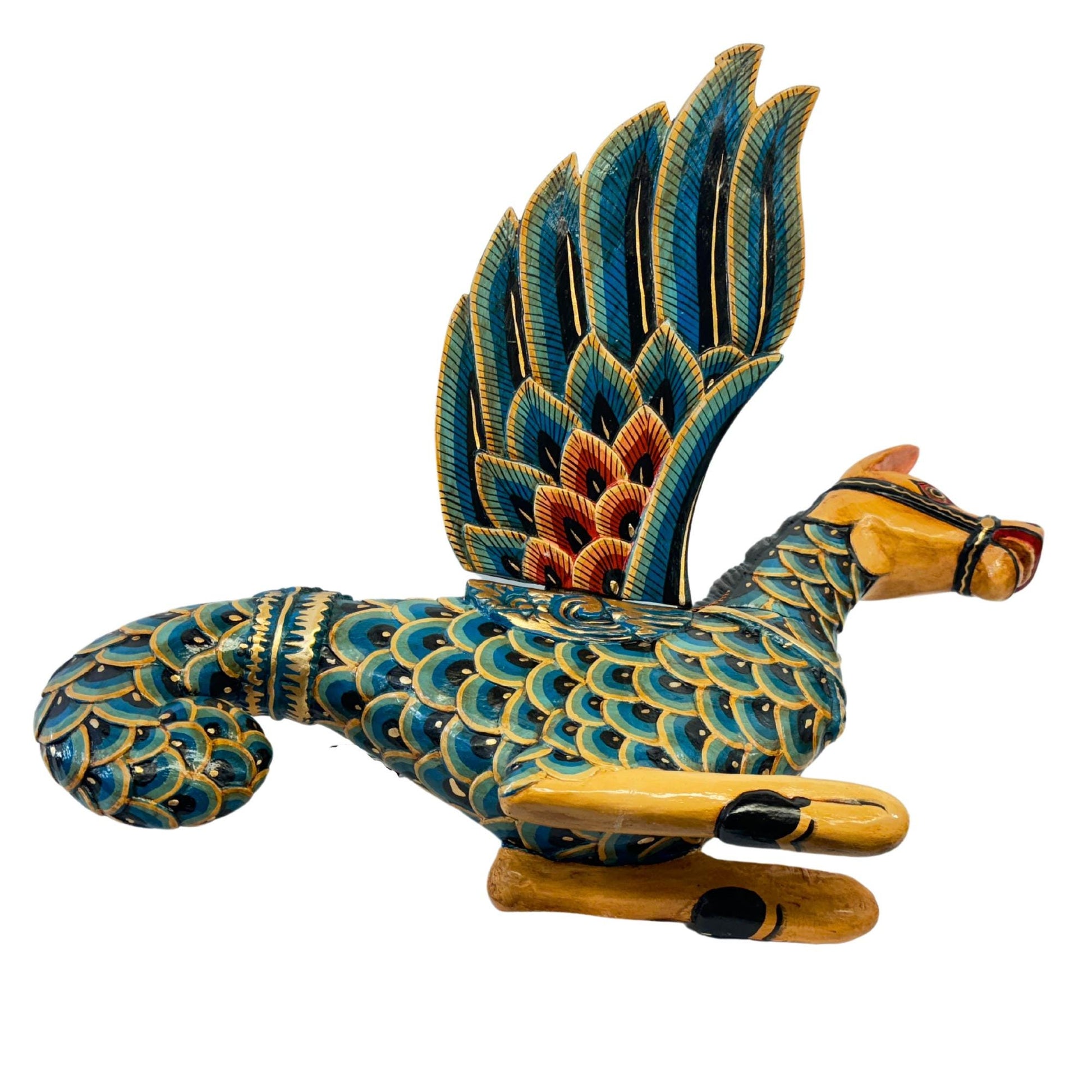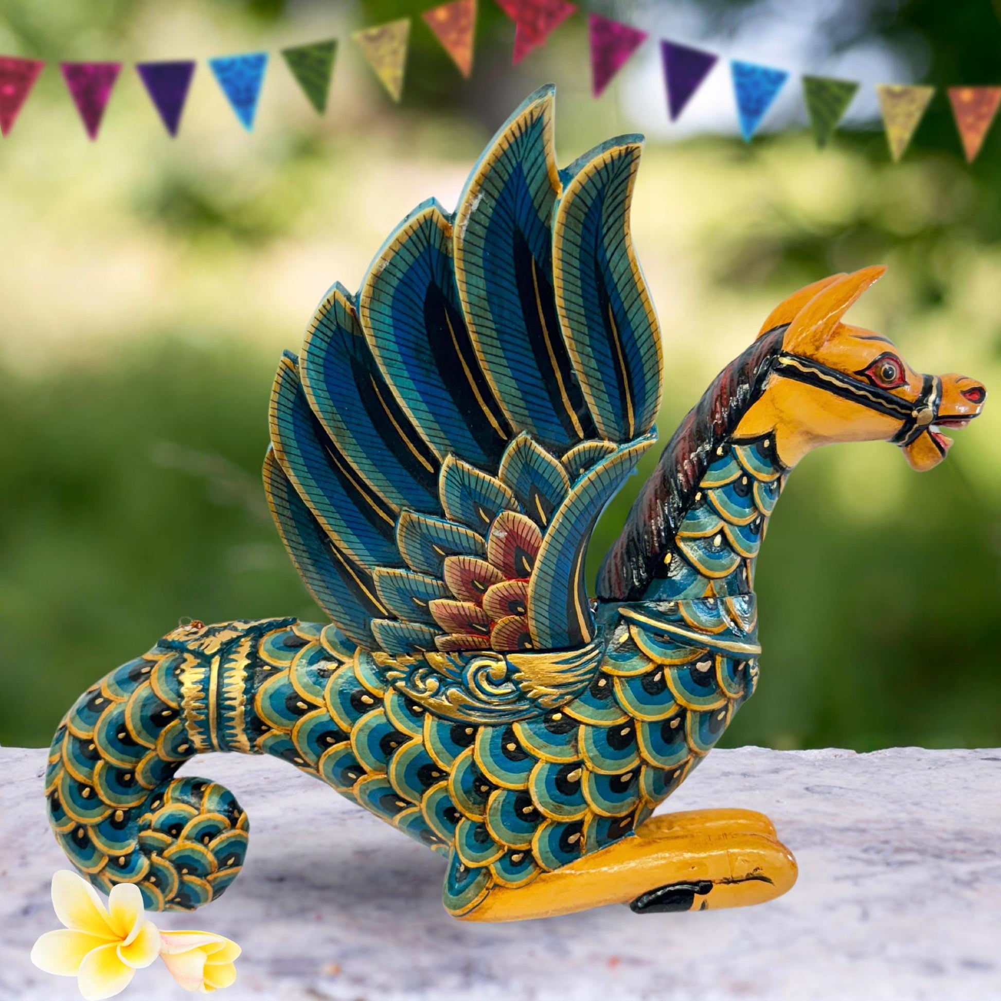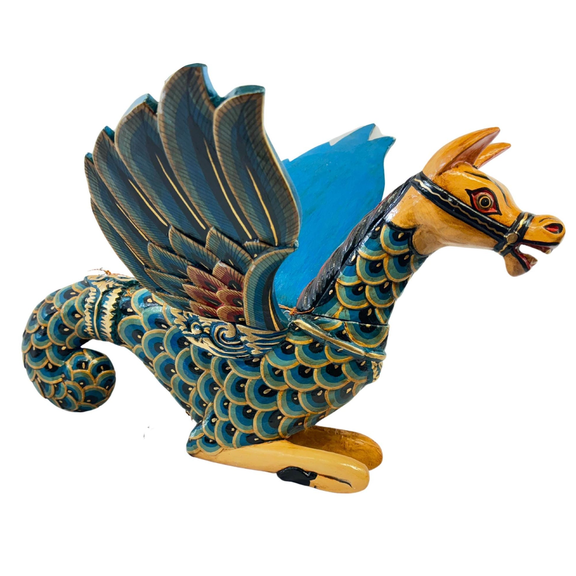 Whimsical Flying Winged Seahorse Mobile Is hand carved in Bali by talented village crafts people. Traditional mobiles like this are a combination of two animals to create a mythical beast known as a Makara. Traditionally, a makara is considered to be an aquatic mythical creature and are depicted as half mammal and half fish.