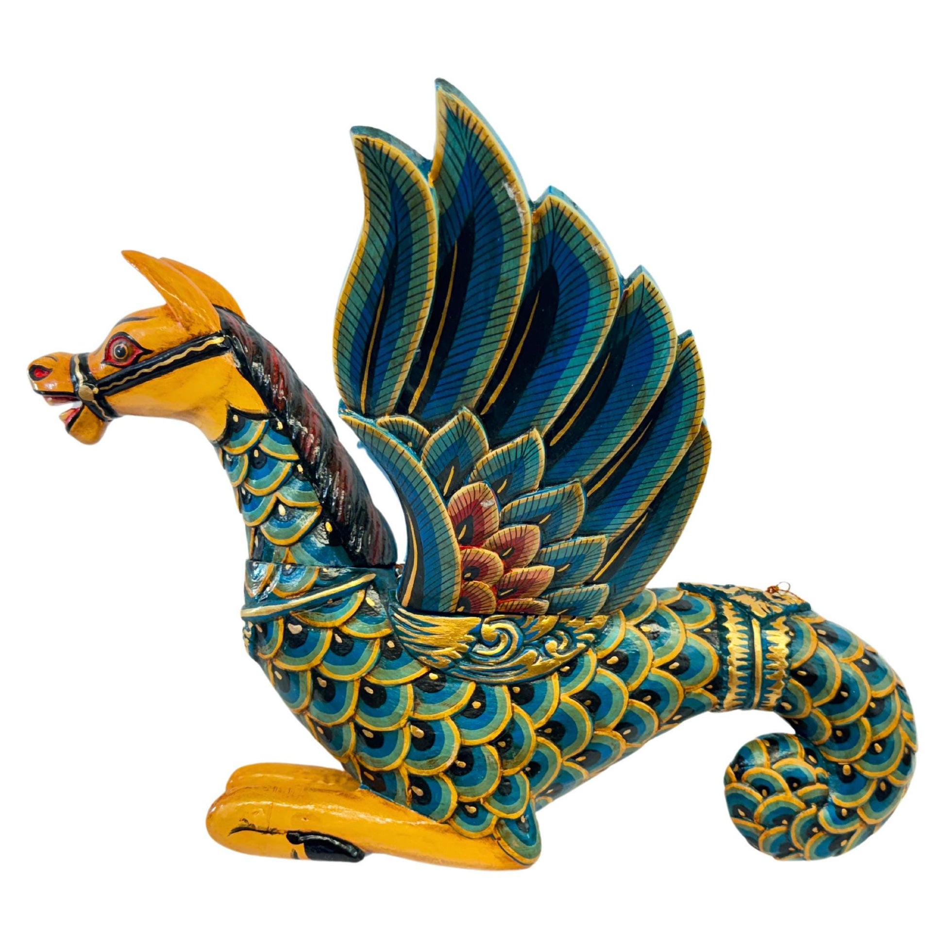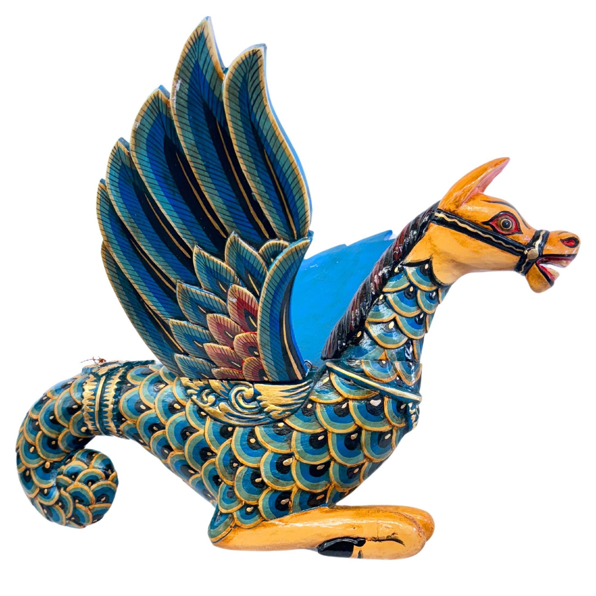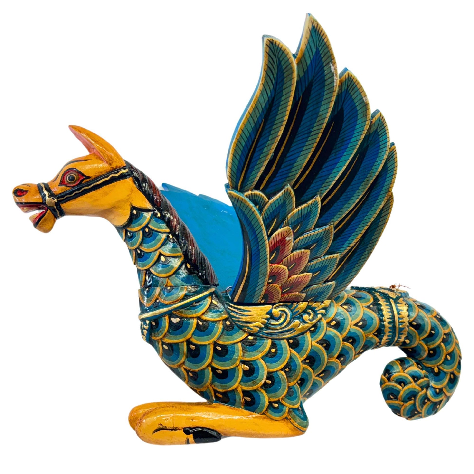Whimsical Flying Winged Seahorse Mobile Is hand carved in Bali by talented village crafts people. Traditional mobiles like this are a combination of two animals to create a mythical beast known as a Makara. Traditionally, a makara is considered to be an aquatic mythical creature and are depicted as half mammal and half fish.