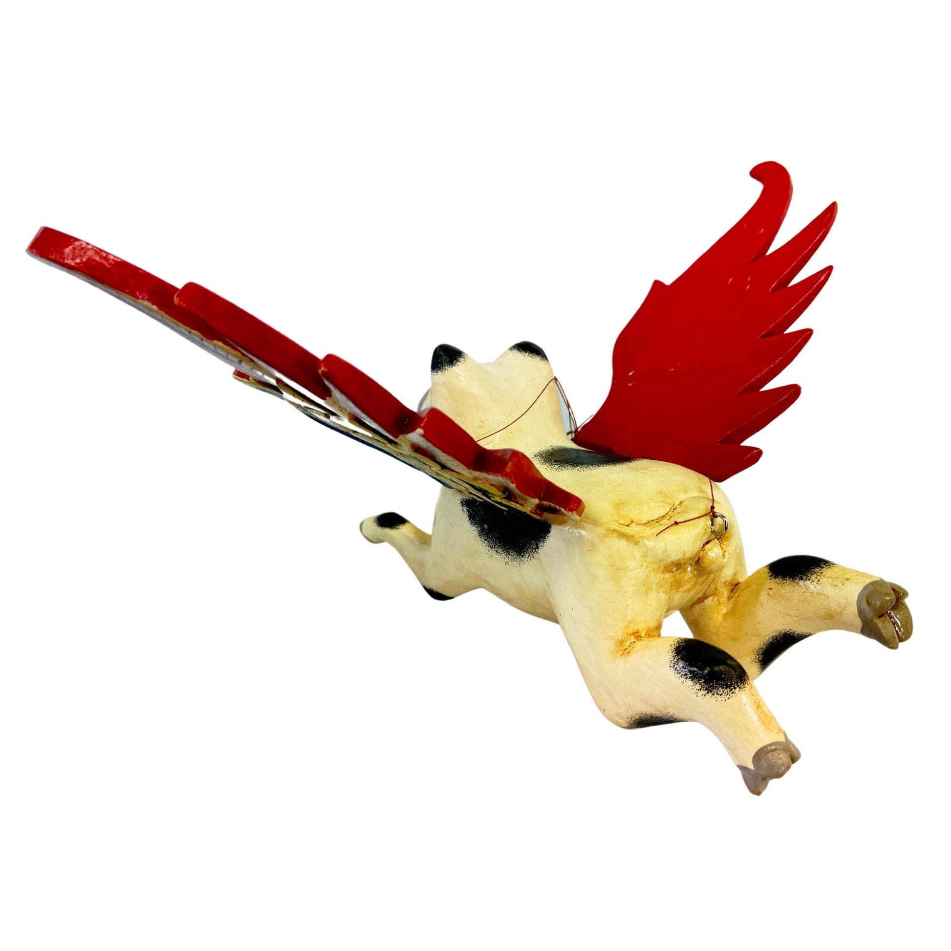 Our all new flying Winged Pig Mobile, hand carved in Bali by talented crafts people. Albesia wood a fast growing light weight wood is carved and whimsically painted in beige with black with detailed and colorful red, blue, green and black wings. A fun mobile for your home. Or a great gift for the person who loves piggies!