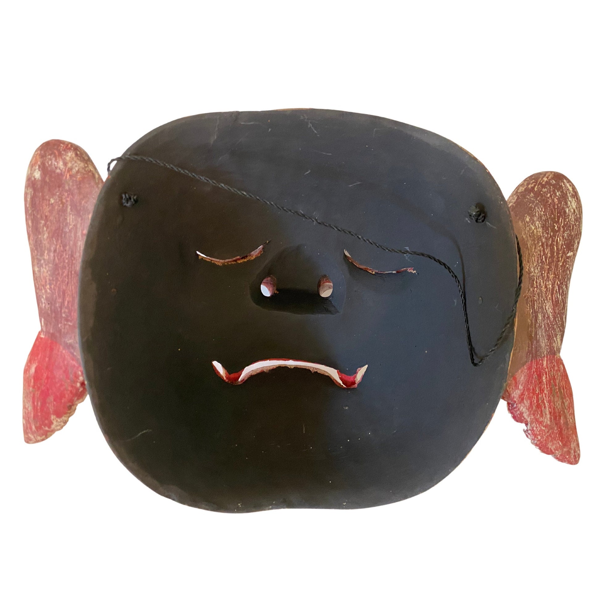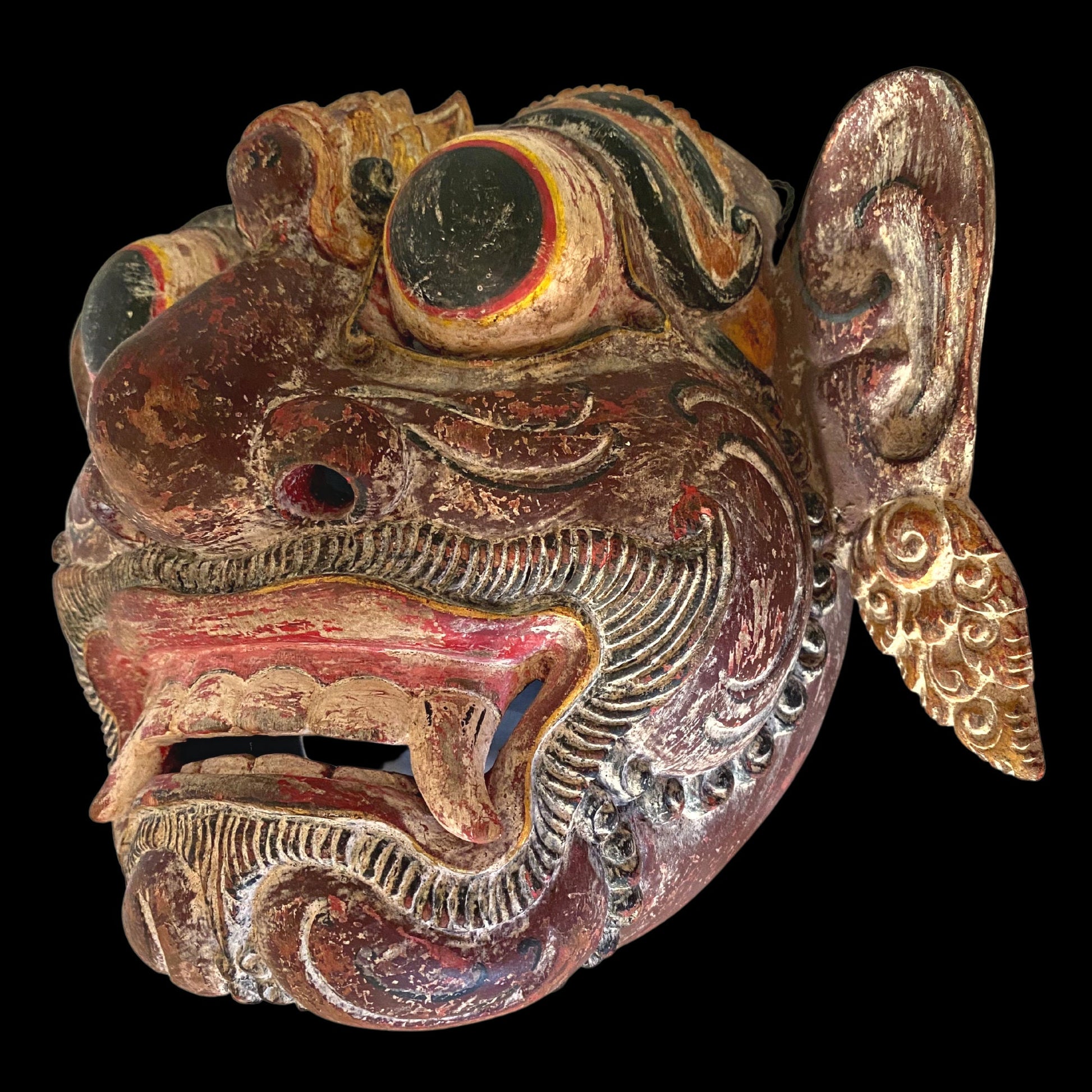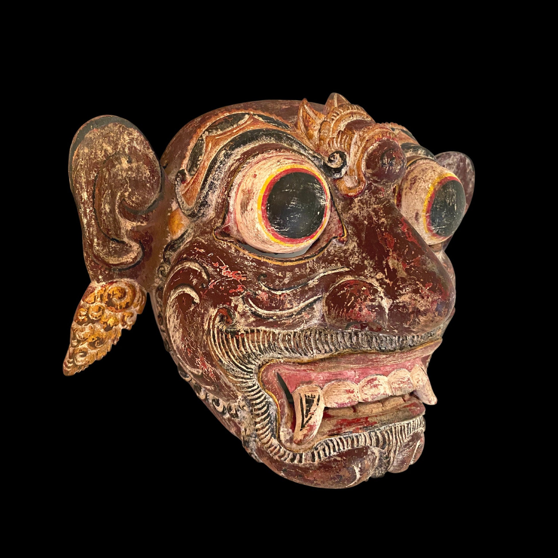 Hand carved from pule wood with great detail, a jutting cleft chin and the bulging eyes are fierce. Painted in an antiqued deep red and black and goldleaf this is a striking mask for any collection, and will make a fantastic addition to any mask collection, or as part of your eclectic decor.