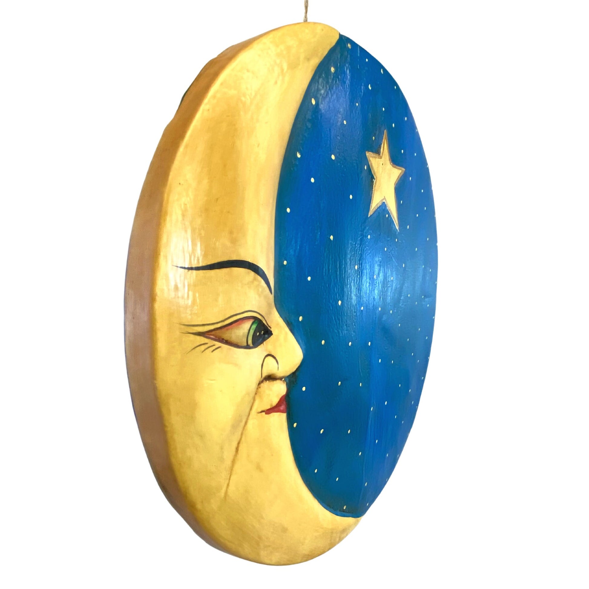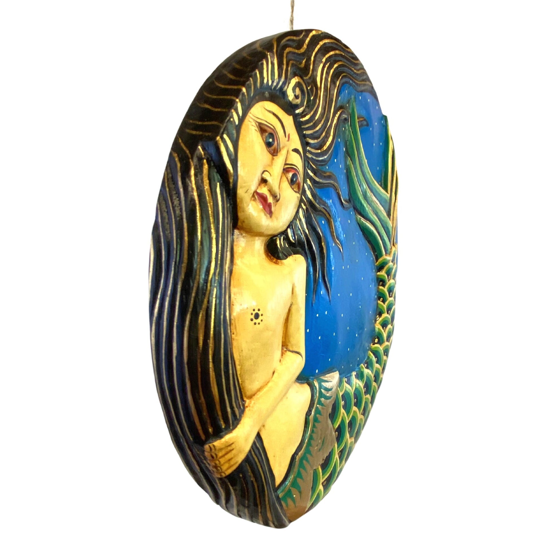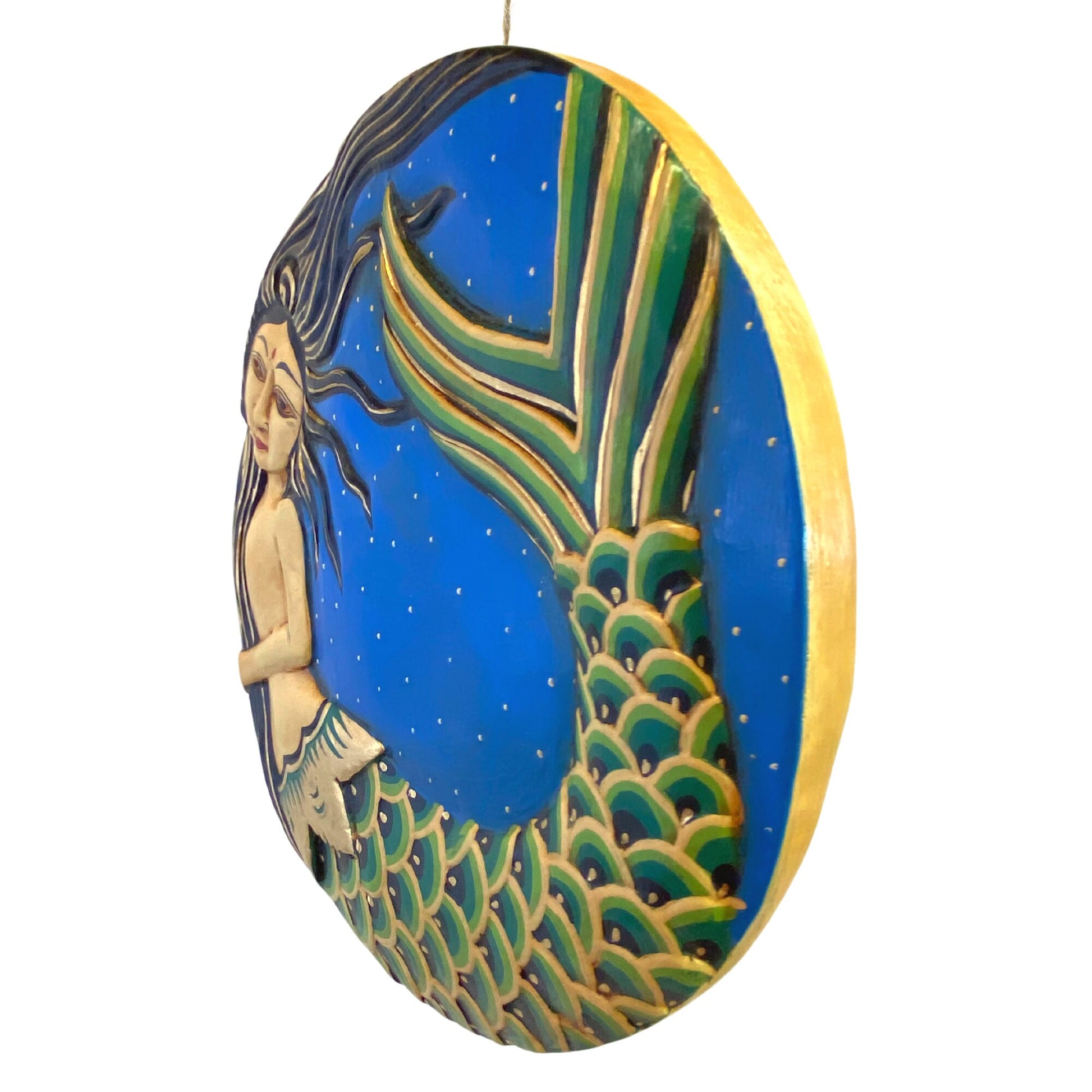 This Mermaid rest upon a sea of deep blue with her hair flowing out around her face. The tail of the mermaid is highly detailed with each scale painted. Hints of gold leaf highlight her, tail, hair and belt. The back side is carved with the crescent moon upon a star flecked deep blue sky. Perfect hung in a window, or from your ceiling. A playful addition to any space.