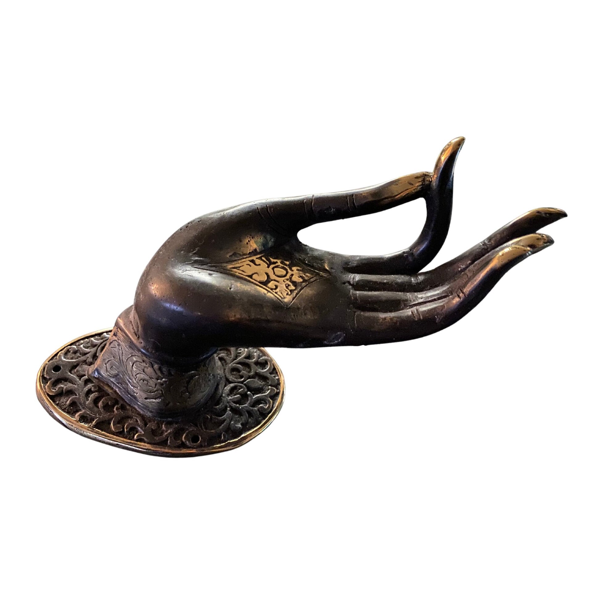 Graceful Buddha hands formed into a mudra which is to expel negative energy are meant to be mounted on a door, wall or cabinet as a knob, handle, drawer pull or wall-hook. Solid bronze with a beautiful deep brown burnished finish with polished gold highlights. A beautiful and unique adornment for your home, or where ever you would like to add a touch of Bali serenity.