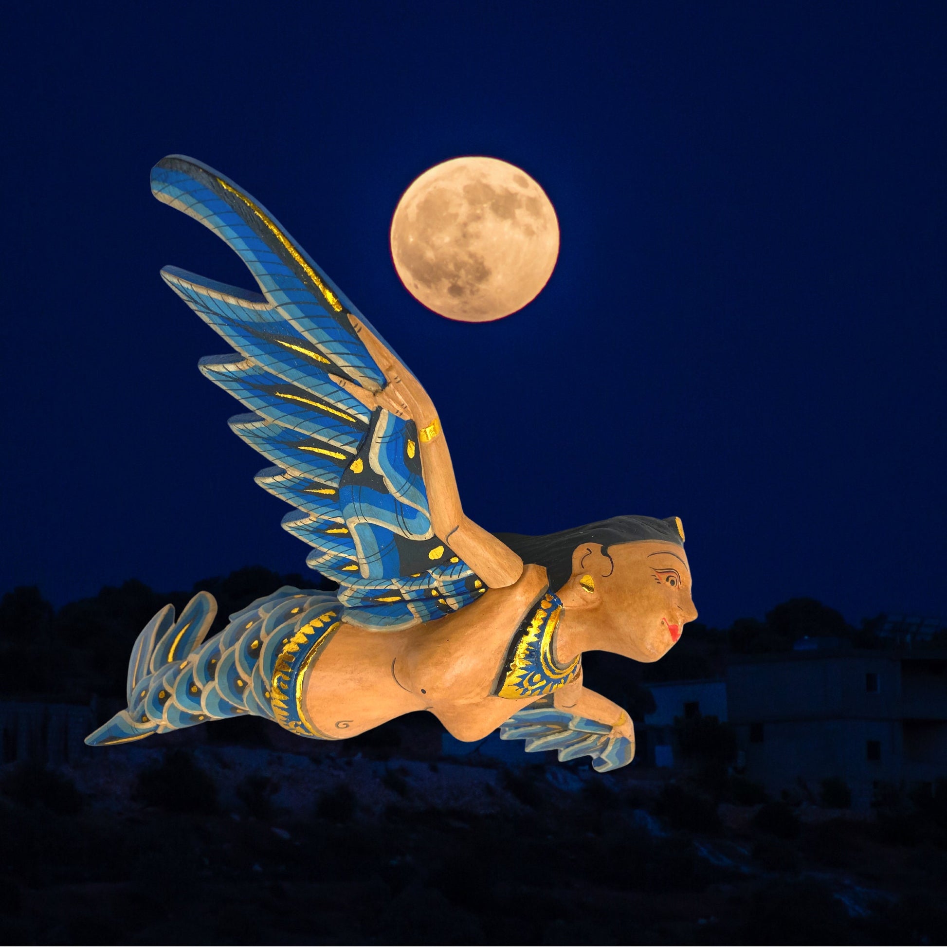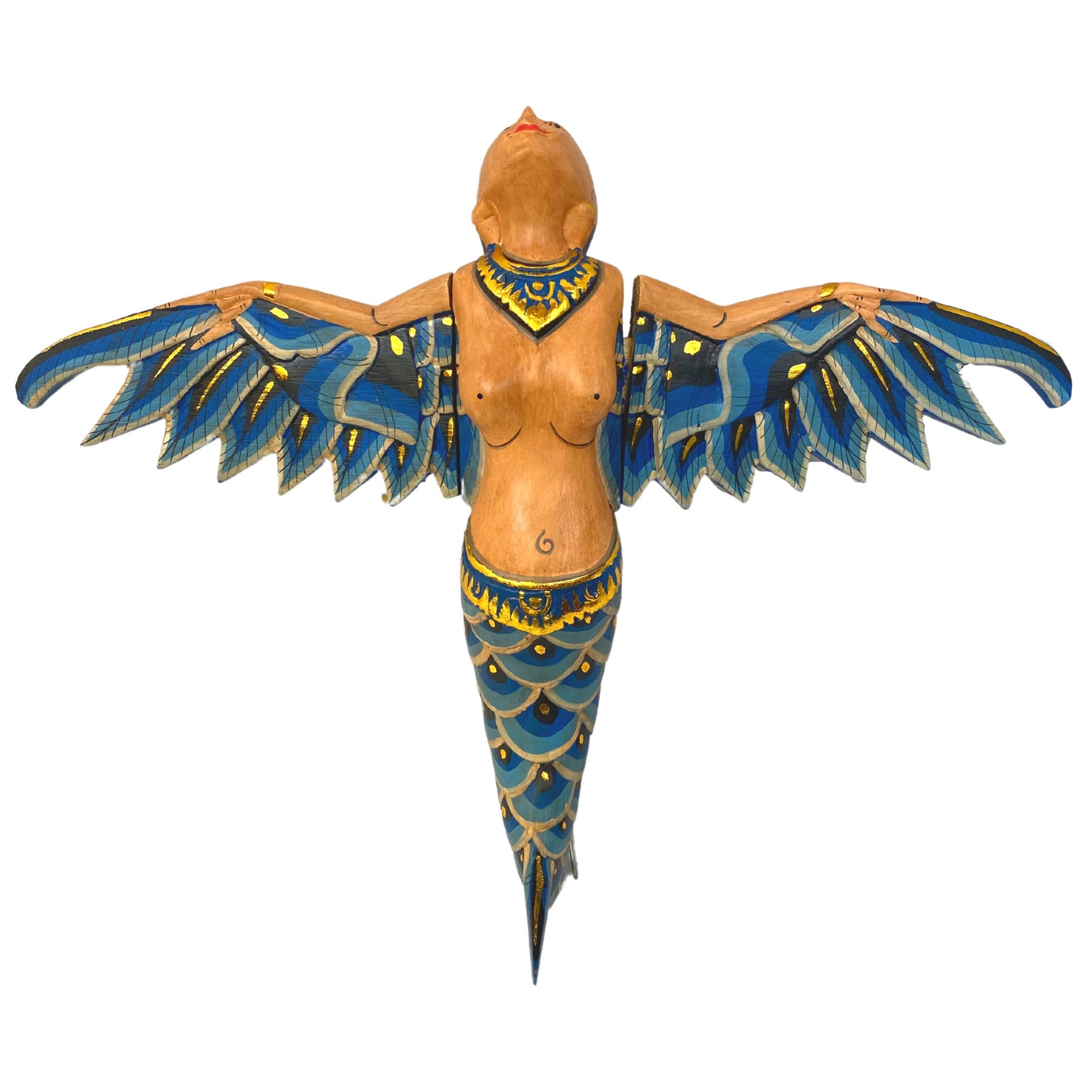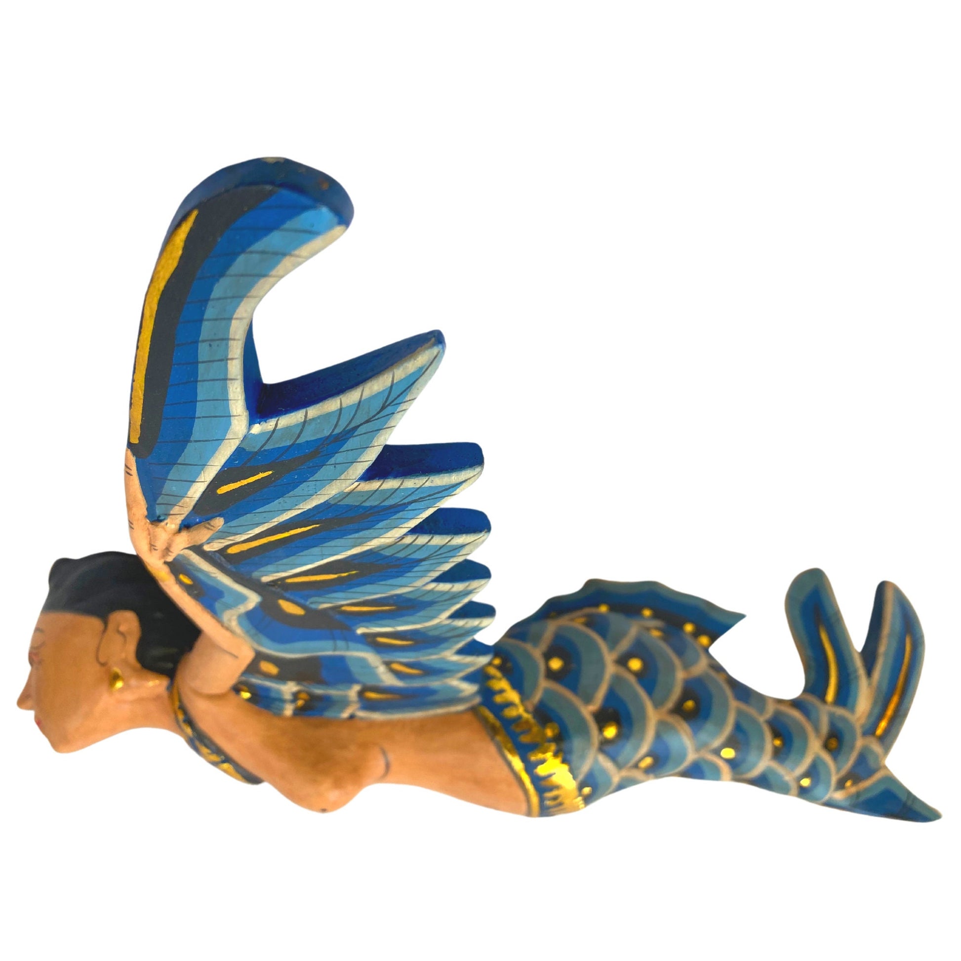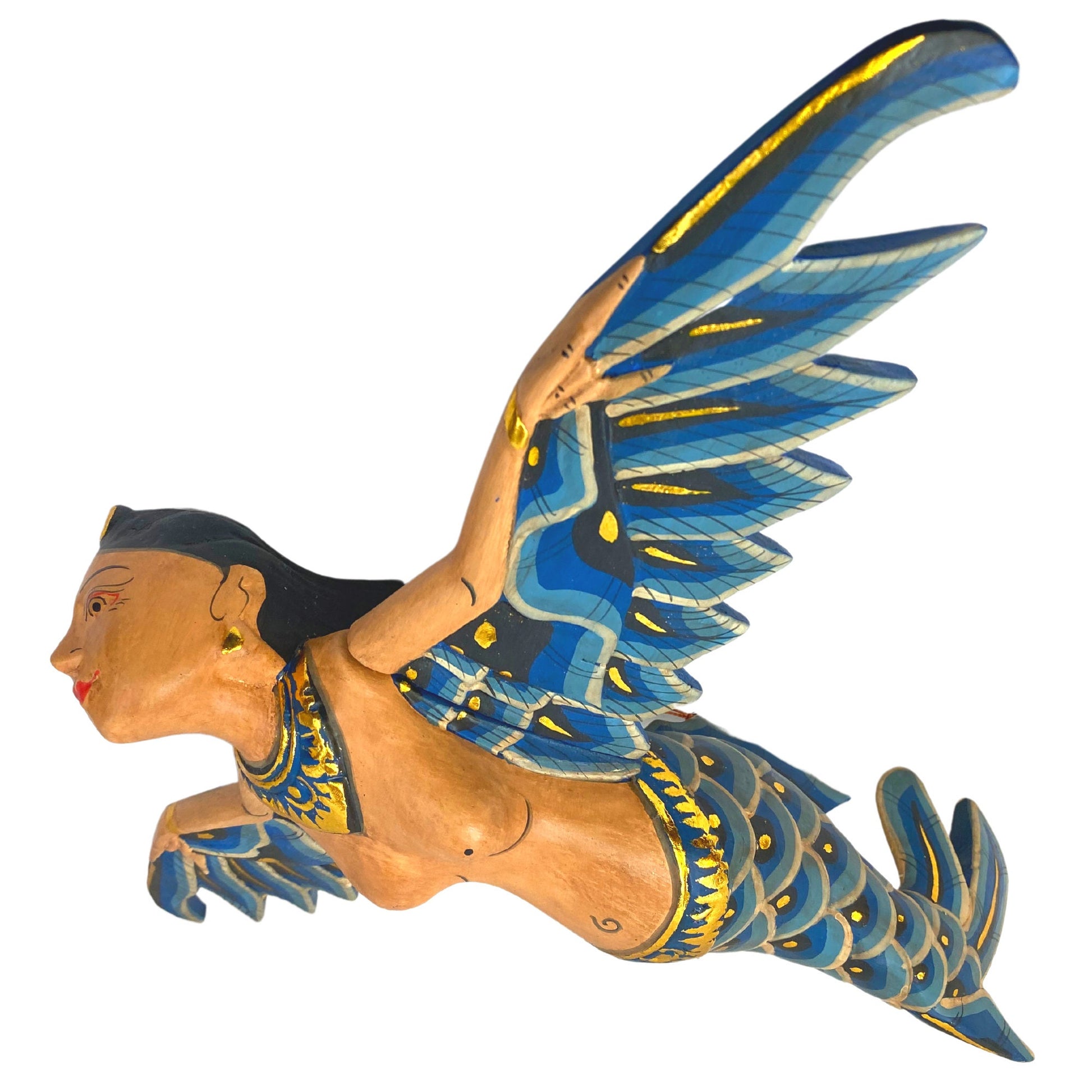 Hand Carved Winged Mermaid Goddess Mobile. Hand carved and painted on the Island of Bali, our gorgeous Dewi is completely hand carved by the talented carvers of this magical island from Albesia wood, a sustainable tropical wood grown and harvested for carving.