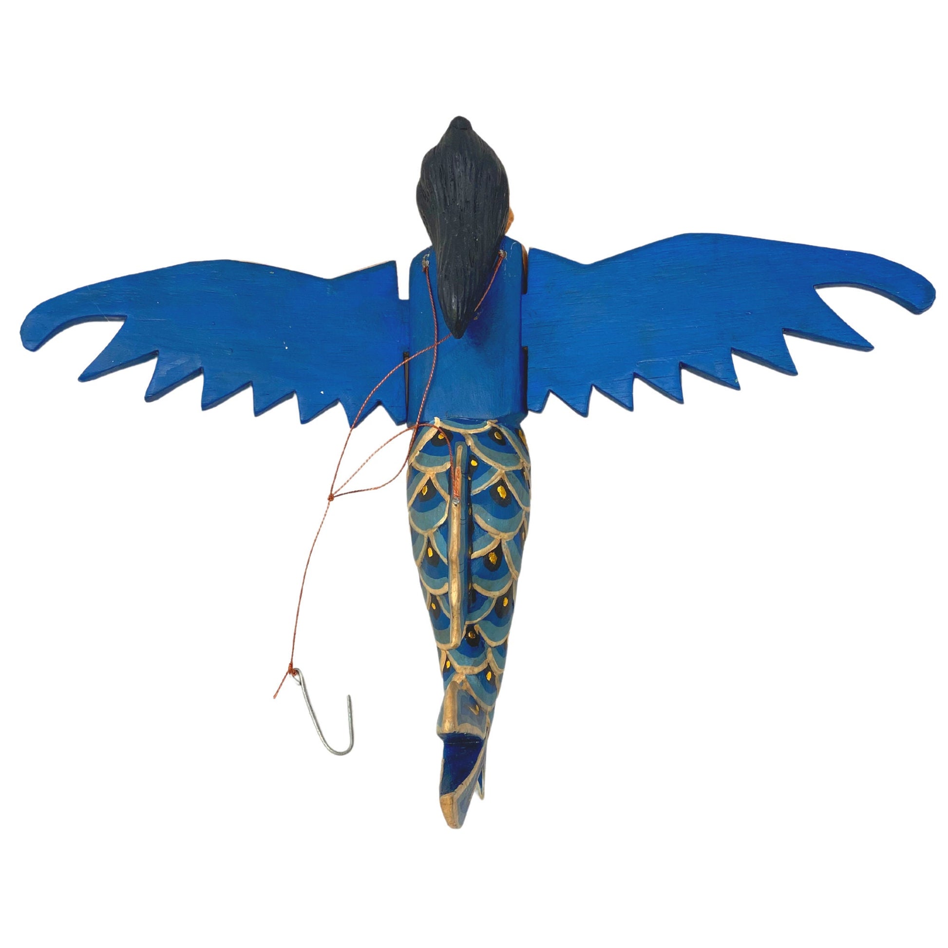 Flying Mermaid Mobile winged GODDESS Spiritchaser Demon Chaser Guardian Hand Carved Wood Ornament Balinese Folk Art Teal 12 inch