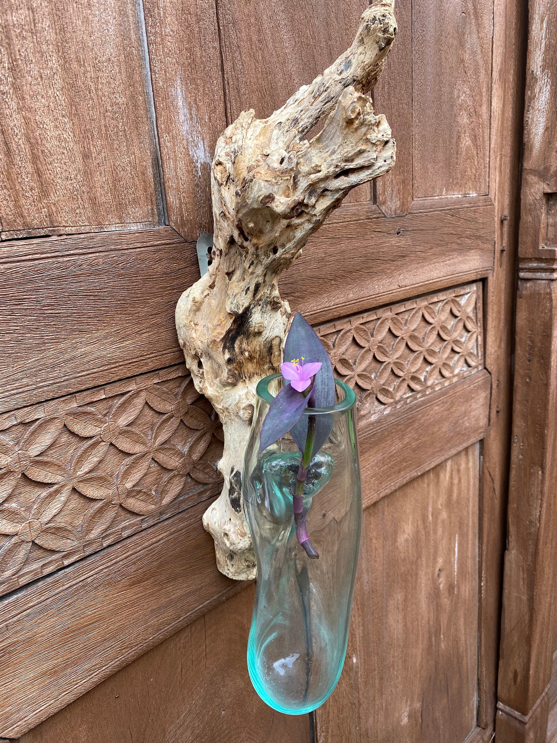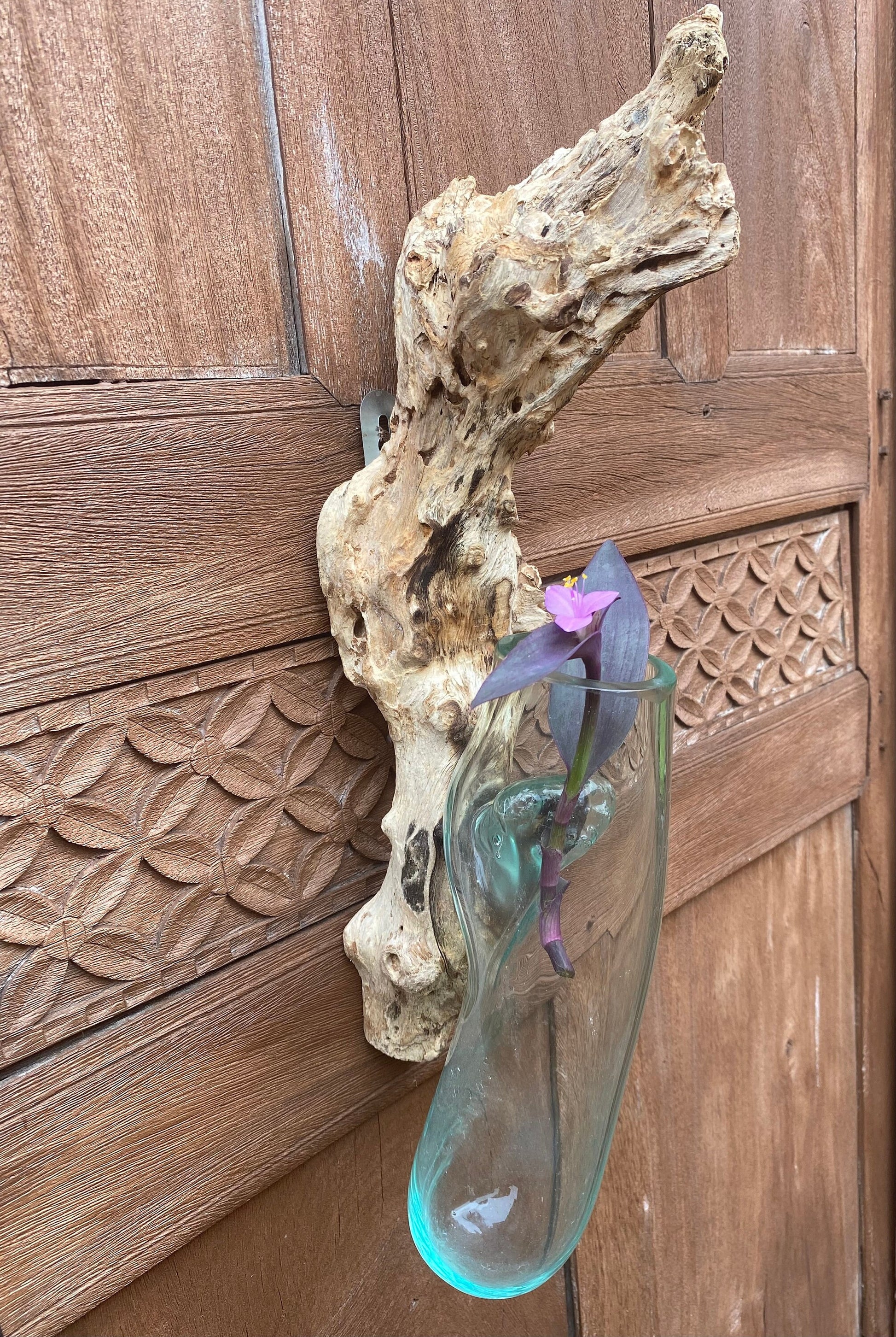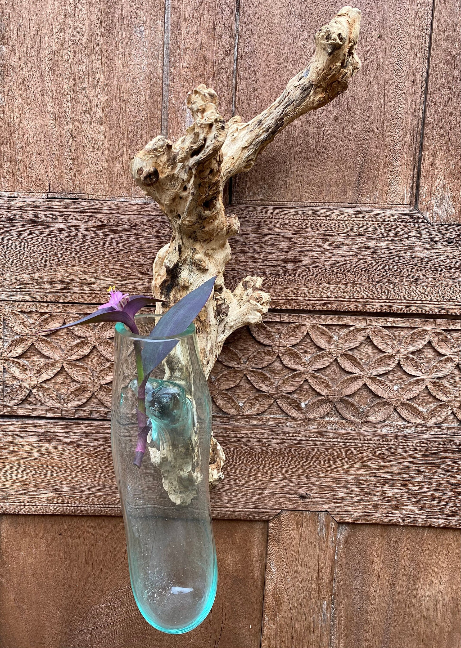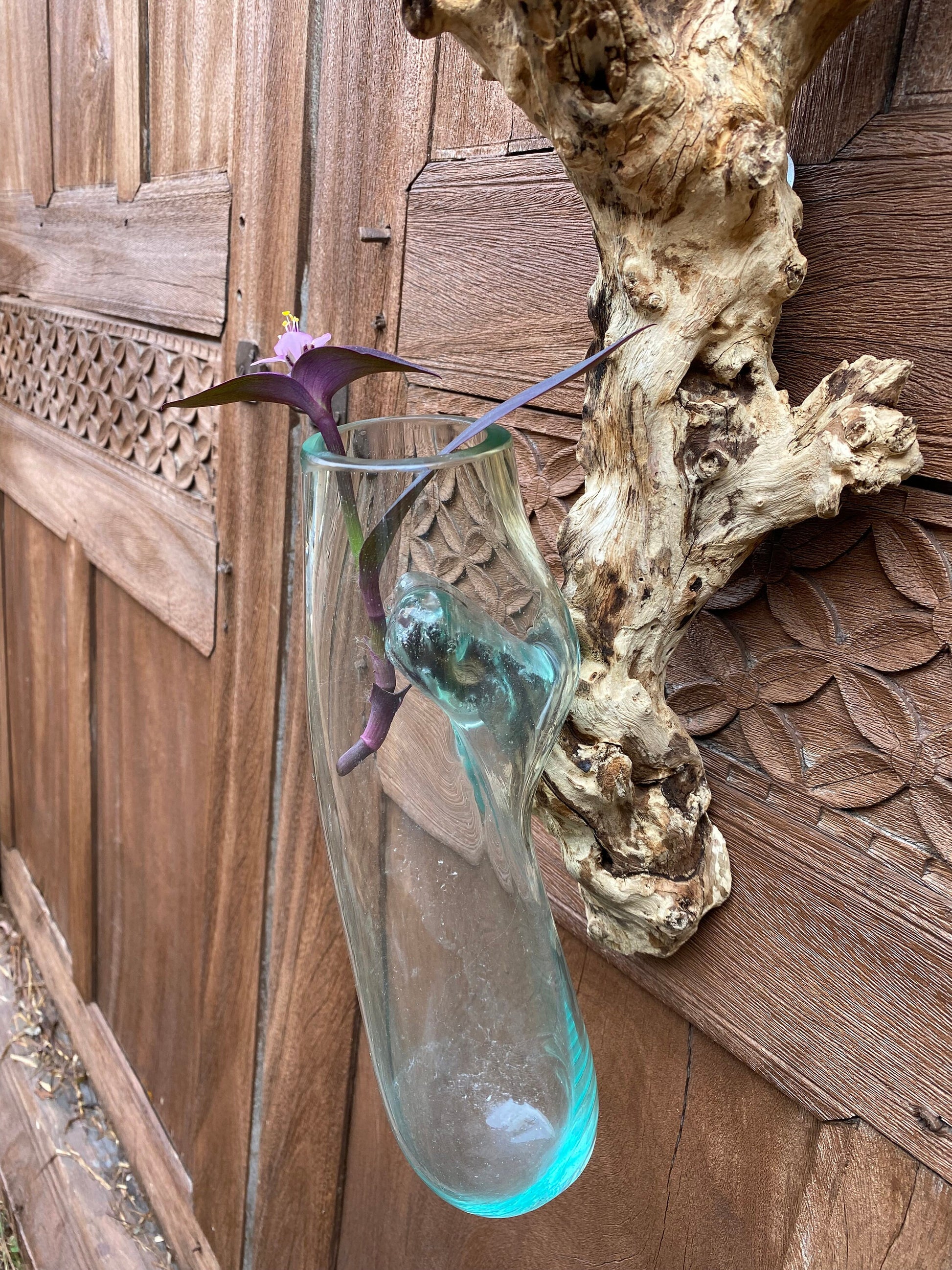 Unique Propagation Wall Pocket Vase Plant Cutting Rooter, crafted from mouth blown slumped glass by talented glass artist on the island of Bali. Recycled molten glass is slumped over the top of a reclaimed teak root base. This forms a unique glass scape in the bottom of each glass vessel as the molten glass drapes & it takes on the gnarly shape of the wood.