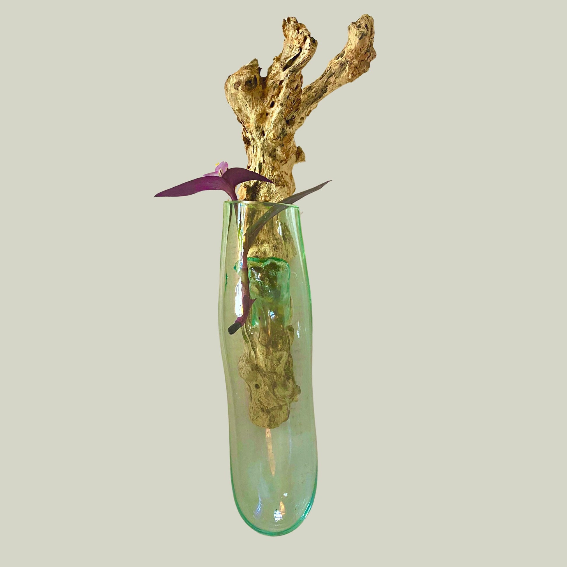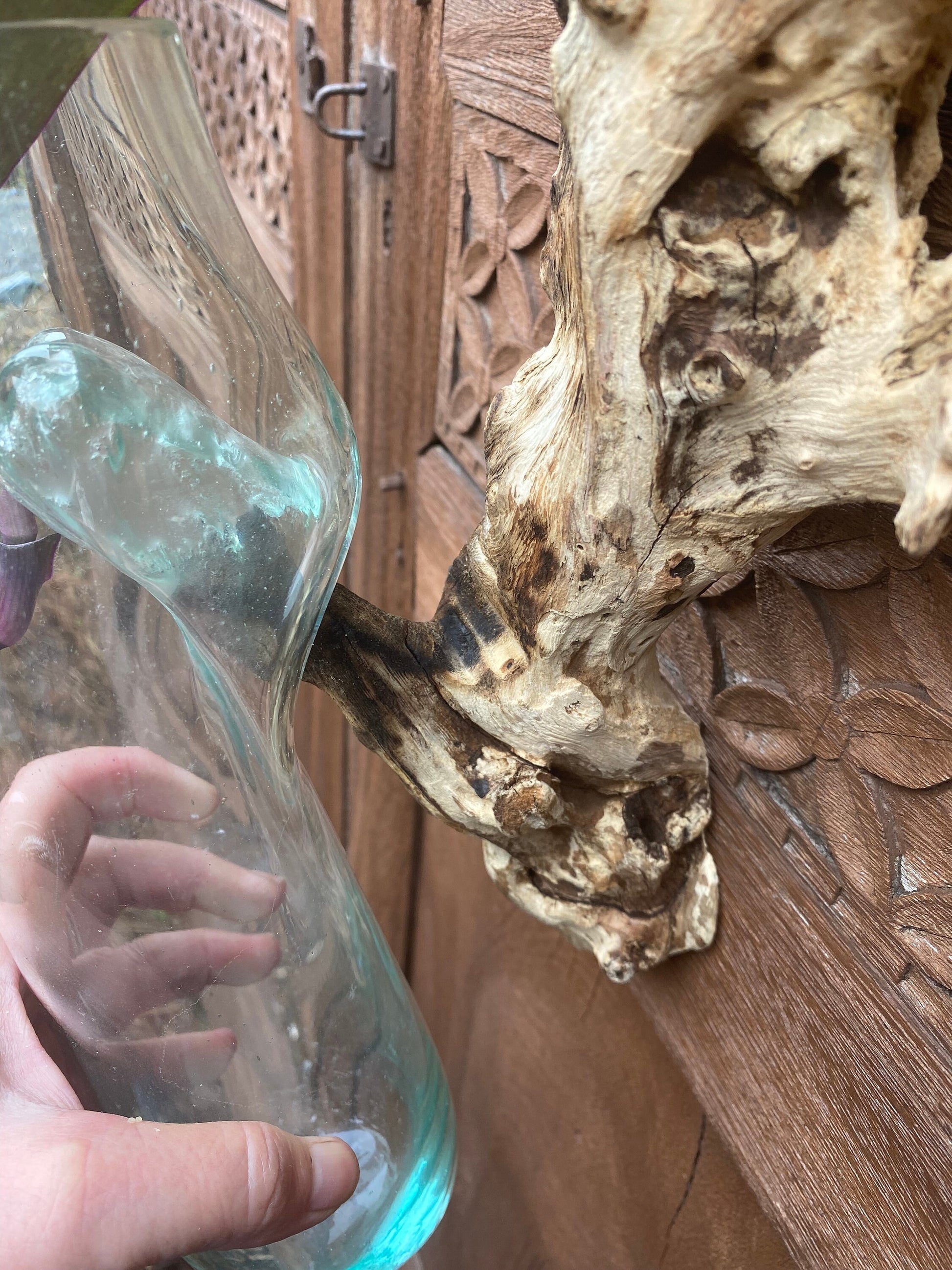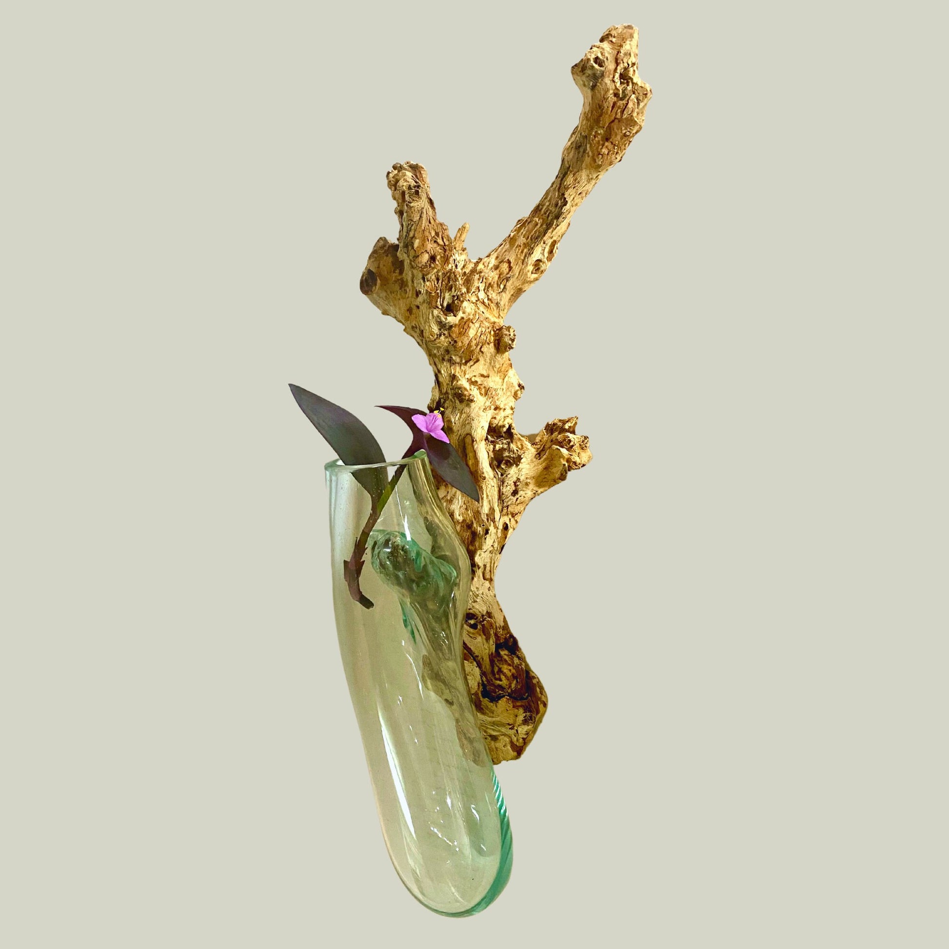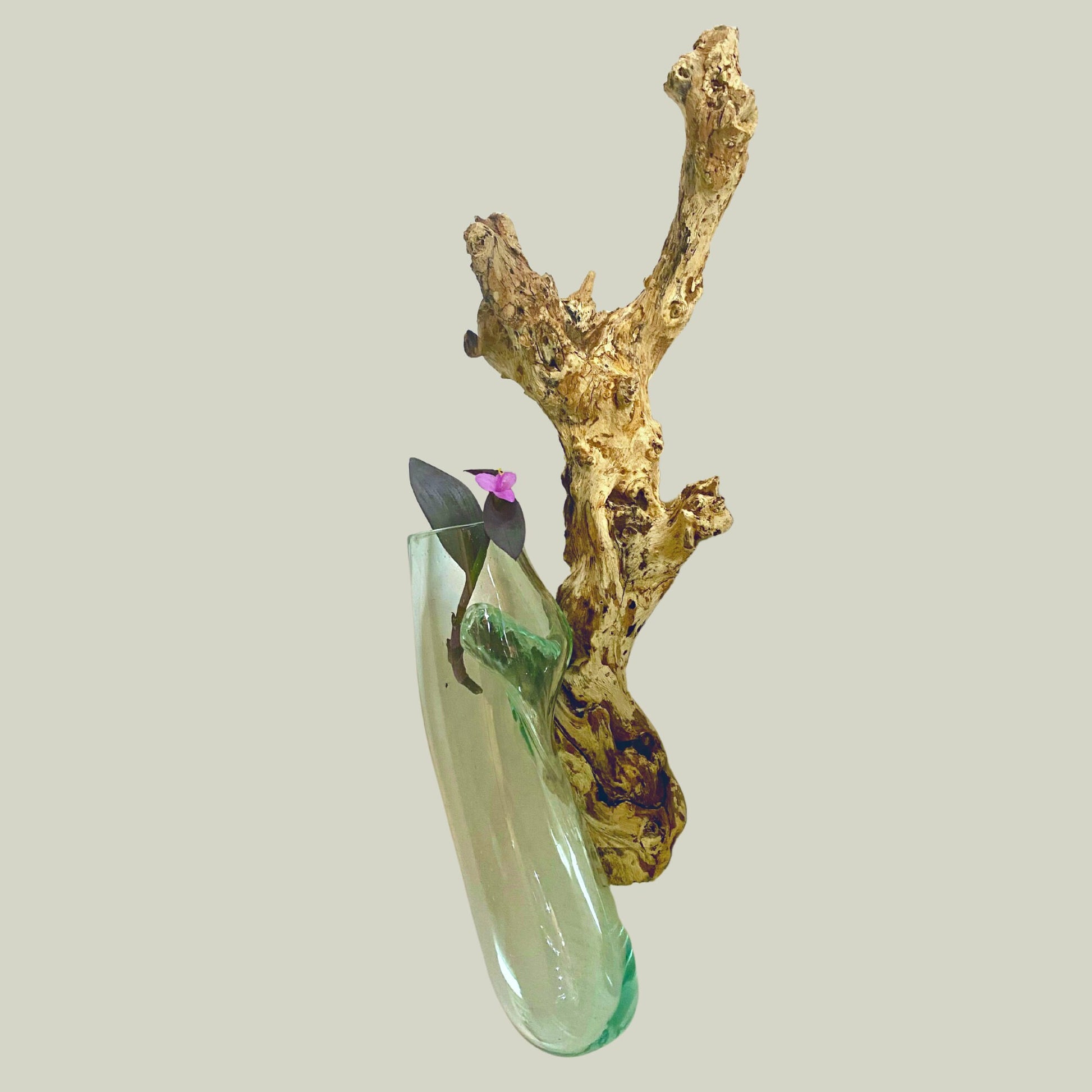 Unique Propagation Wall Pocket Vase Plant Cutting Rooter, crafted from mouth blown slumped glass by talented glass artist on the island of Bali. Recycled molten glass is slumped over the top of a reclaimed teak root base. This forms a unique glass scape in the bottom of each glass vessel as the molten glass drapes & it takes on the gnarly shape of the wood.
