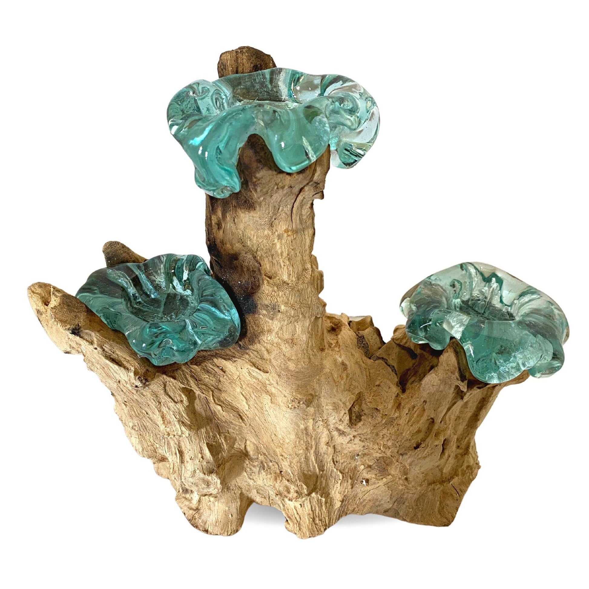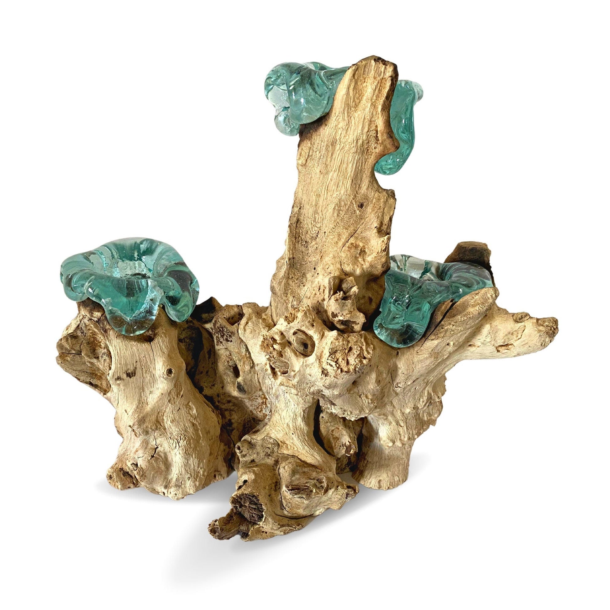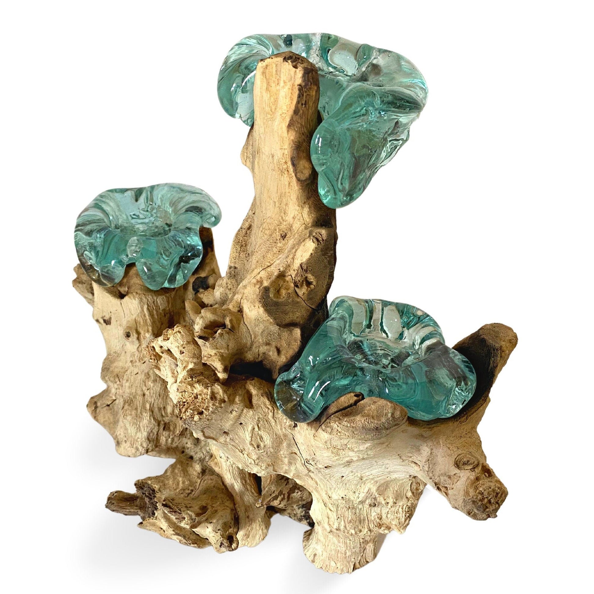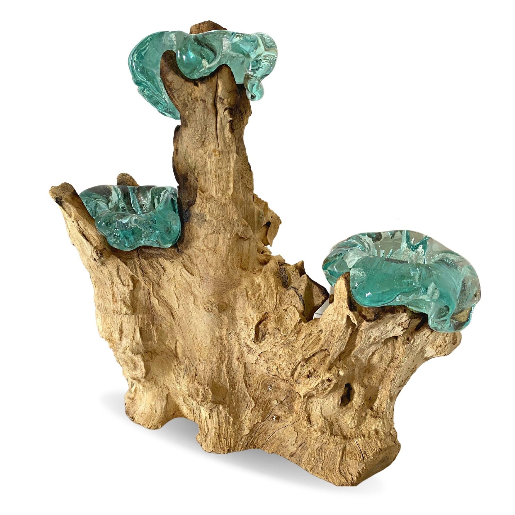 Unique Hand Blown Slumped Glass & Teak Root Candelabra Table Centerpiece , crafted from mouth blown slumped glass by talented glass artist on the island of Bali. Recycled molten glass is slumped over the top of a reclaimed teak root base. This forms a unique glass formation that drapes and flows over the wood to fit perfectly as the molten glass takes on shape of the wood.