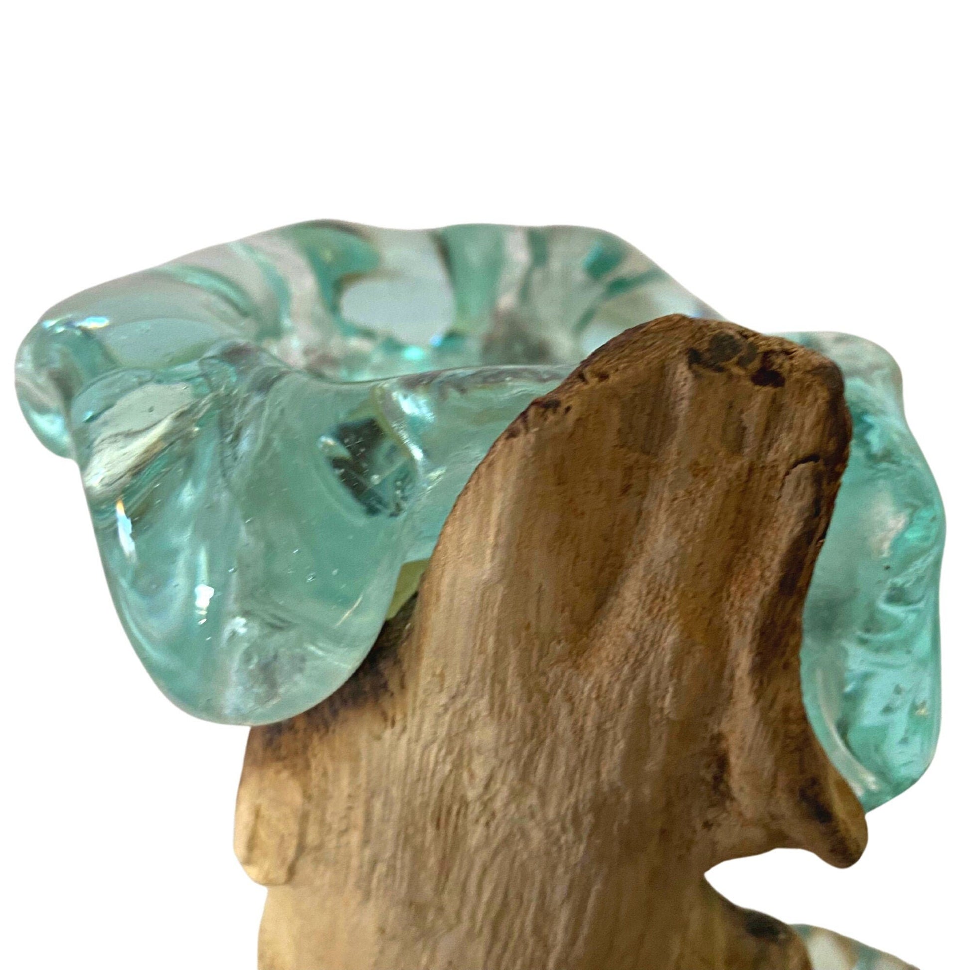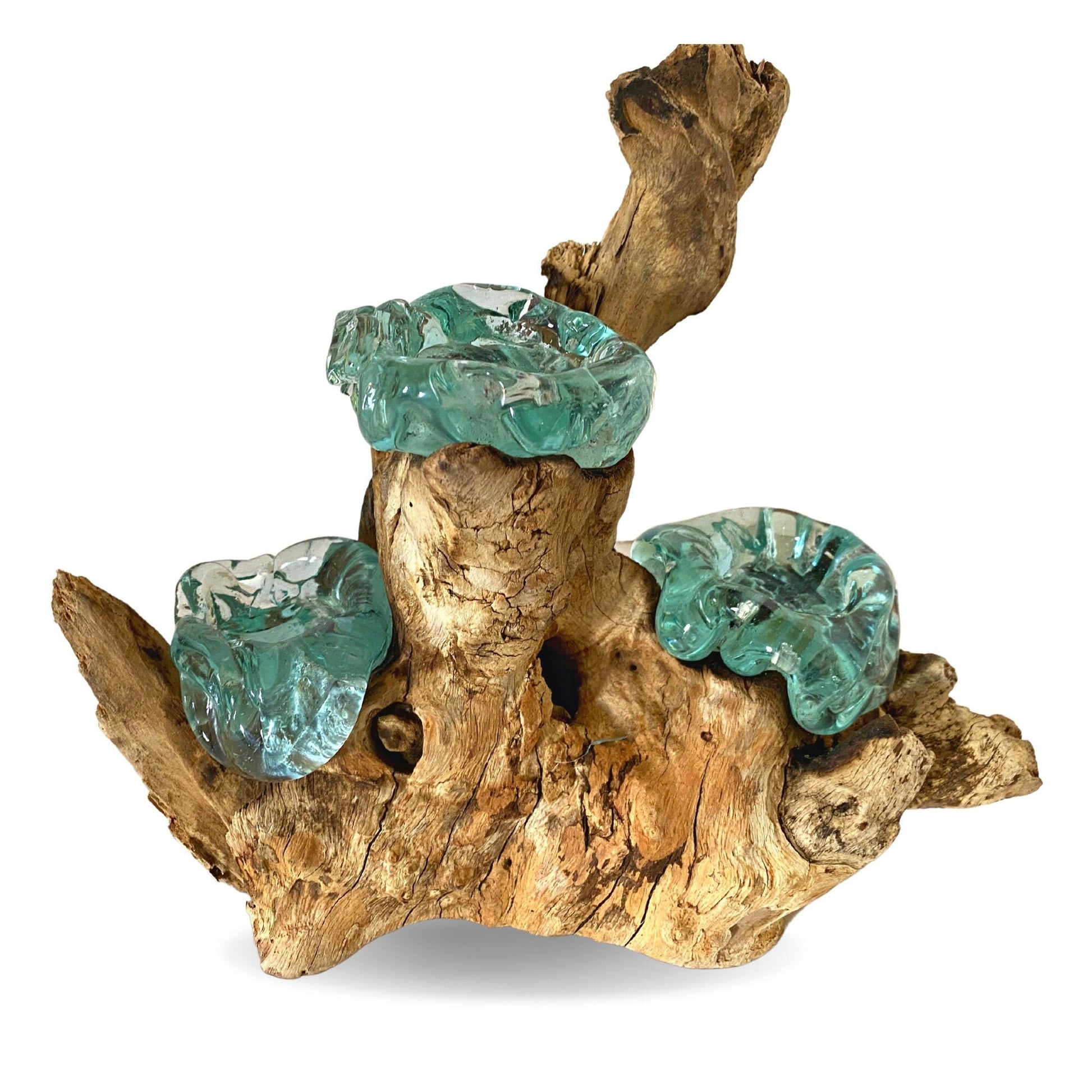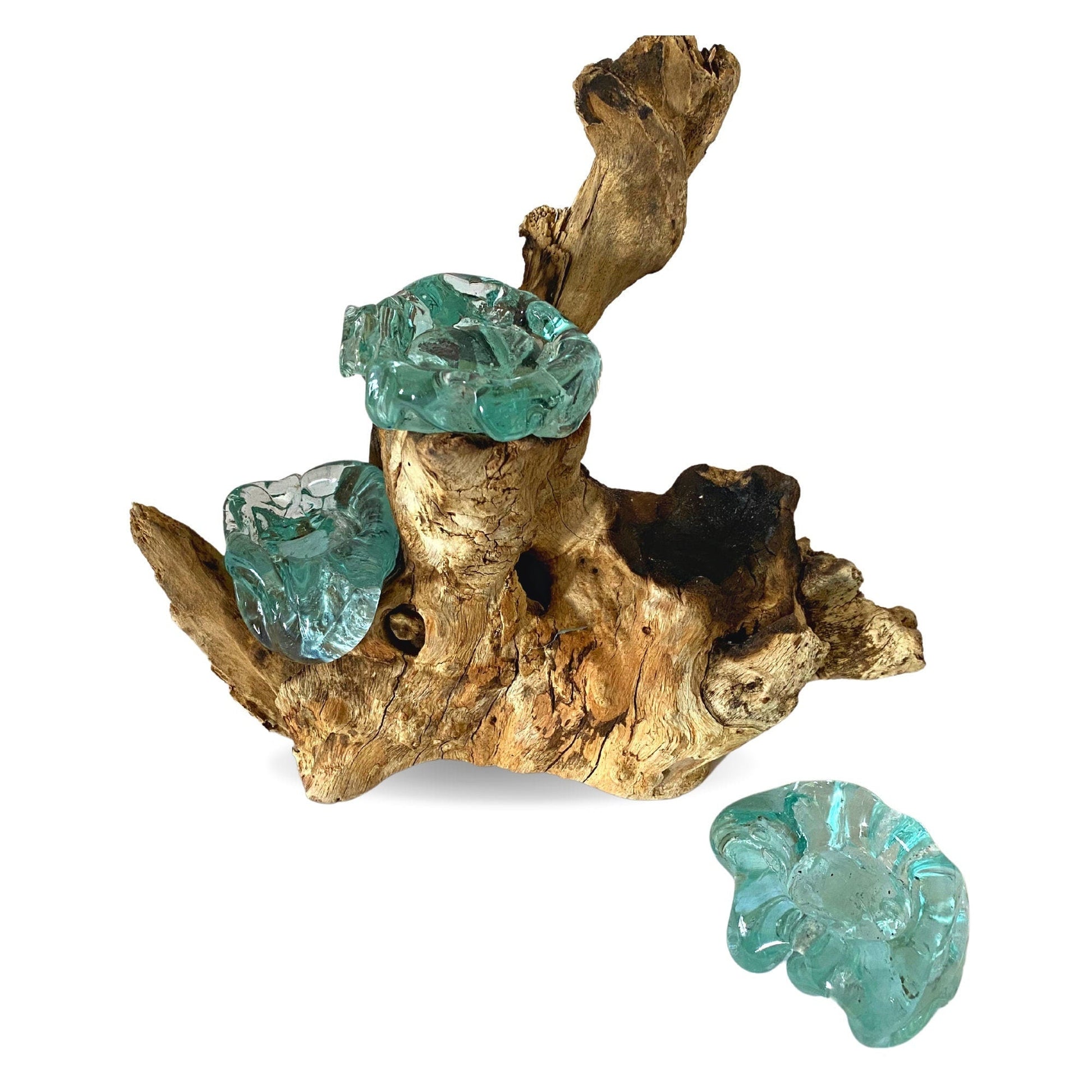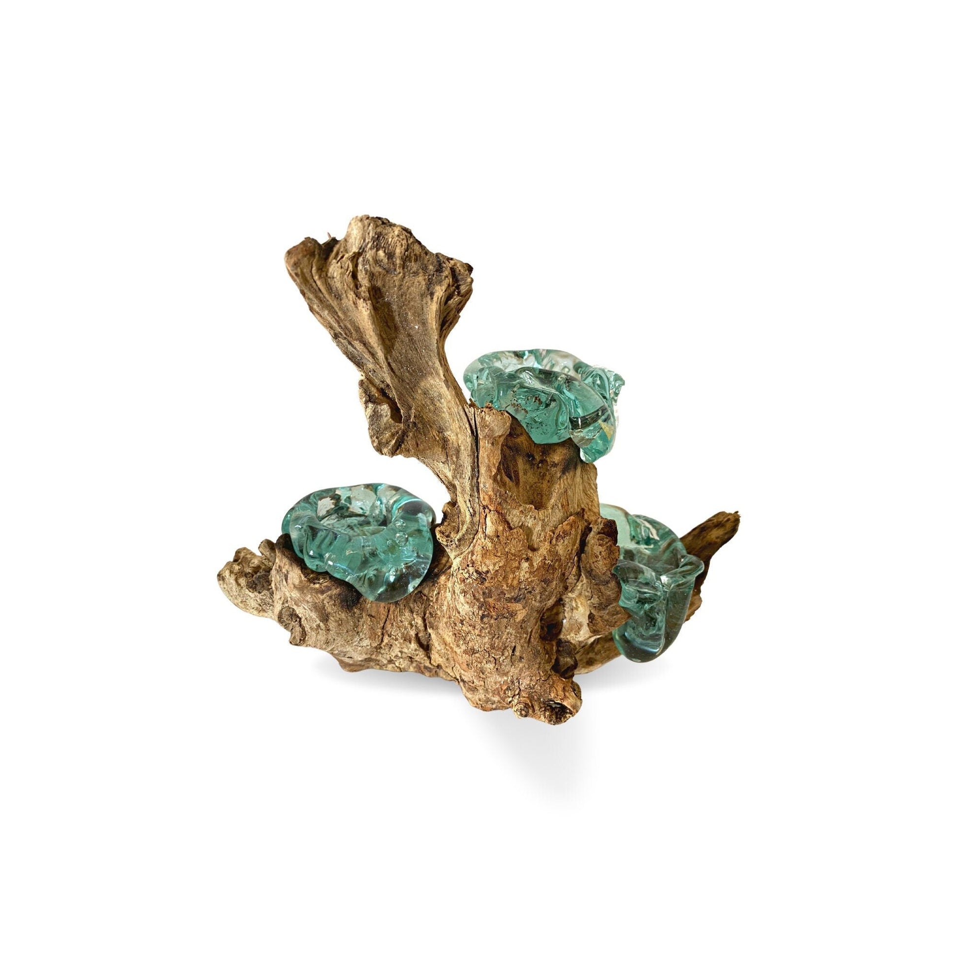 Unique Hand Blown Slumped Glass & Teak Root Candelabra Table Centerpiece , crafted from mouth blown slumped glass by talented glass artist on the island of Bali. Recycled molten glass is slumped over the top of a reclaimed teak root base. This forms a unique glass formation that drapes and flows over the wood to fit perfectly as the molten glass takes on shape of the wood.