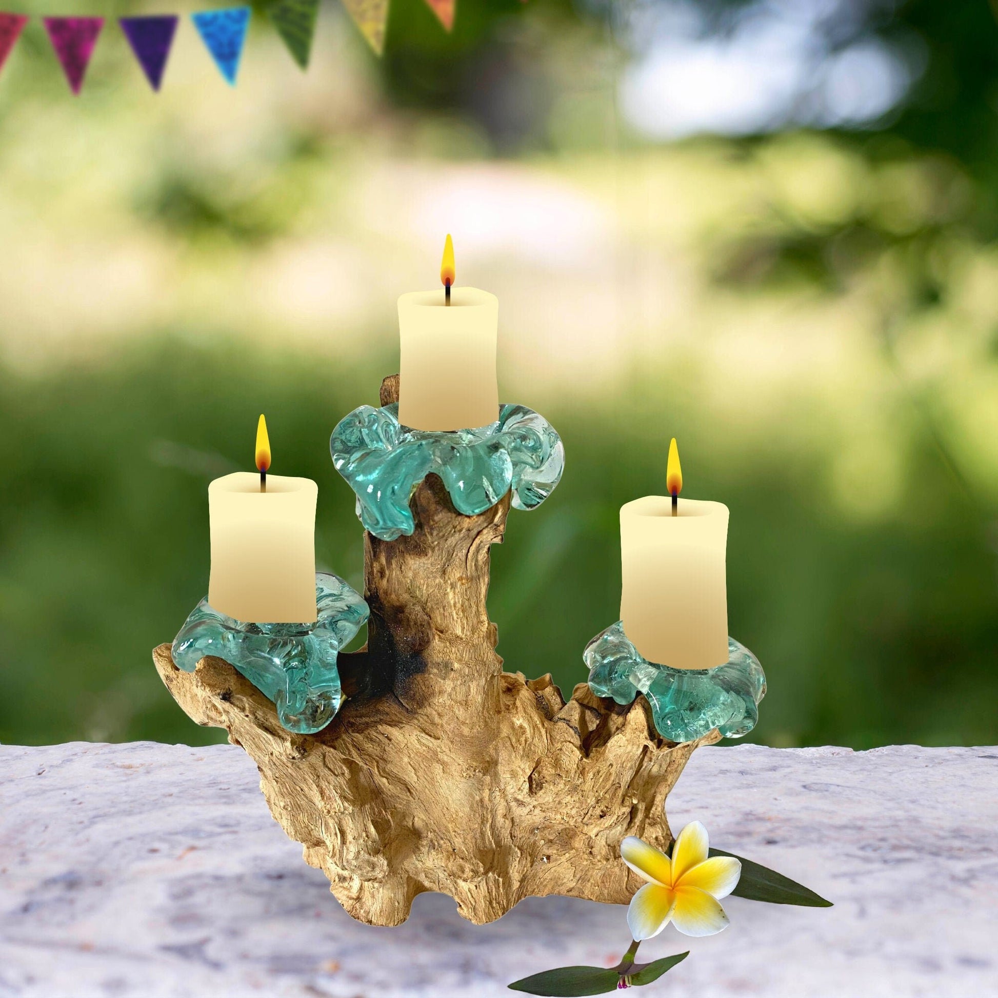 Hand Blown Glass Triple Candelabra Candle Holder Table Centerpiece Slumped Reclaimed Teak Root Wood Base Eclectic Boho Decor Balinese Art