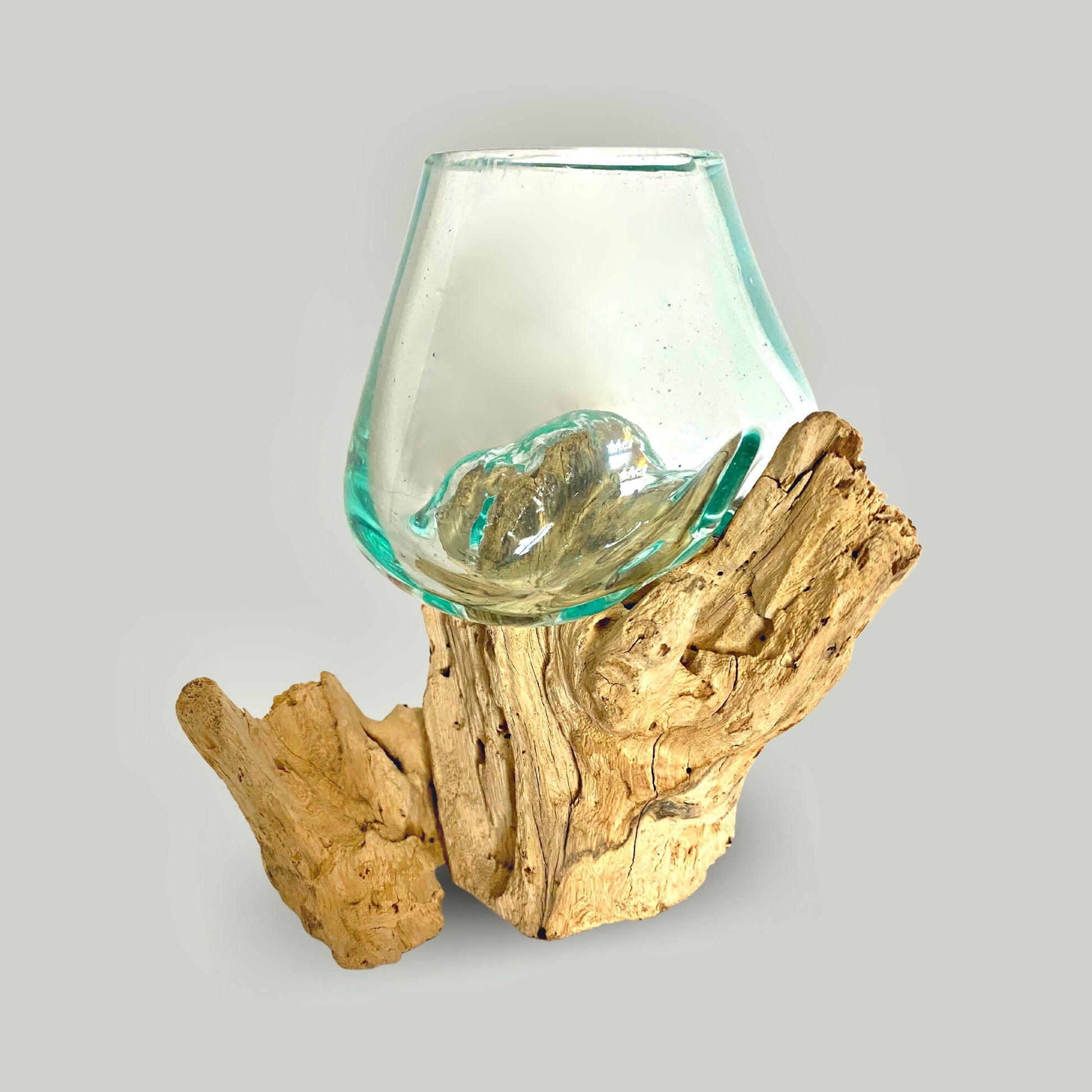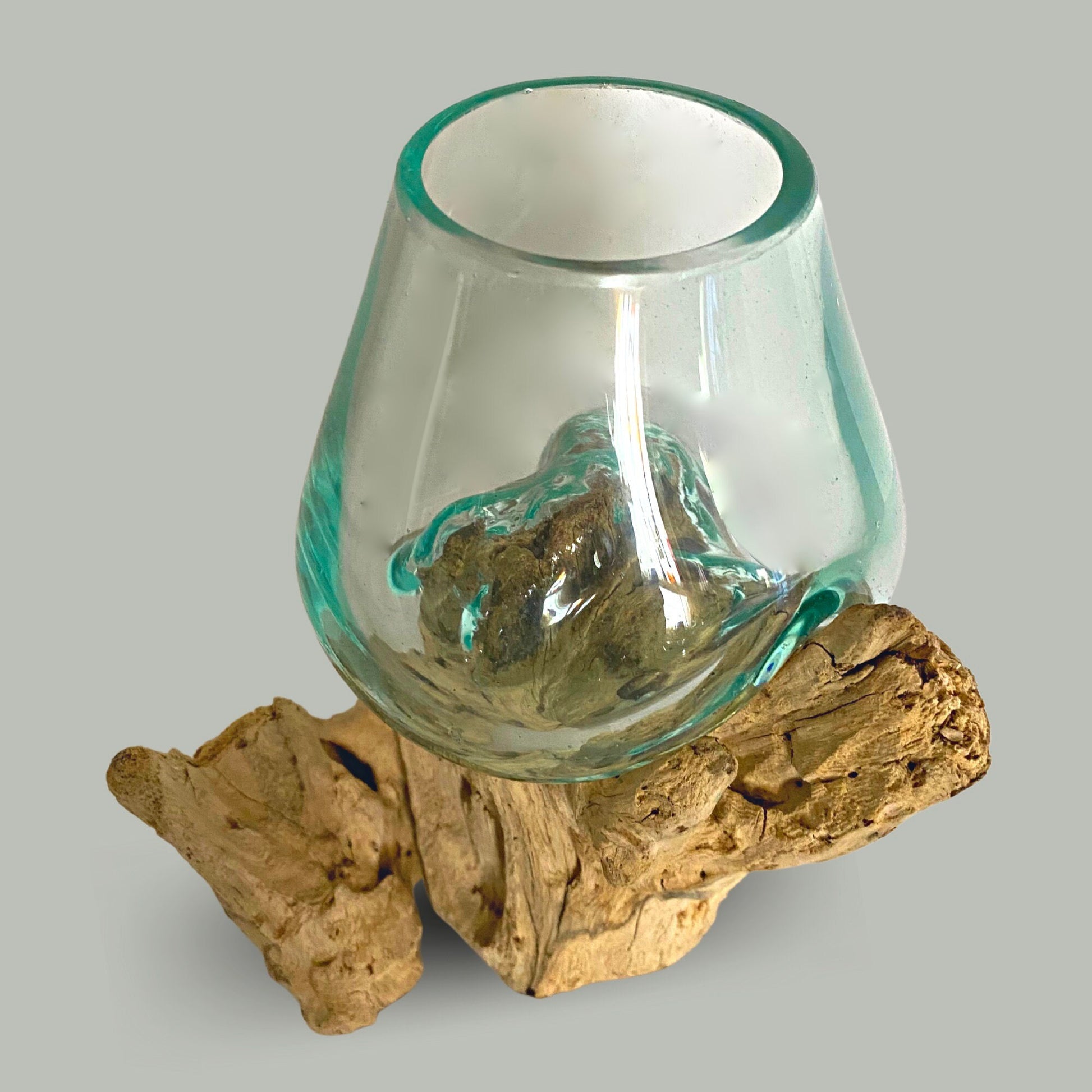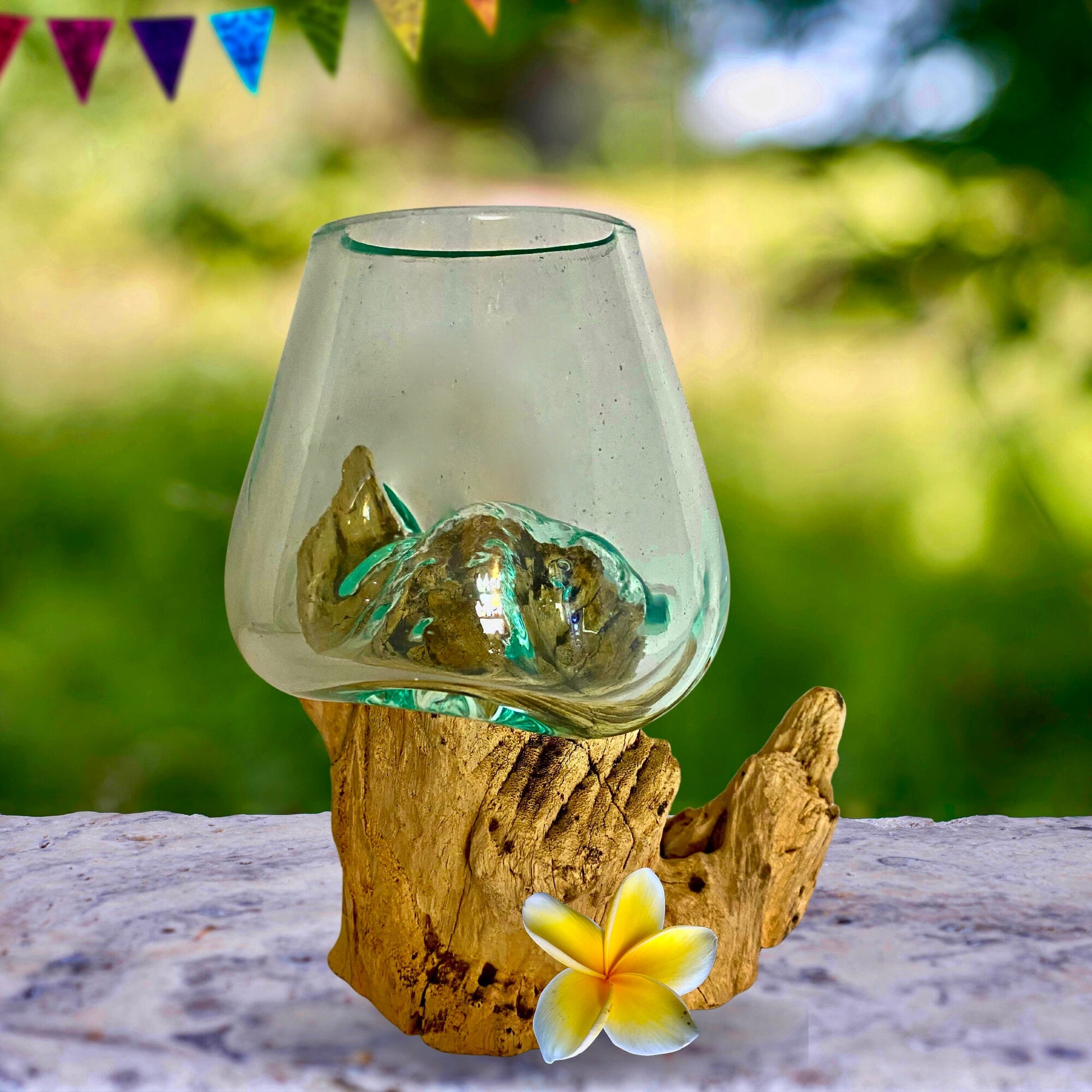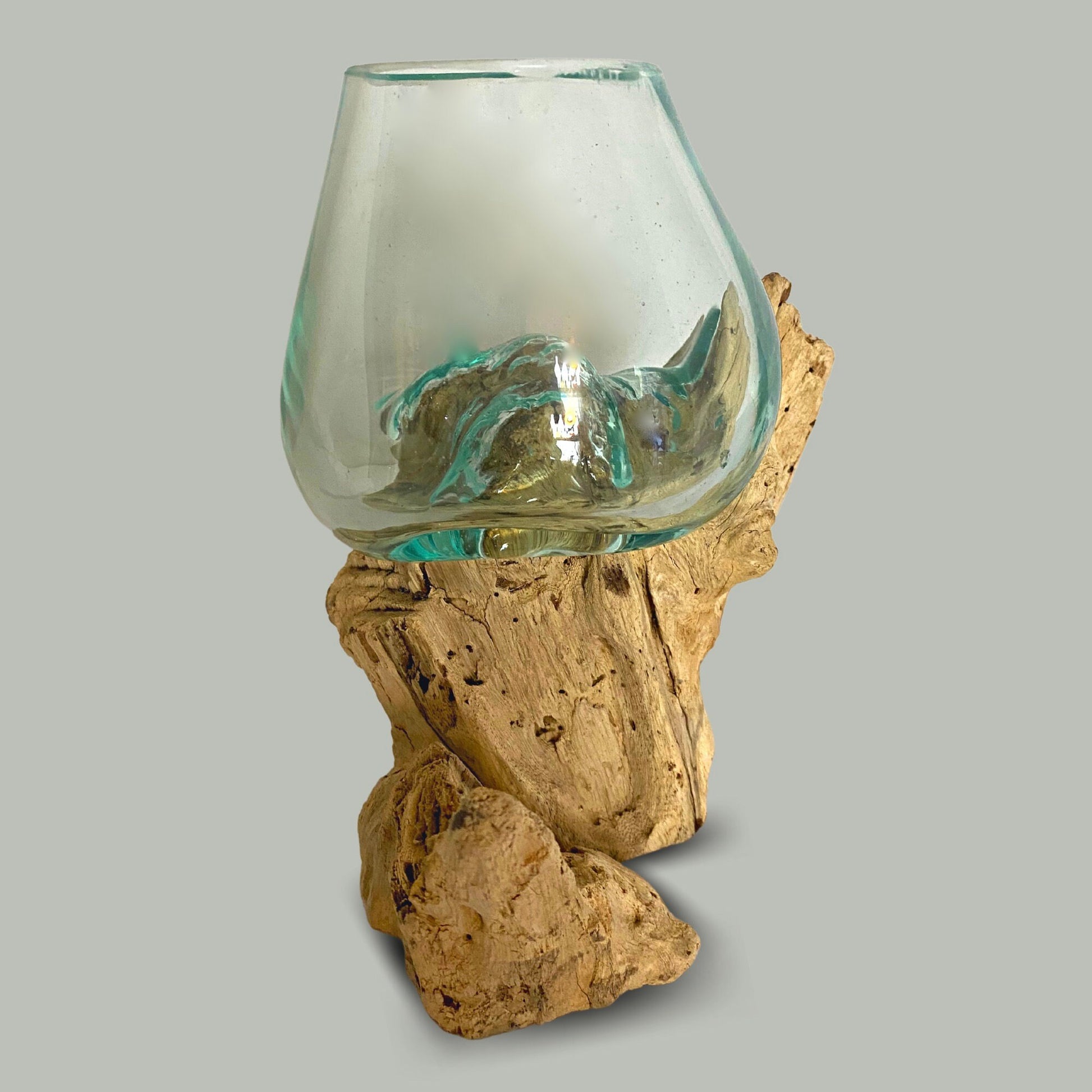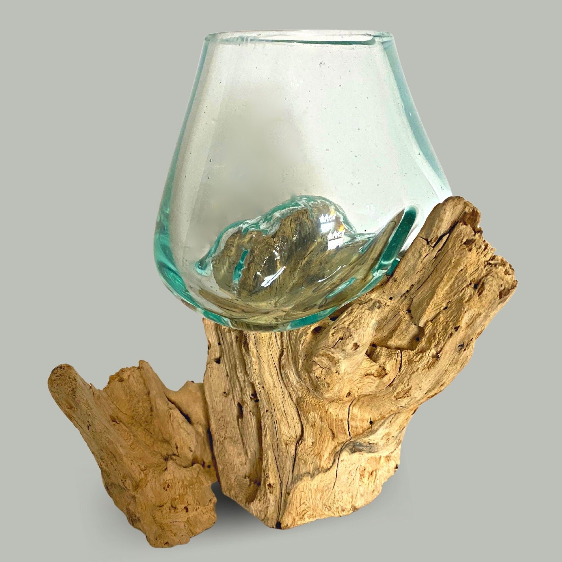 Unique Hand Blown Slumped Glass Bowl Vase Plant Cutting Rooter, crafted from mouth blown slumped glass by talented glass artist on the island of Bali. Recycled molten glass is slumped over the top of a reclaimed teak root base. This forms a unique glass scape in the bottom of each glass vessel as the molten glass drapes & it takes on the gnarly shape of the wood.