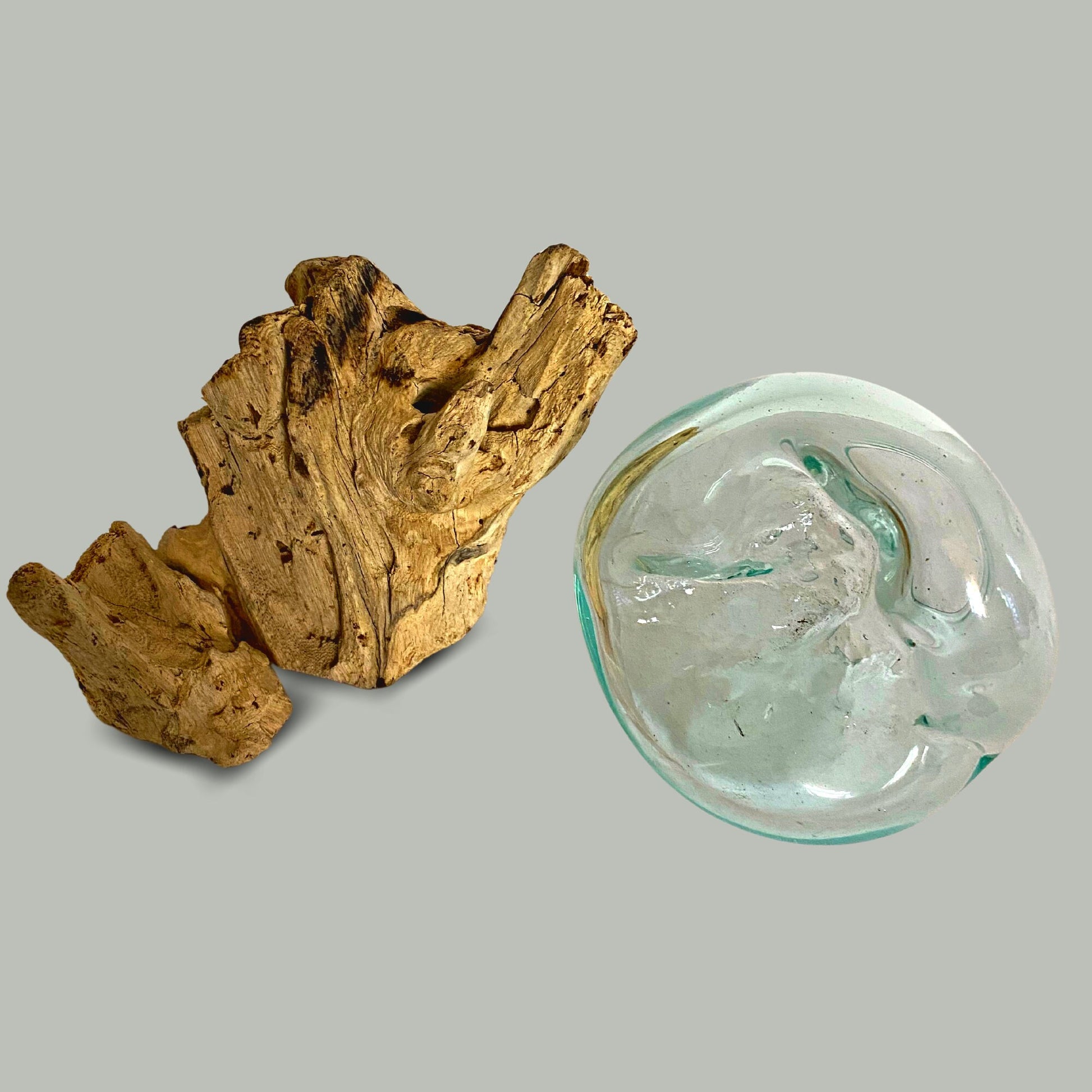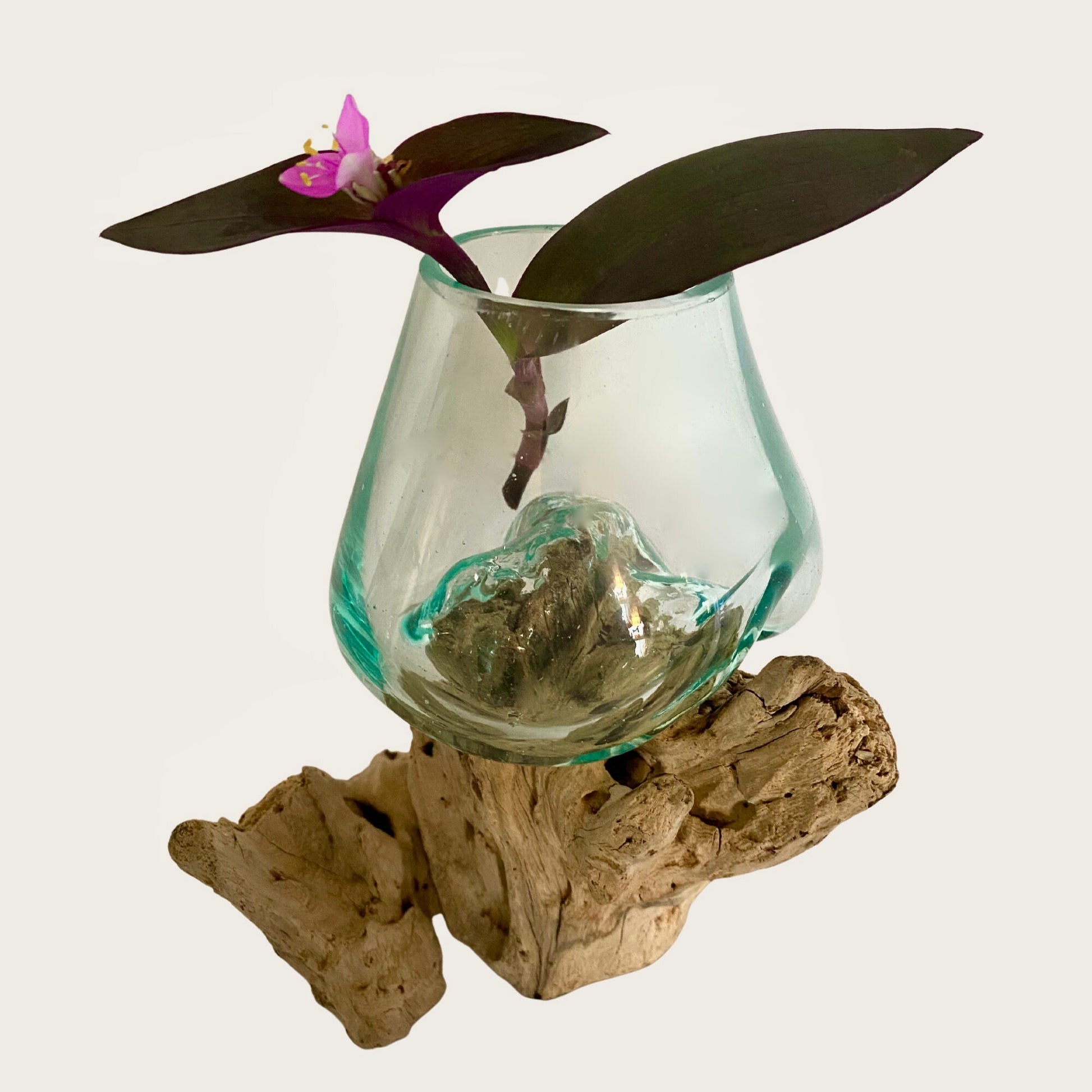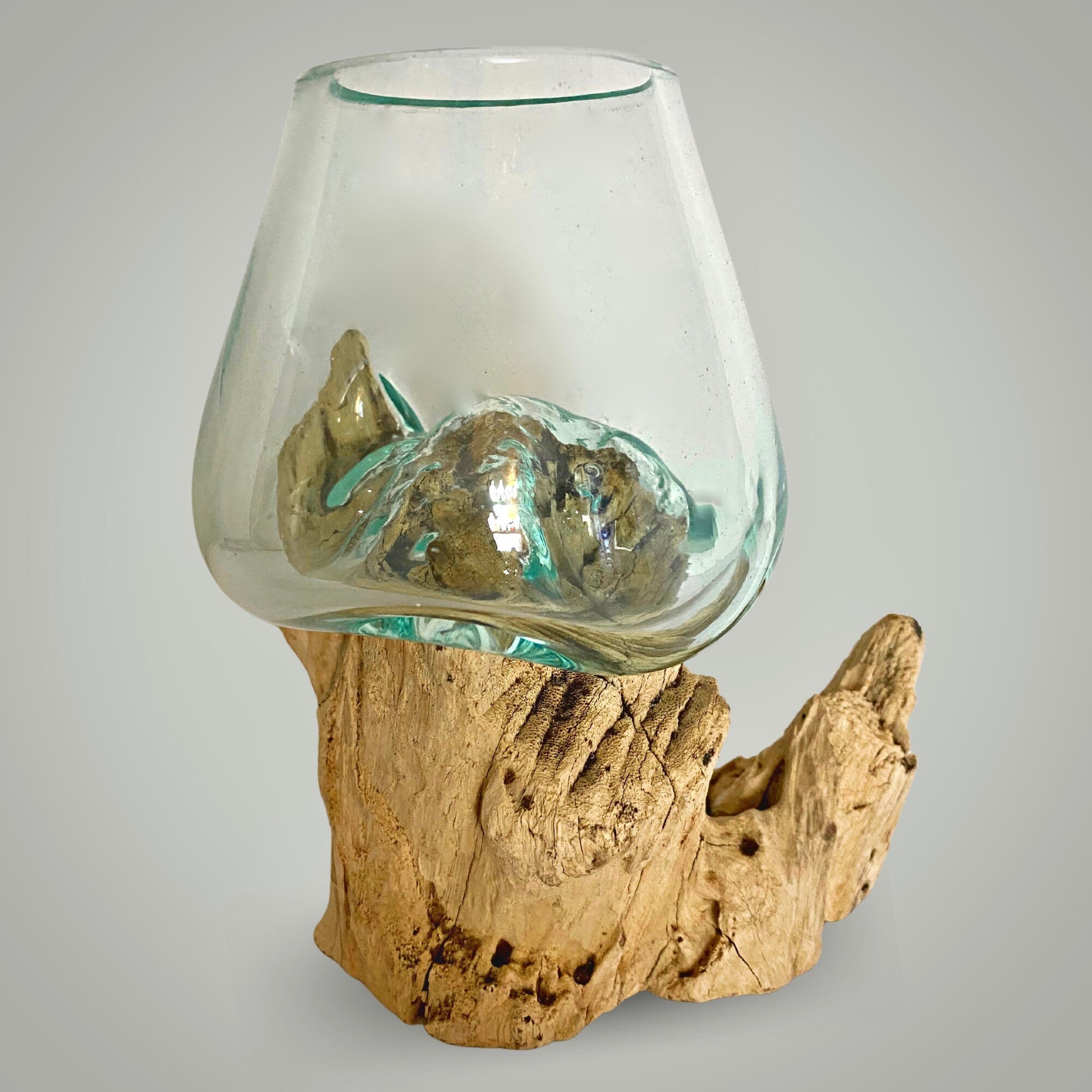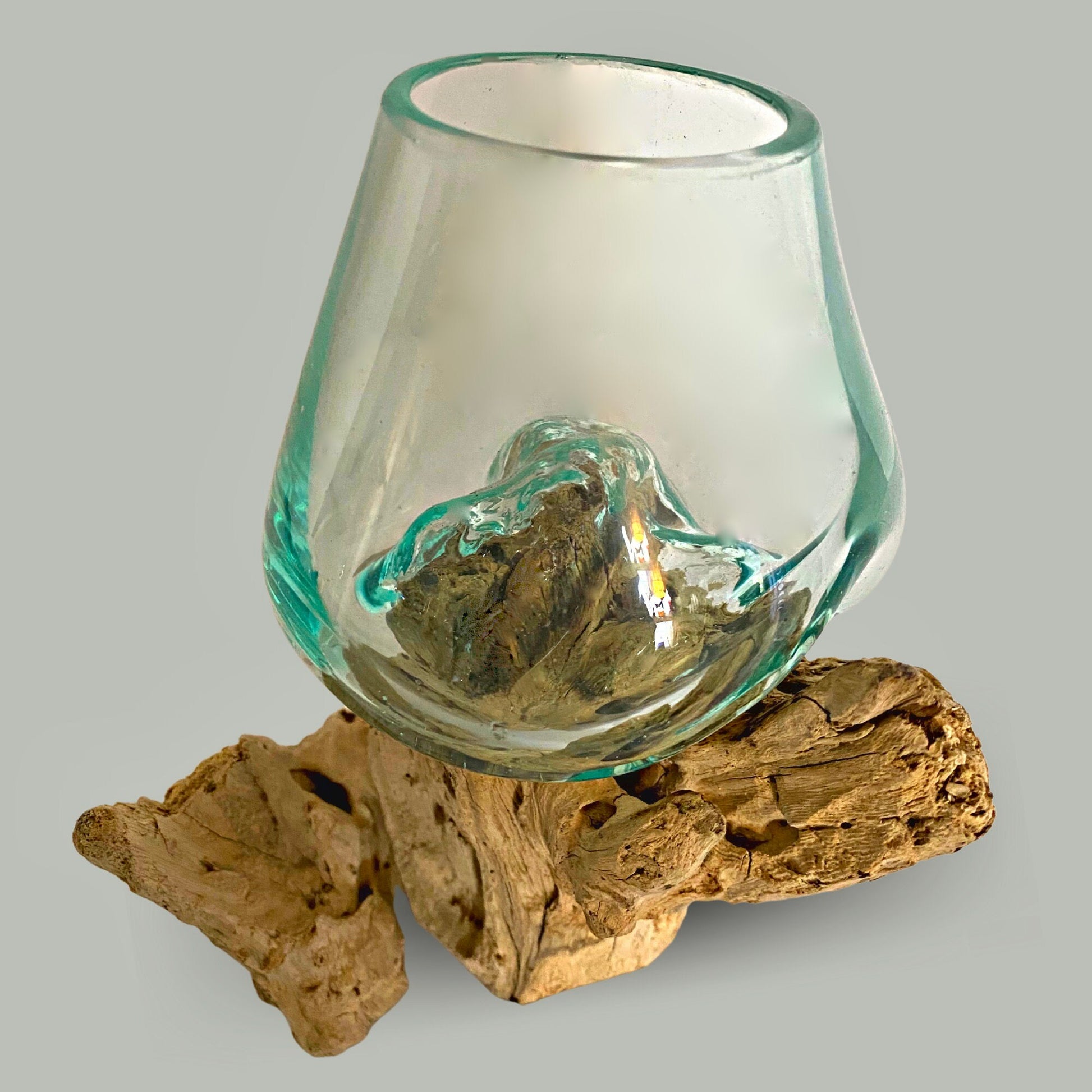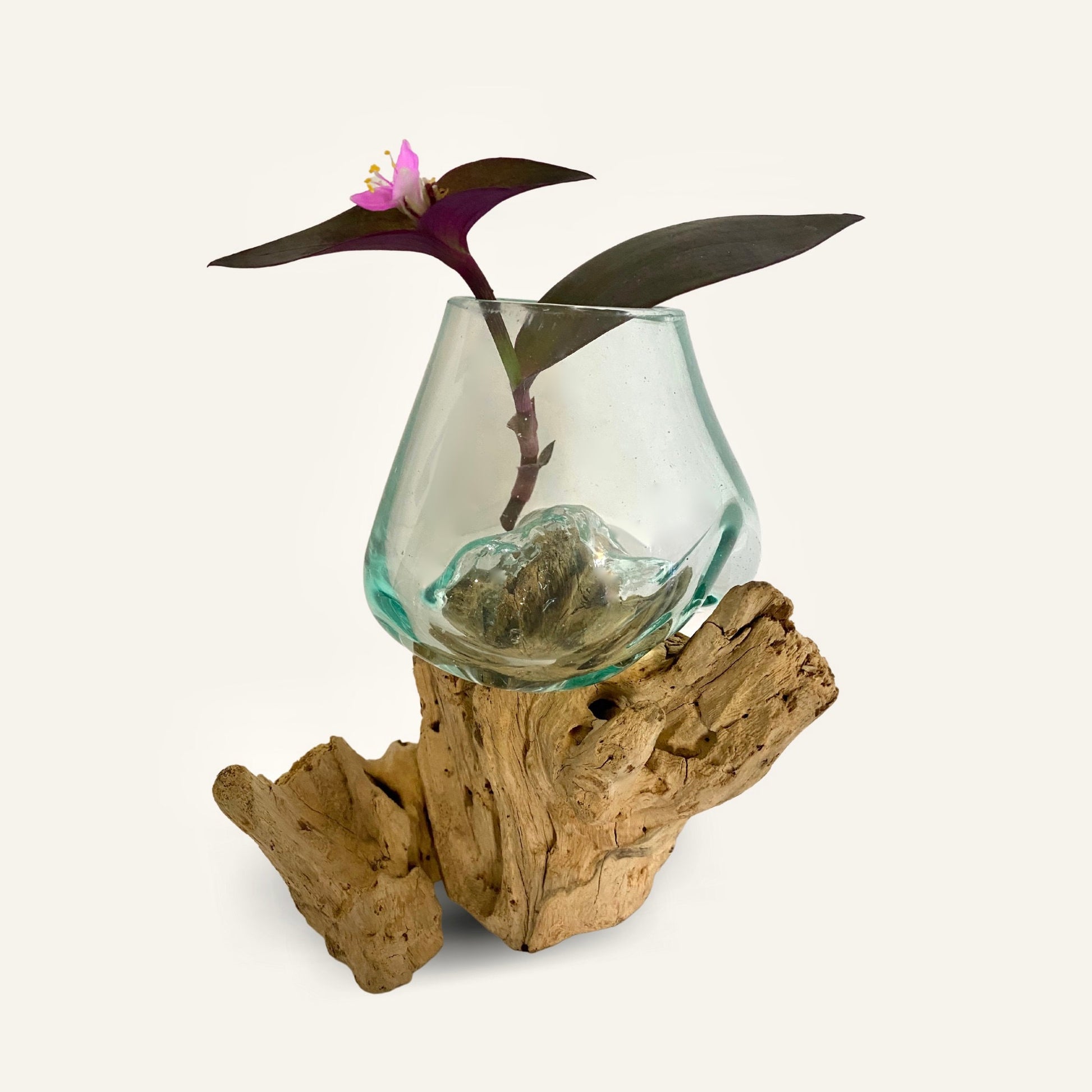 Unique Hand Blown Slumped Glass Bowl Vase Plant Cutting Rooter, crafted from mouth blown slumped glass by talented glass artist on the island of Bali. Recycled molten glass is slumped over the top of a reclaimed teak root base. This forms a unique glass scape in the bottom of each glass vessel as the molten glass drapes & it takes on the gnarly shape of the wood.