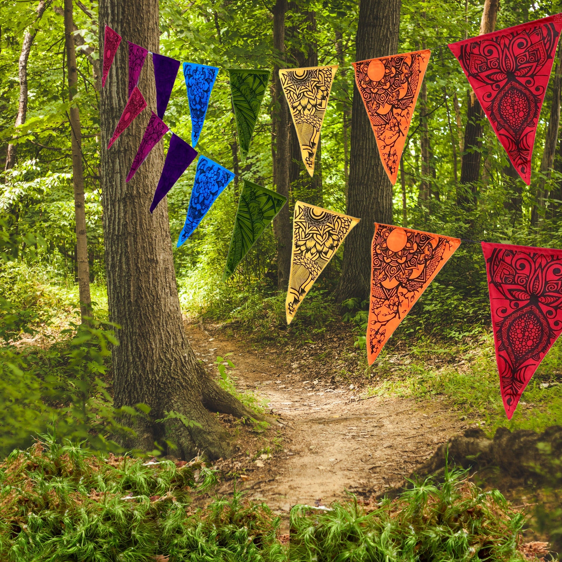 The edges of each triangular flag are finished in a smooth nichi sewn edge for a finish that will not ravel or fray. Where ever you decide to hang this beautiful work of art it will look amazing and provide you with years of pleasure. You may machine wash in cold water on a gentle cycle and hang to dry, or dry on a cool cycle in your dryer.