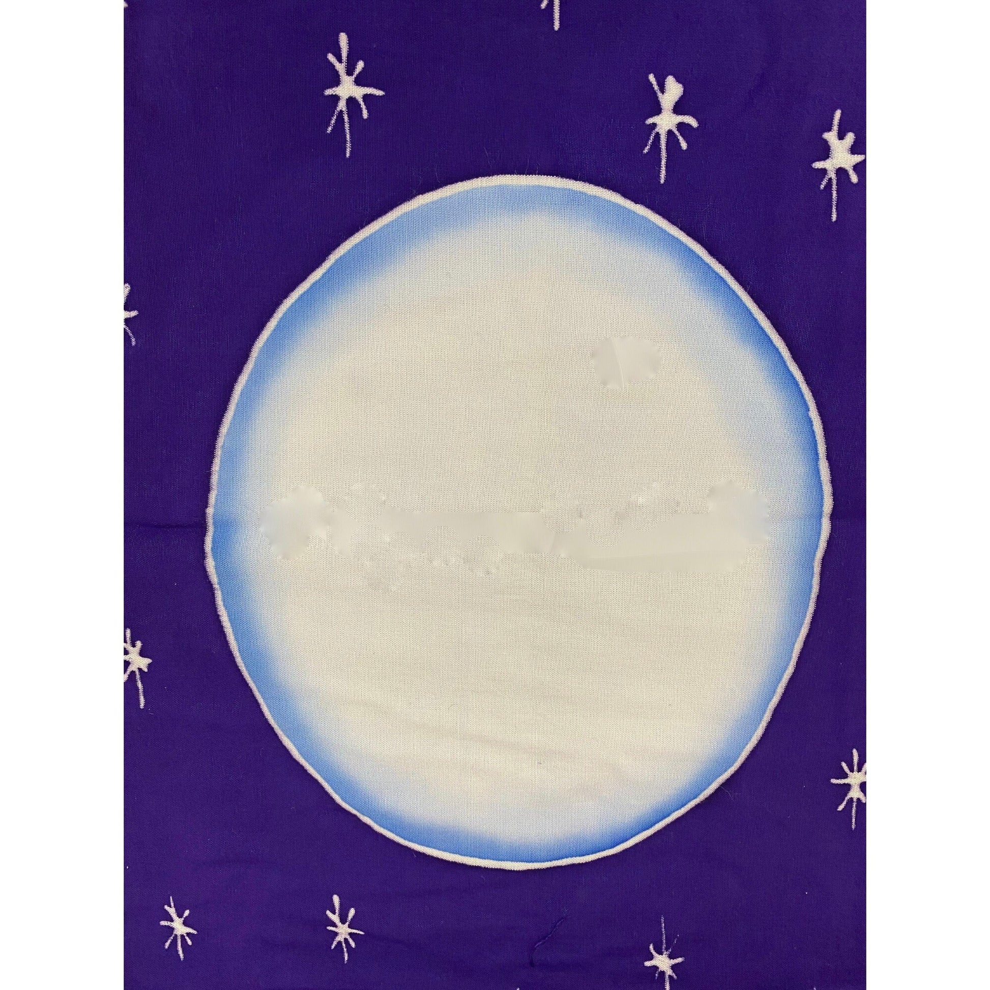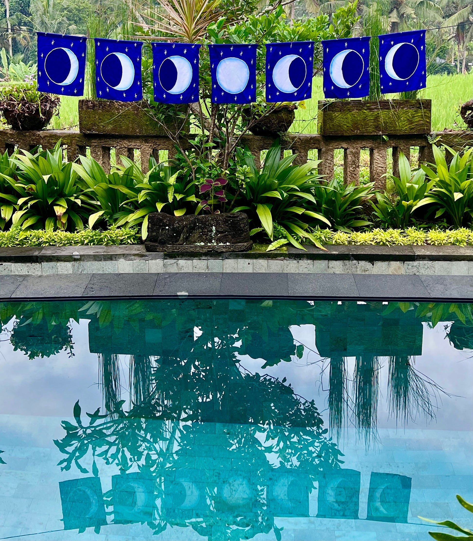 Hand painted Deep blue batik Moon Phase prayer flag string are all completely hand crafted on the Island of Bali. Each flag is painstakingly hand batik-ed by a group of Balinese Ladies in the Ubud Area.
