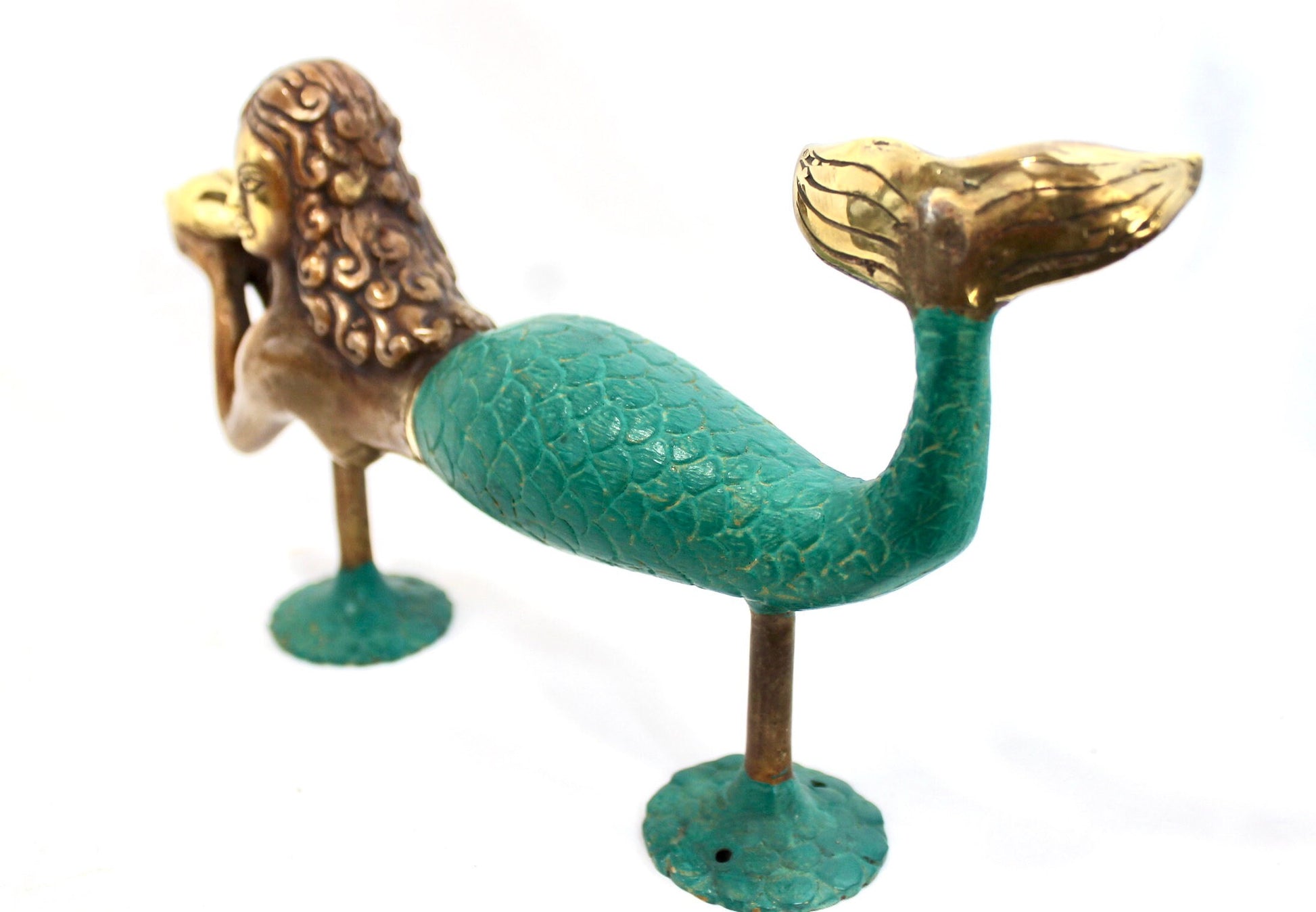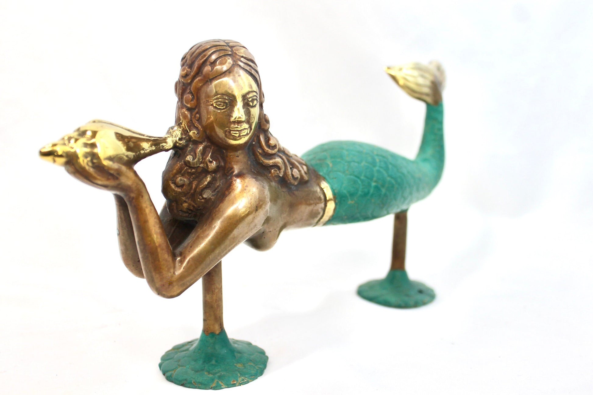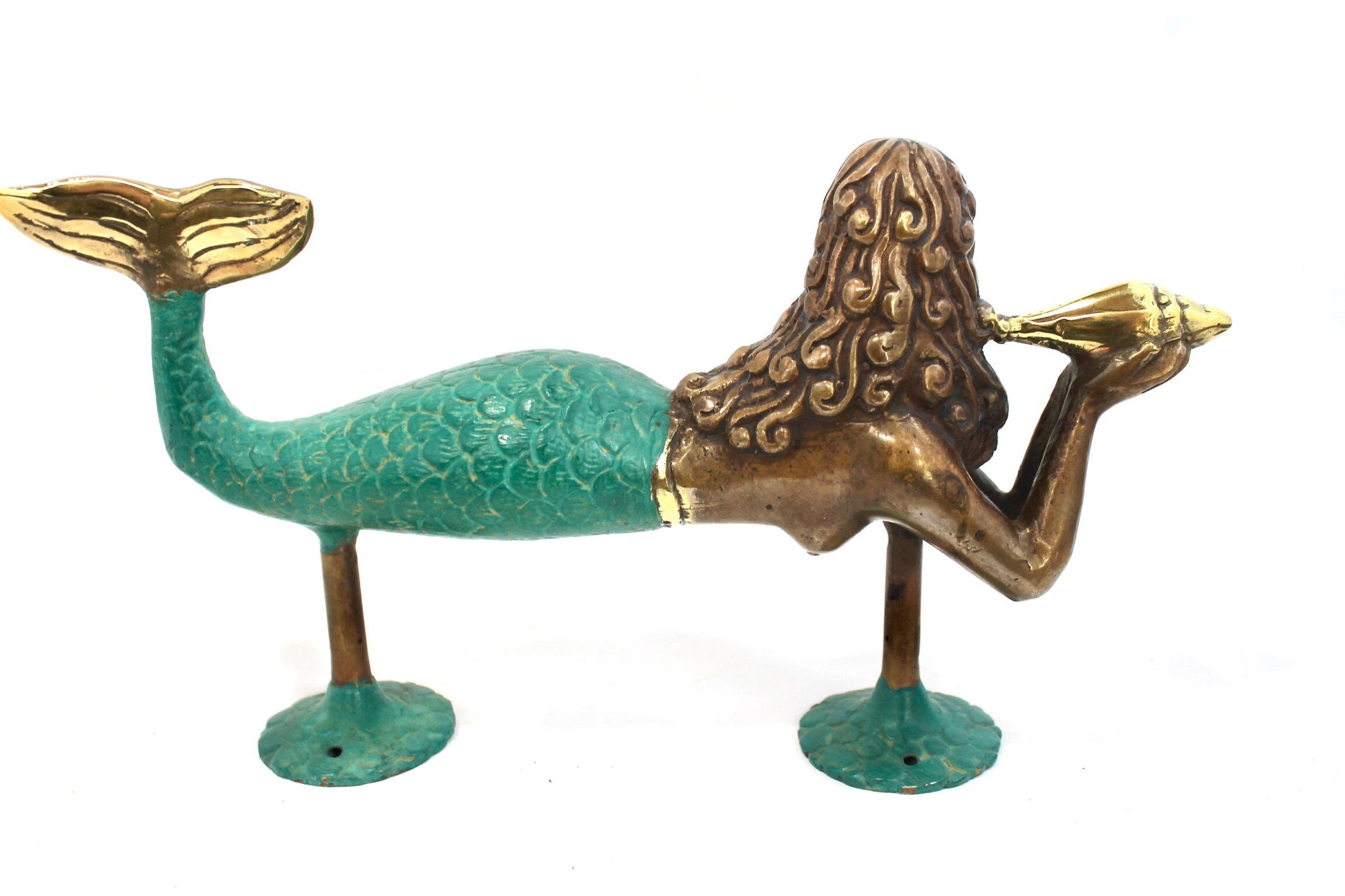Beautiful Mermaid Goddess with conch shell door handle is hand cast from solid bronze. A beautiful green verdigris patina has been applied to her tail, she has an aged patina on her body, with her hair the other accents polished.