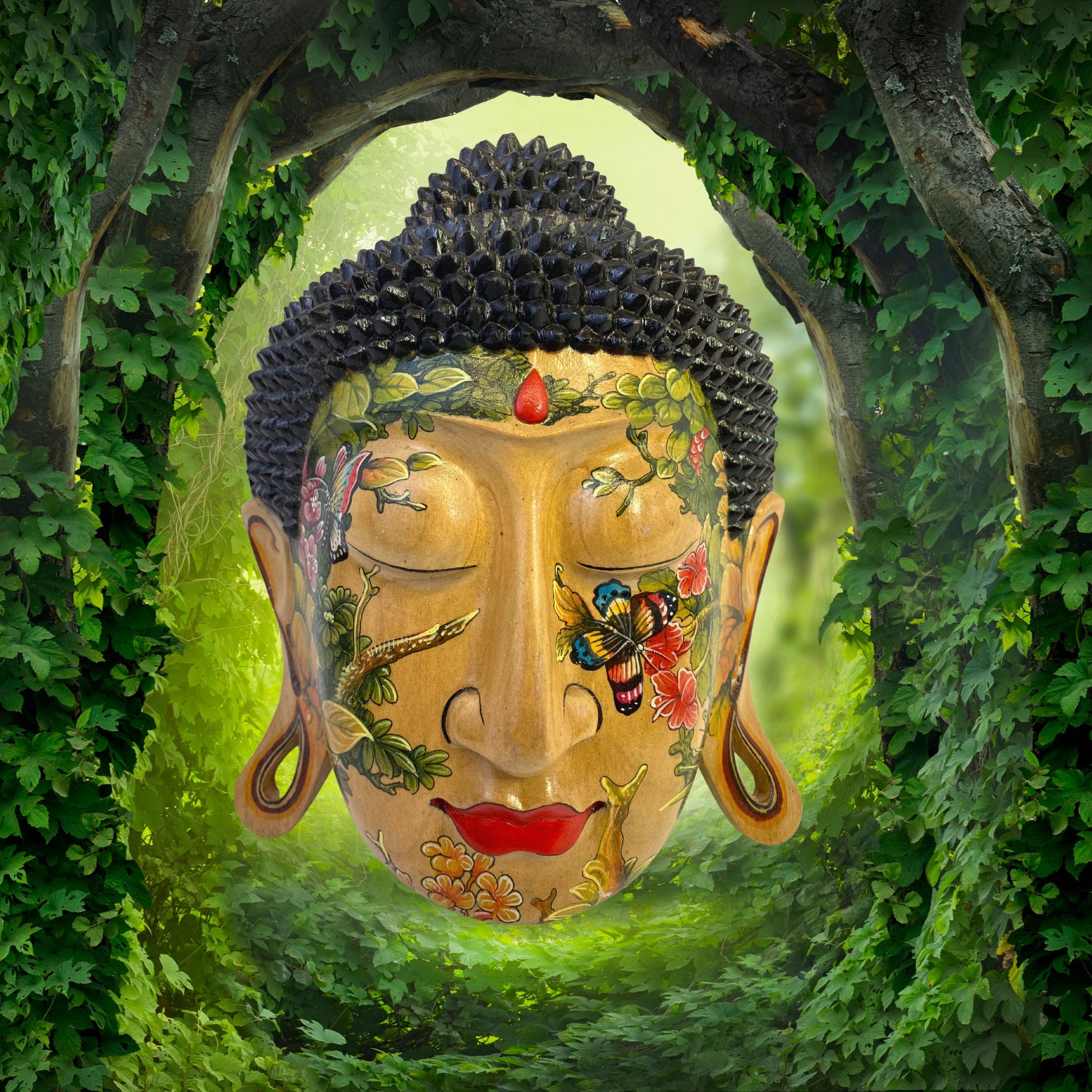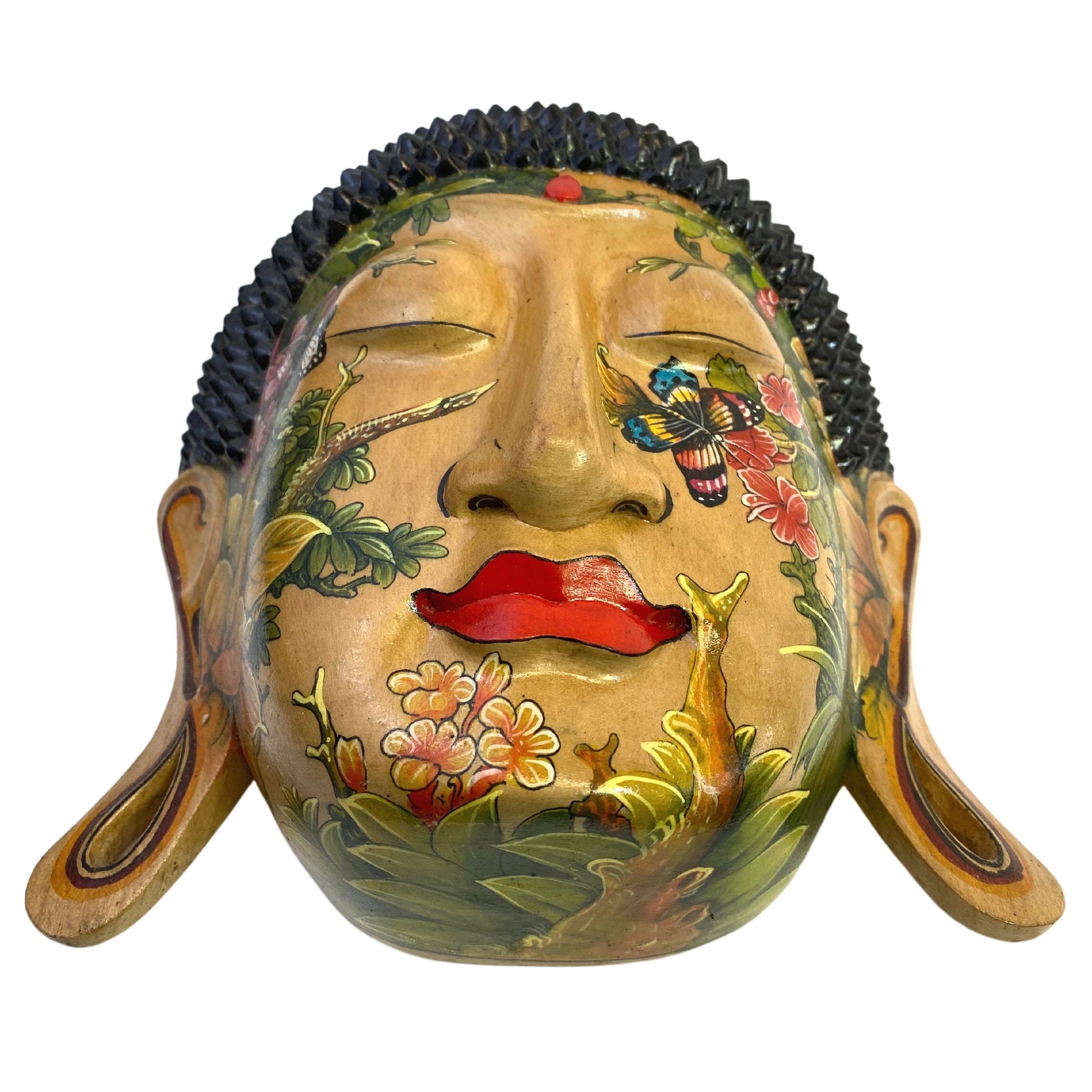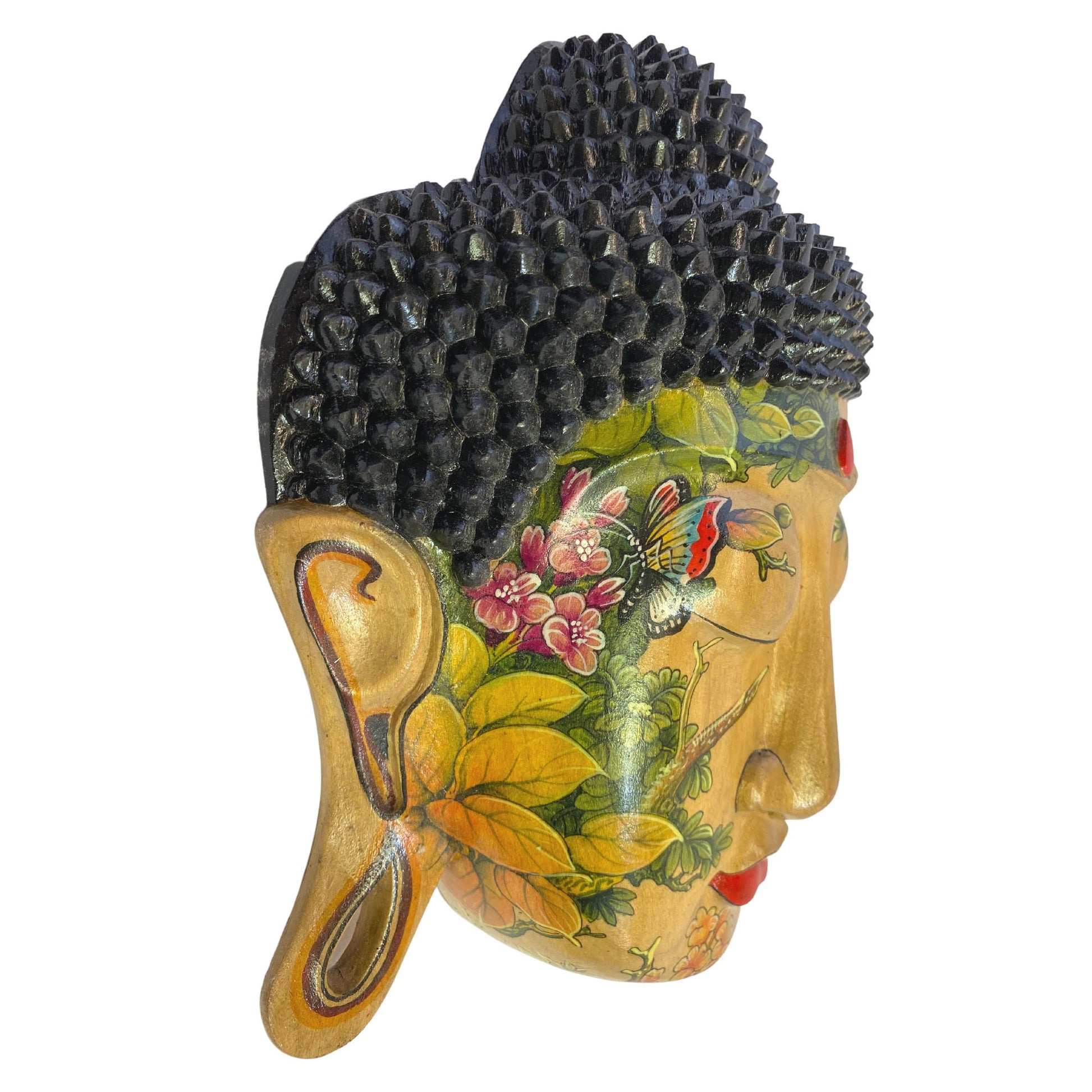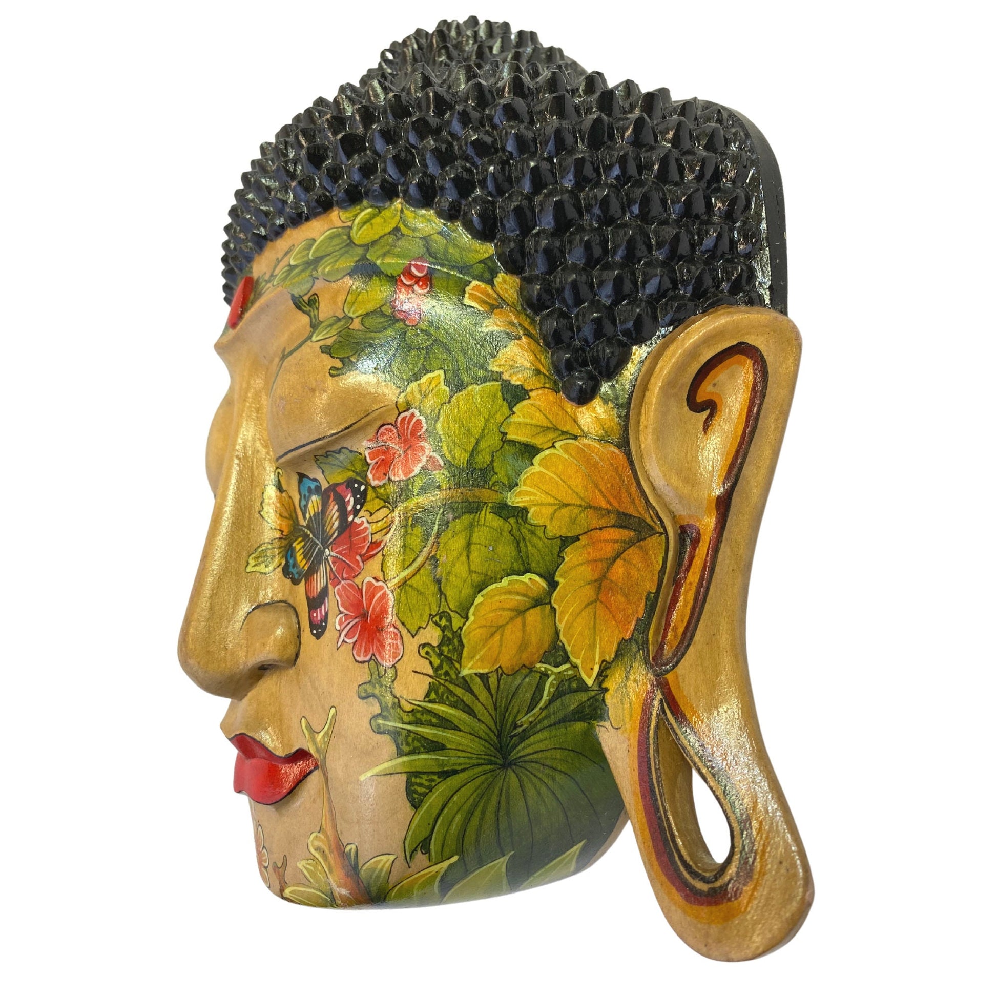 Mystic Buddha Mask Butterfly Garden Tattoo Wall art Sculpture Balinese miniature style painting Ubud village art hand painted wood carving
