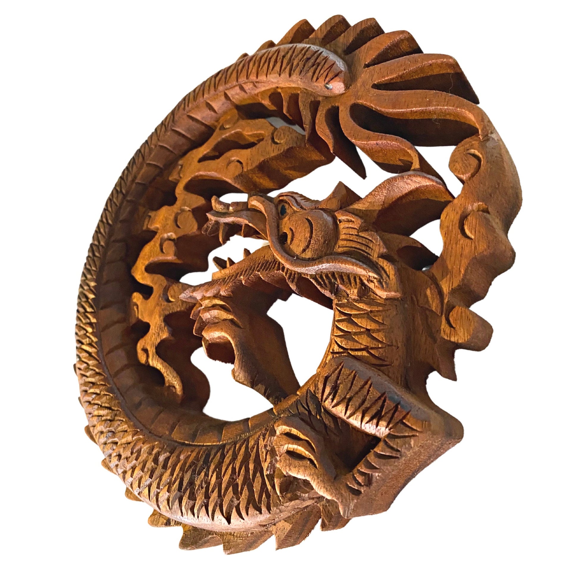 Balinese Dragon Round Hand Carved Wood Panel, highly detailed carved from sustainable suar wood in Bali by talented artisans using ages old techniques with simple hand tools. Stained and polished with a beautiful finish.