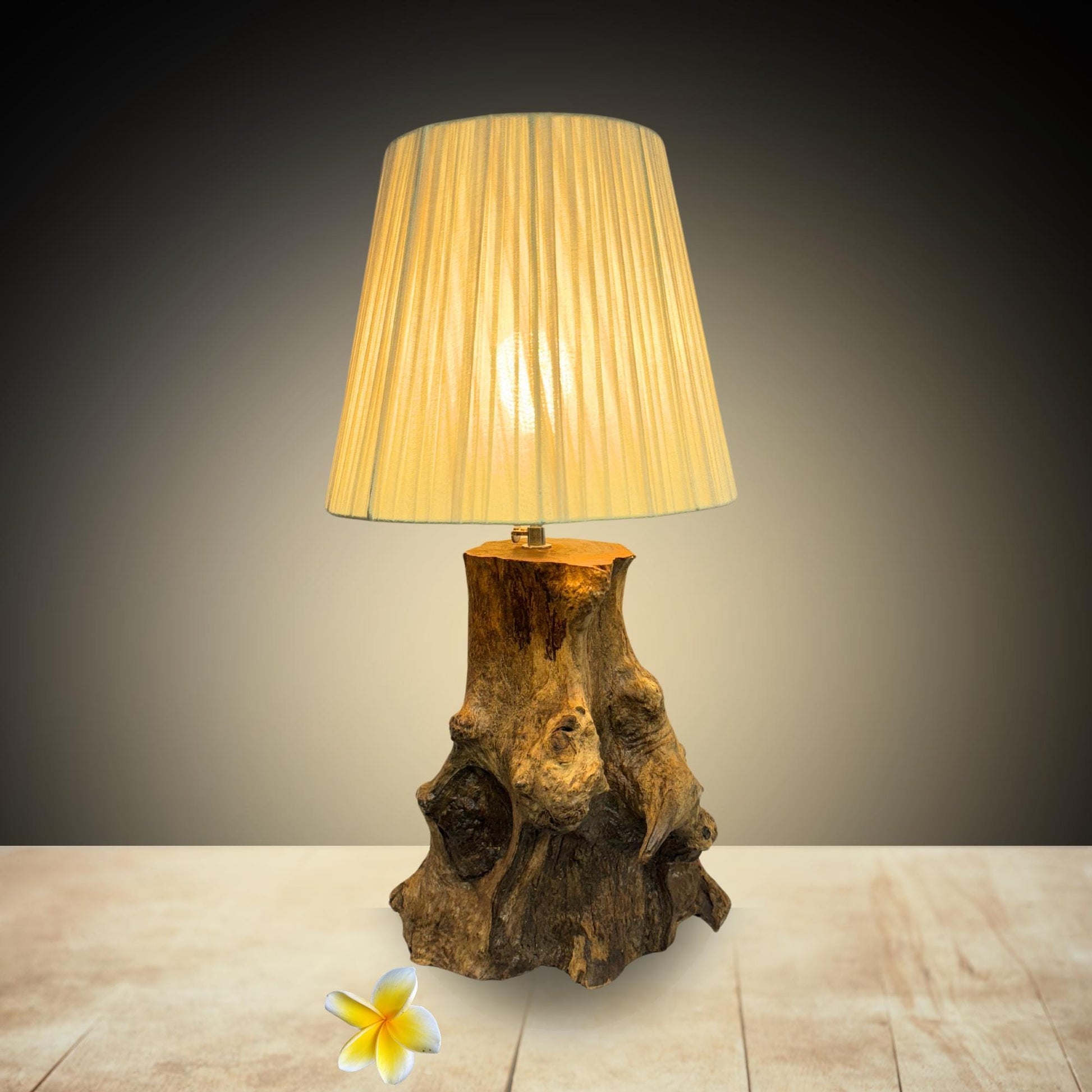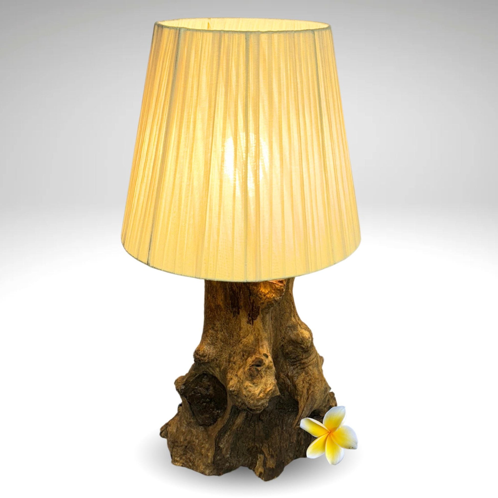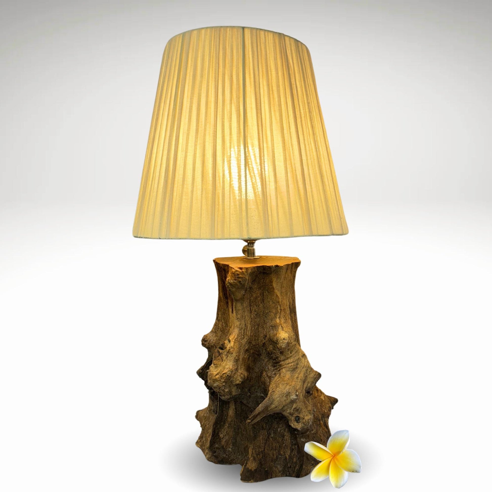 Natural Teak Fragment Table Lamp, hand crafted from a natural teak wood log chunk by Balinese craftsmen. The lamp base is left natural and waxed to show off the natural wood grain and shape of the wood which will match many color schemes. The shade is also handcrafted from hand woven creme colored cotton. Creates a beautiful warm ambiance that will add a glowing warmth to your funky eclectic decor.