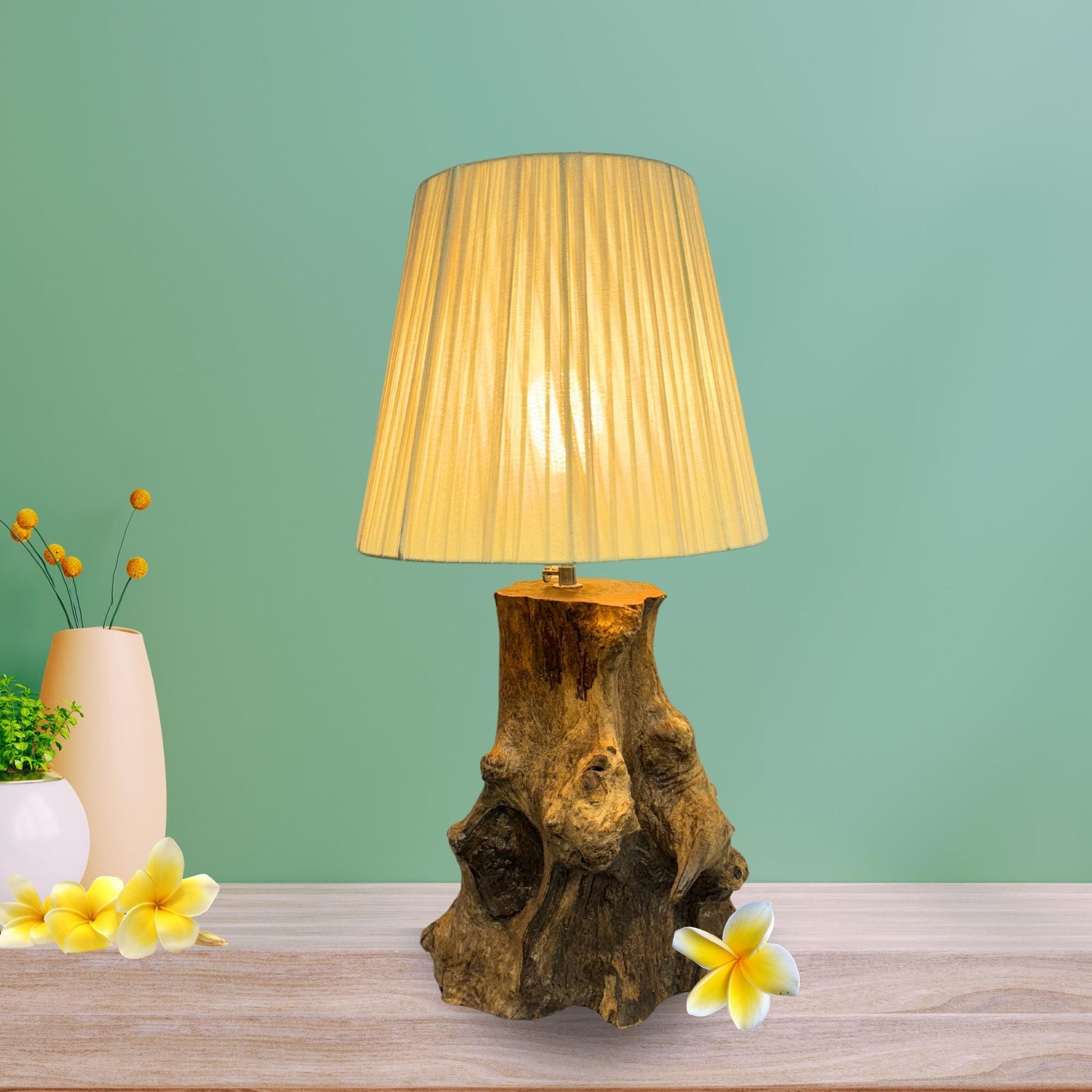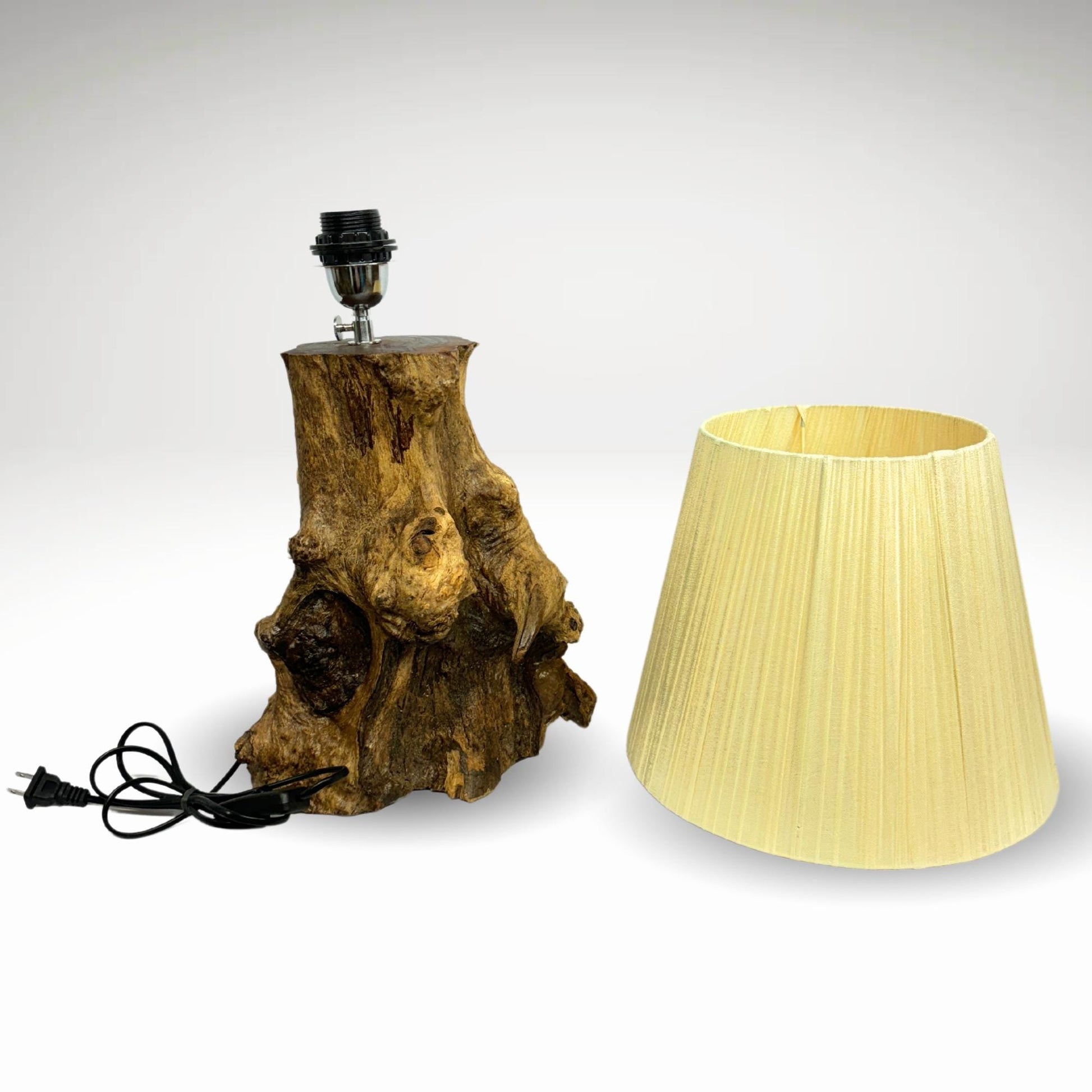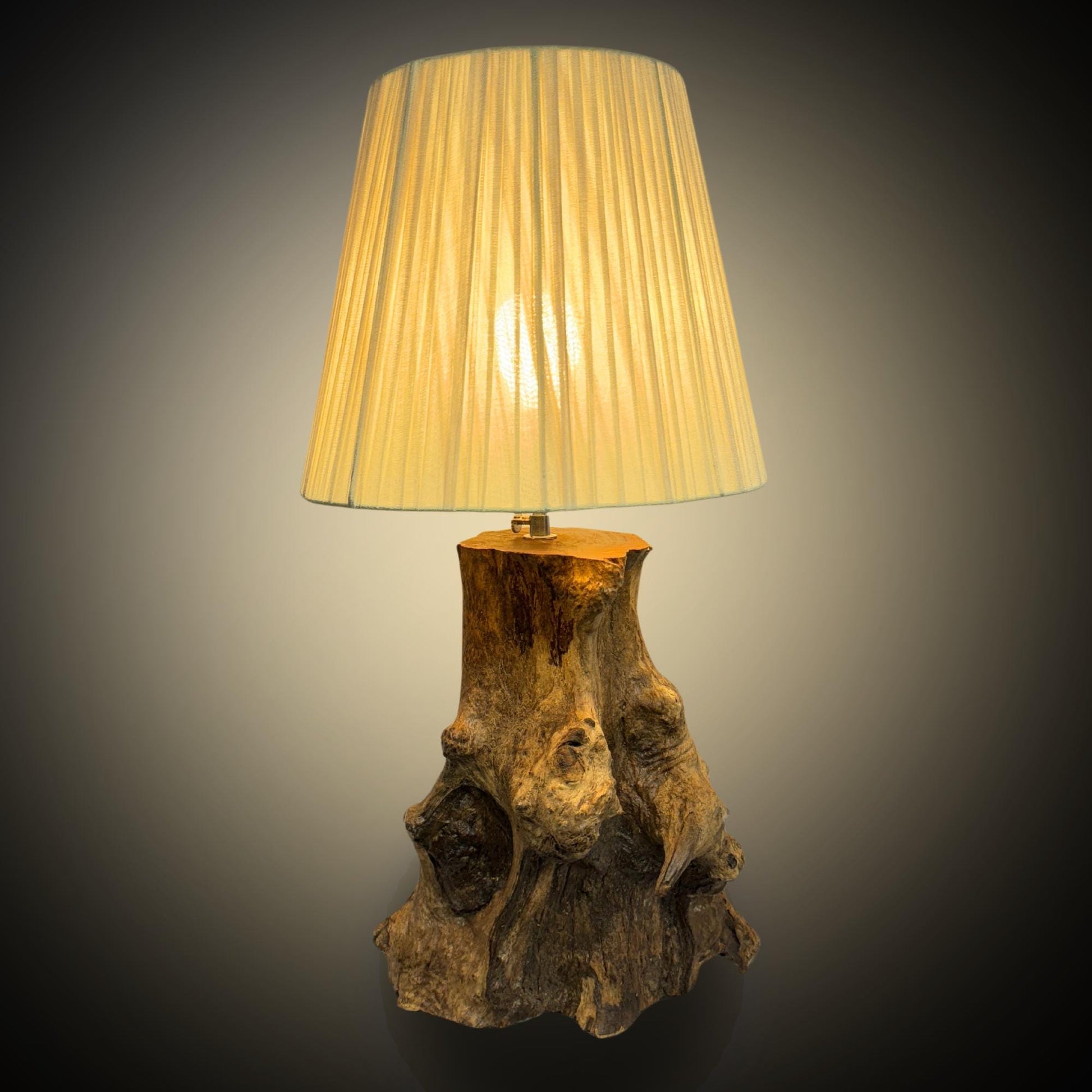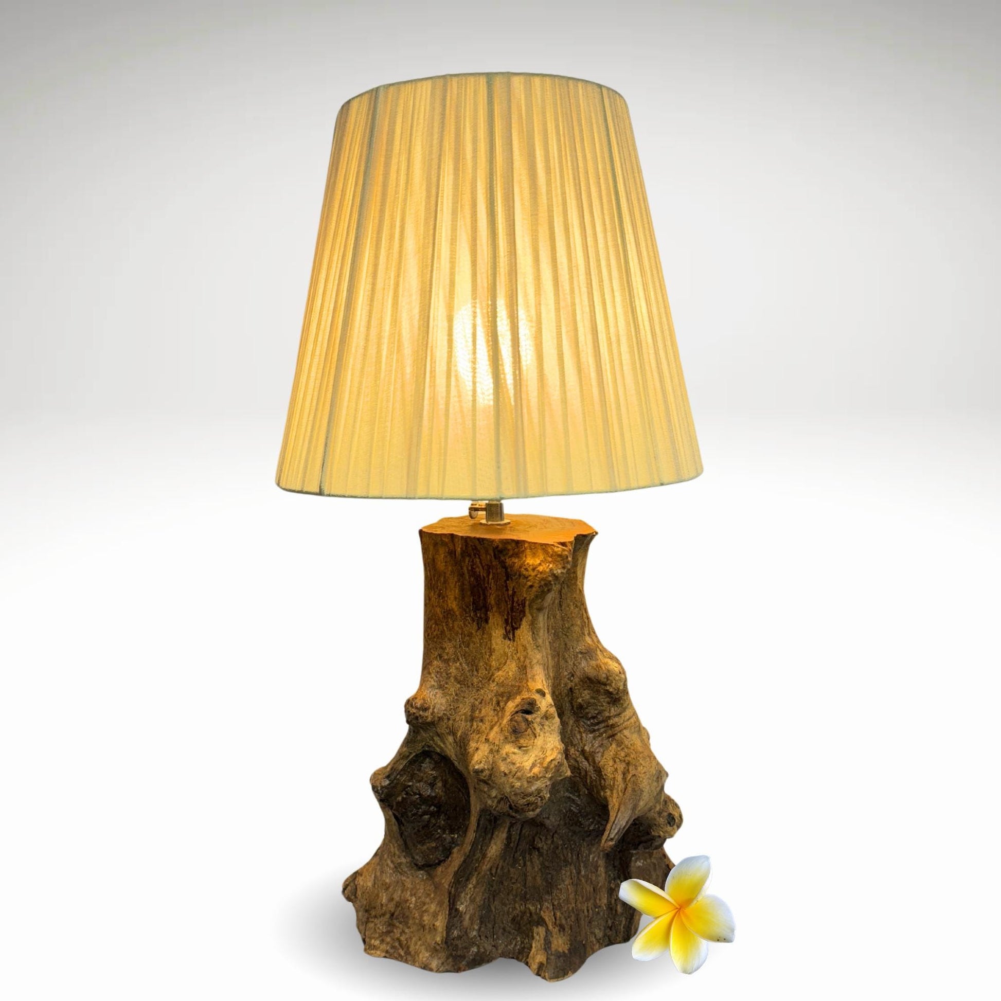 Natural Teak Fragment Table Lamp, hand crafted from a natural teak wood log chunk by Balinese craftsmen. The lamp base is left natural and waxed to show off the natural wood grain and shape of the wood which will match many color schemes. The shade is also handcrafted from hand woven creme colored cotton. Creates a beautiful warm ambiance that will add a glowing warmth to your funky eclectic decor.