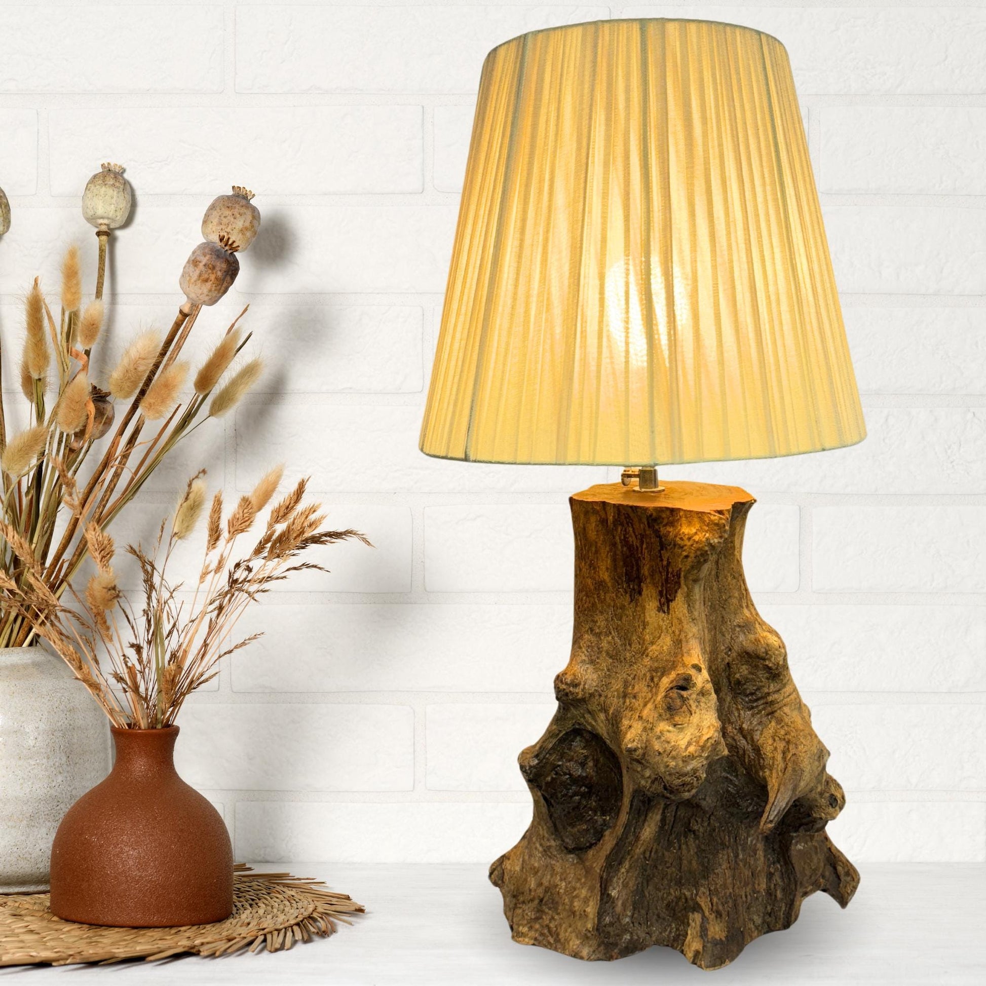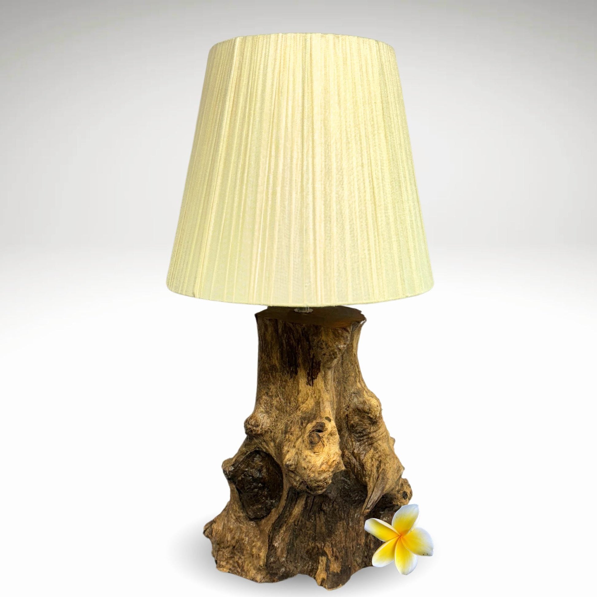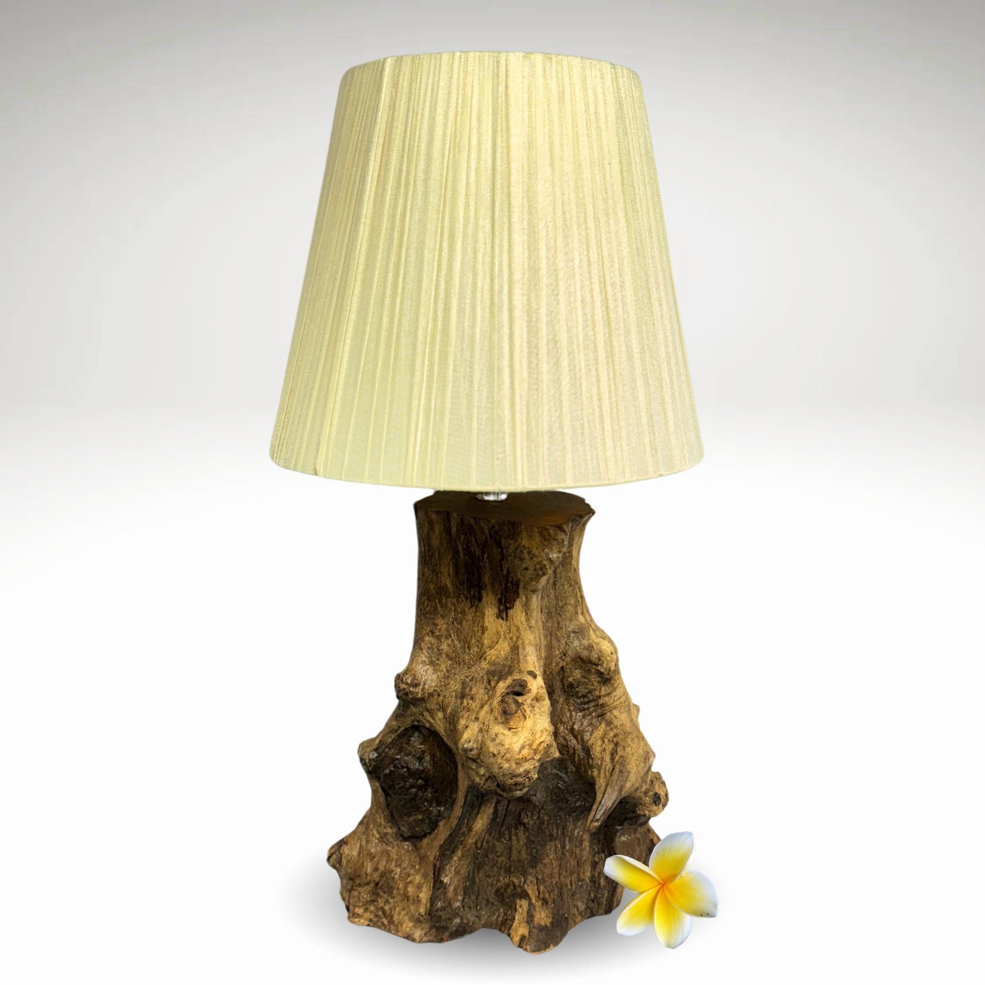 Natural Teak Fragment Table Lamp Hand Carved Reclaimed Wood Accent Lamp Natural Raffia Fiber Lamp Shade Boho Decor Handmade Bali Art