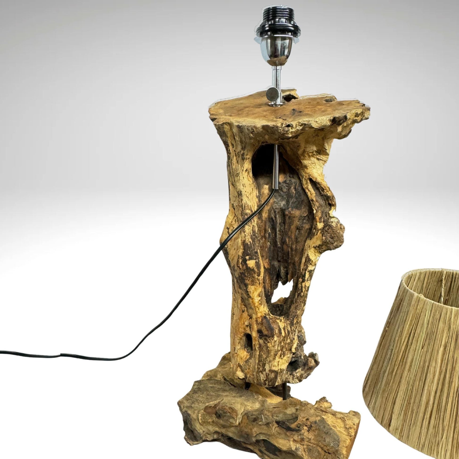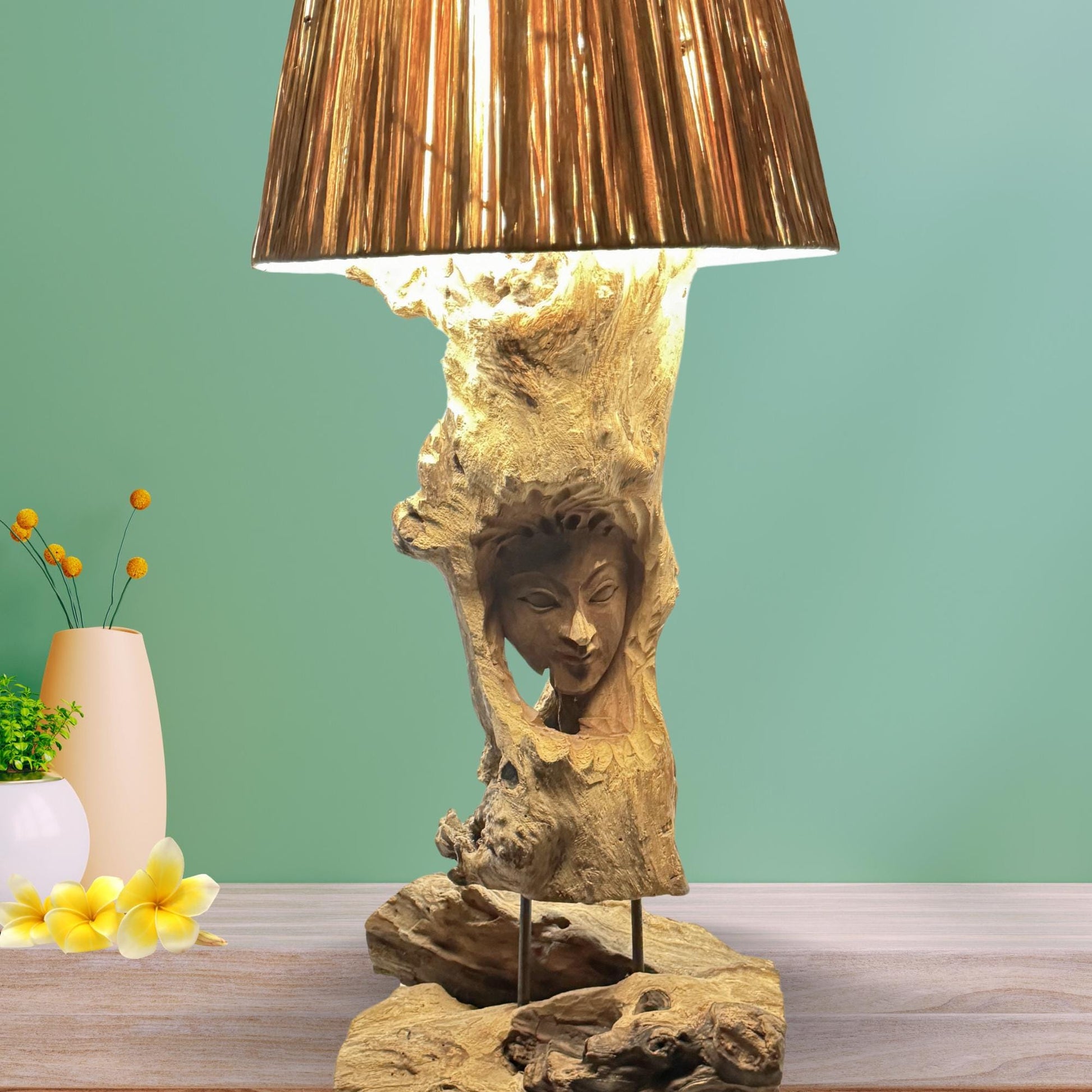 Nature Spirit Goddess Table Lamp Hand Carved Reclaimed Teak Wood Accent Lamp Natural Raffia Fiber Lamp Shade Boho Decor Handmade Bali Art
