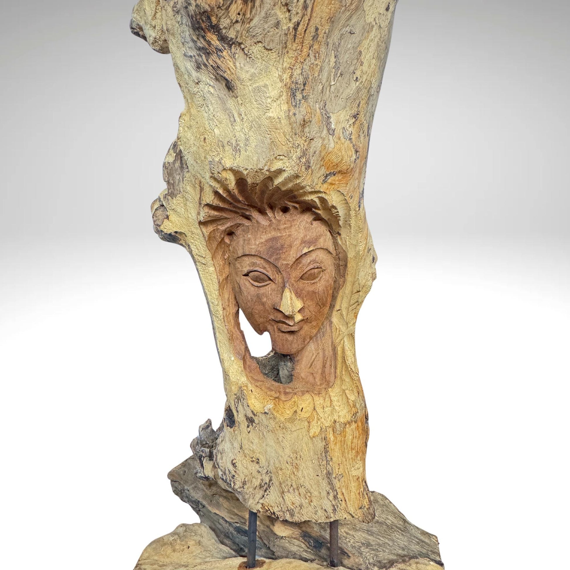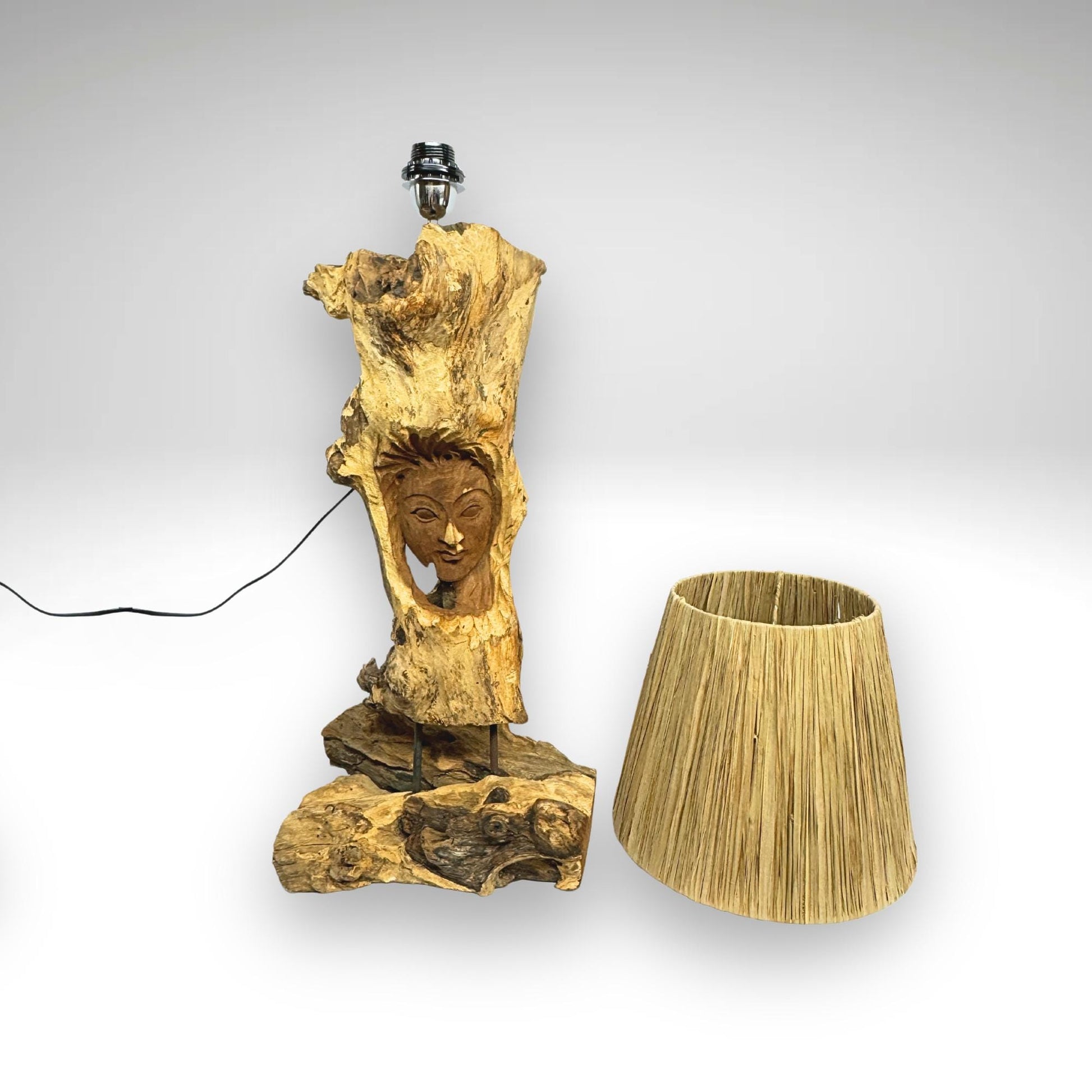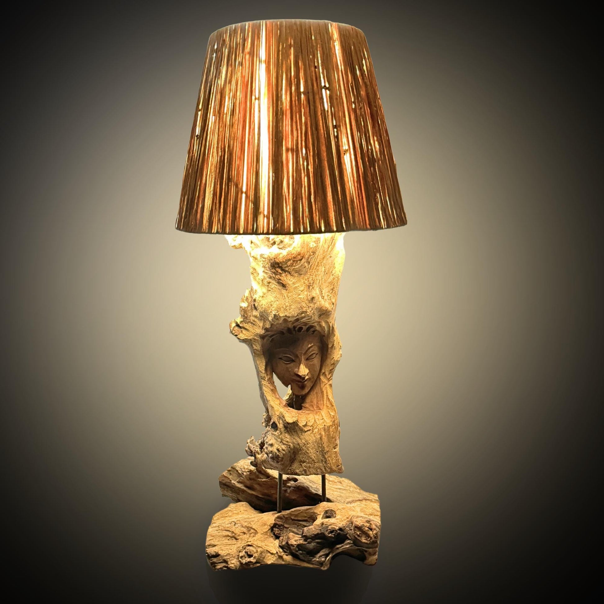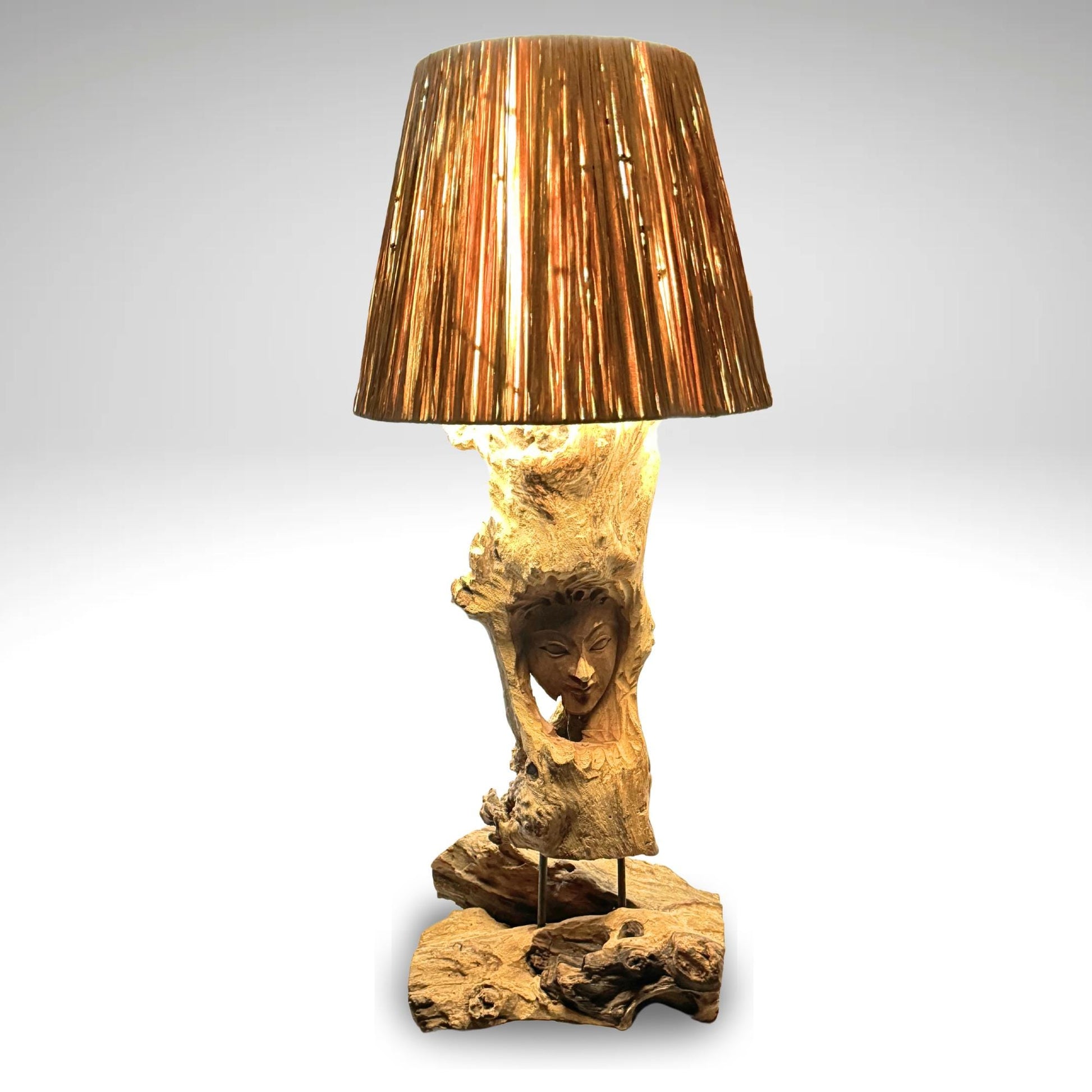 Hand Carved Teak Nature Spirit Goddess Table Lamp, hand carved from a natural teak wood chunk by Balinese craftsmen. The lamp base is left natural and waxed to show off the natural wood grain and carving which will match many color schemes. The shade is also handcrafted from raffia fiber which is harvested from local Indonesian palm trees. Creates a beautiful warm ambiance that will add a glowing warmth to your funky eclectic decor.