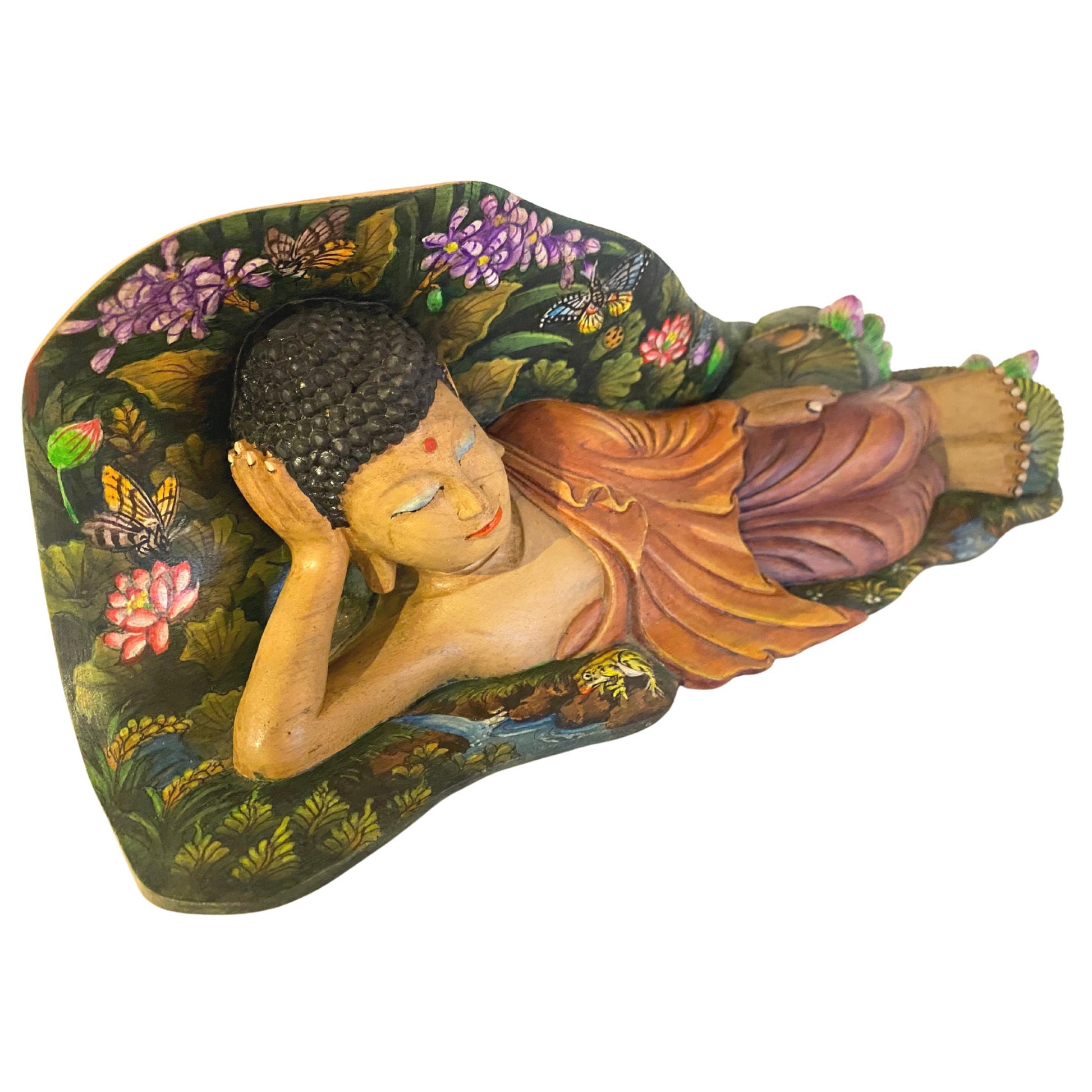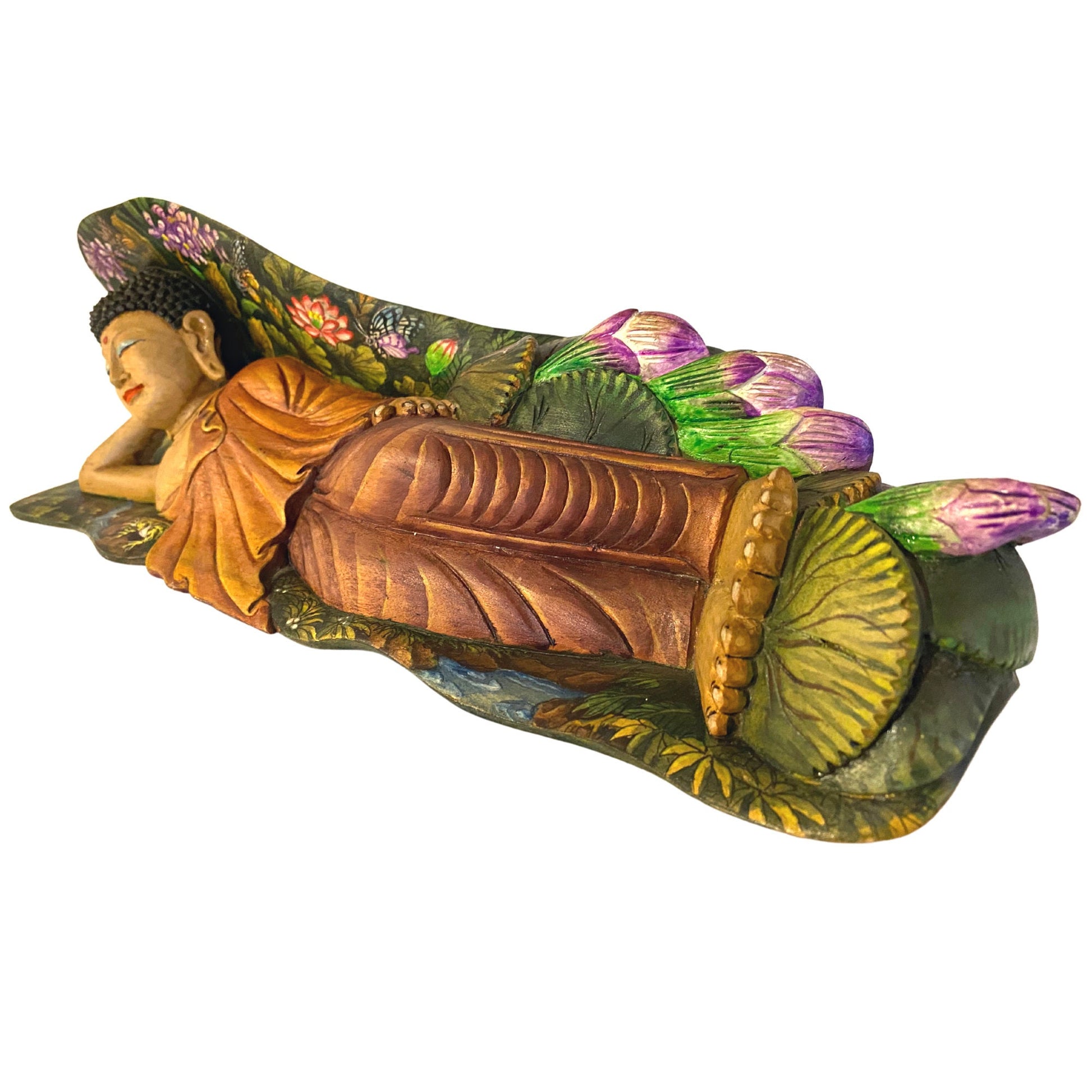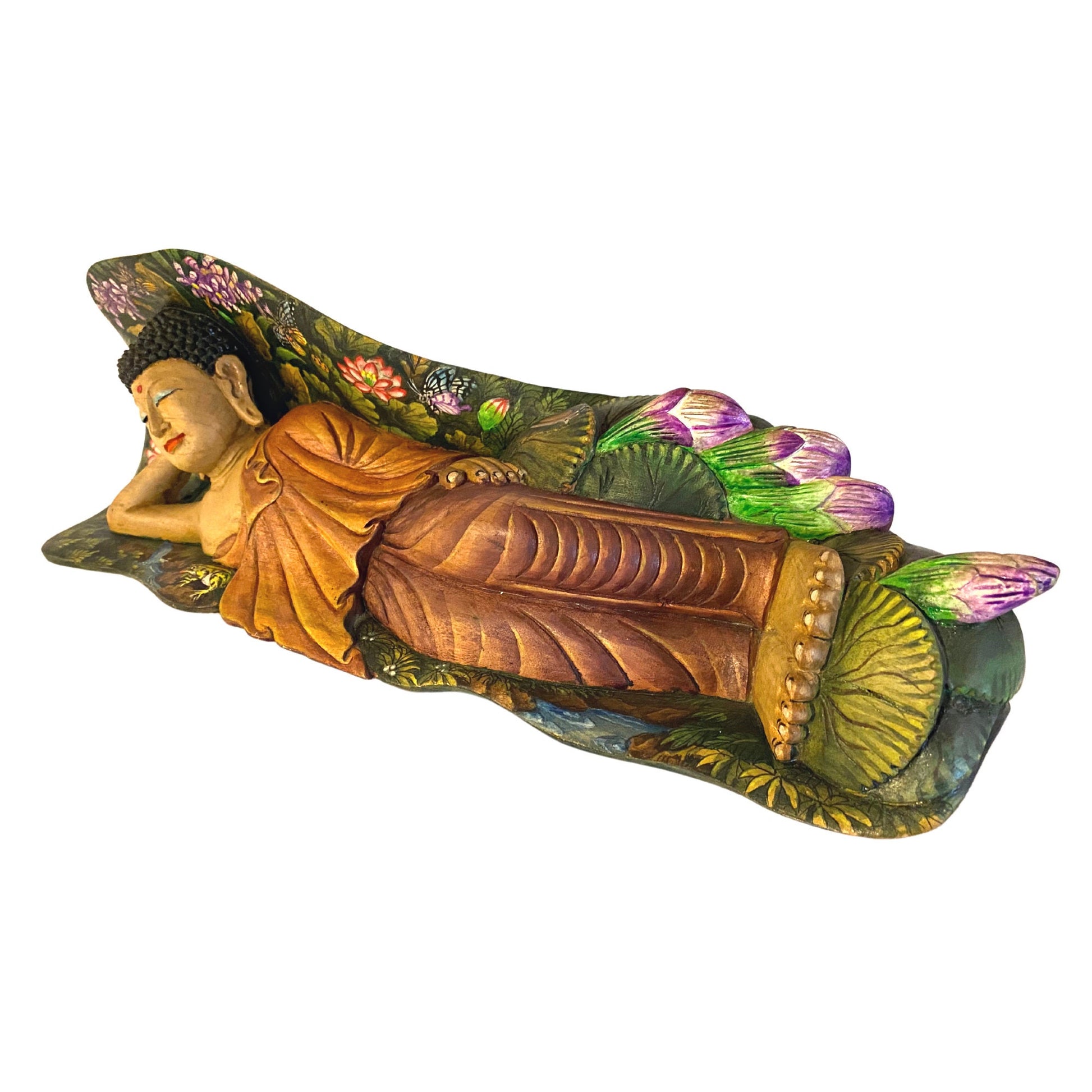 Nirvana Buddha Statue Resting In Repose Hand Painted & Carved Wood Sculpture Balinese Bali Buddhist Art wood carving