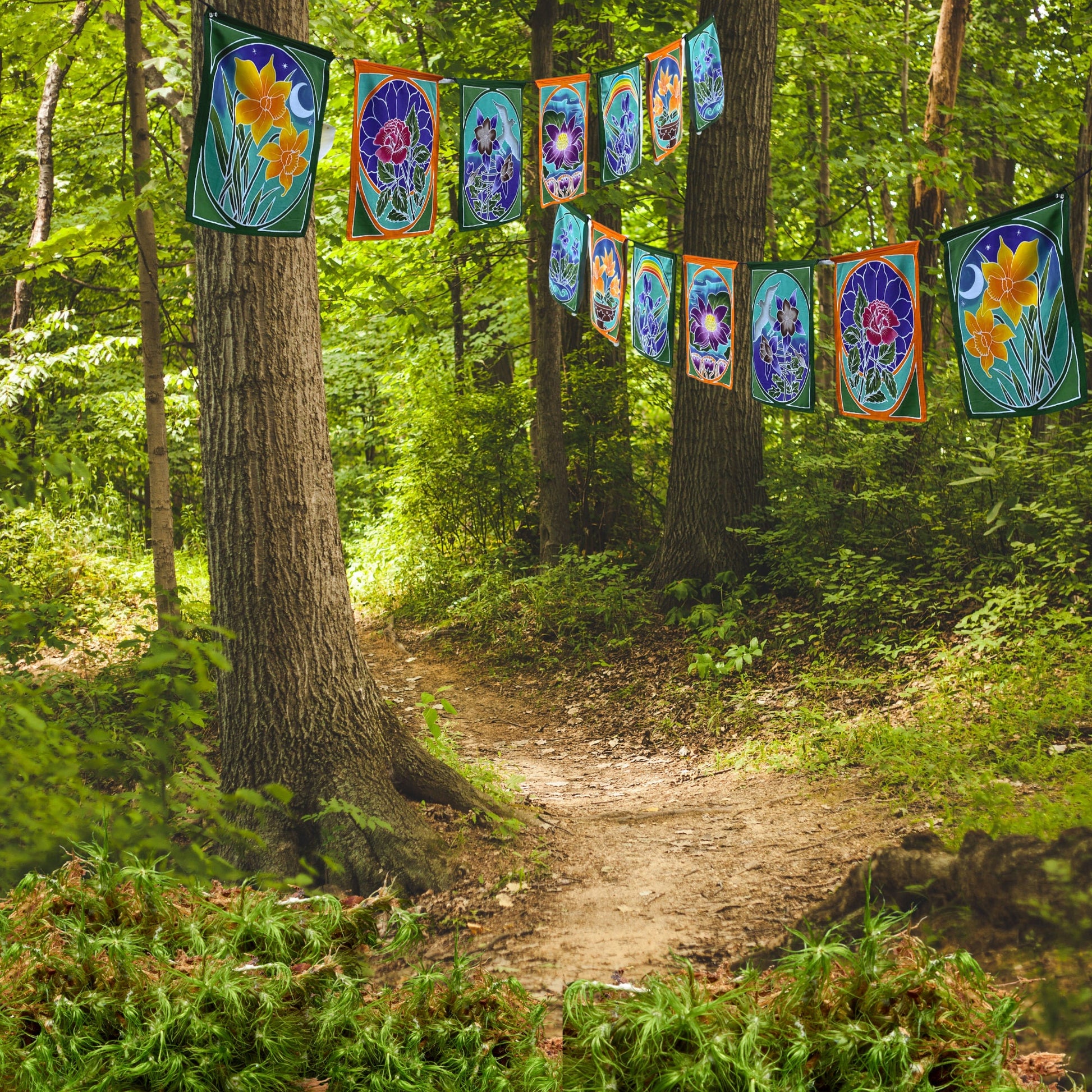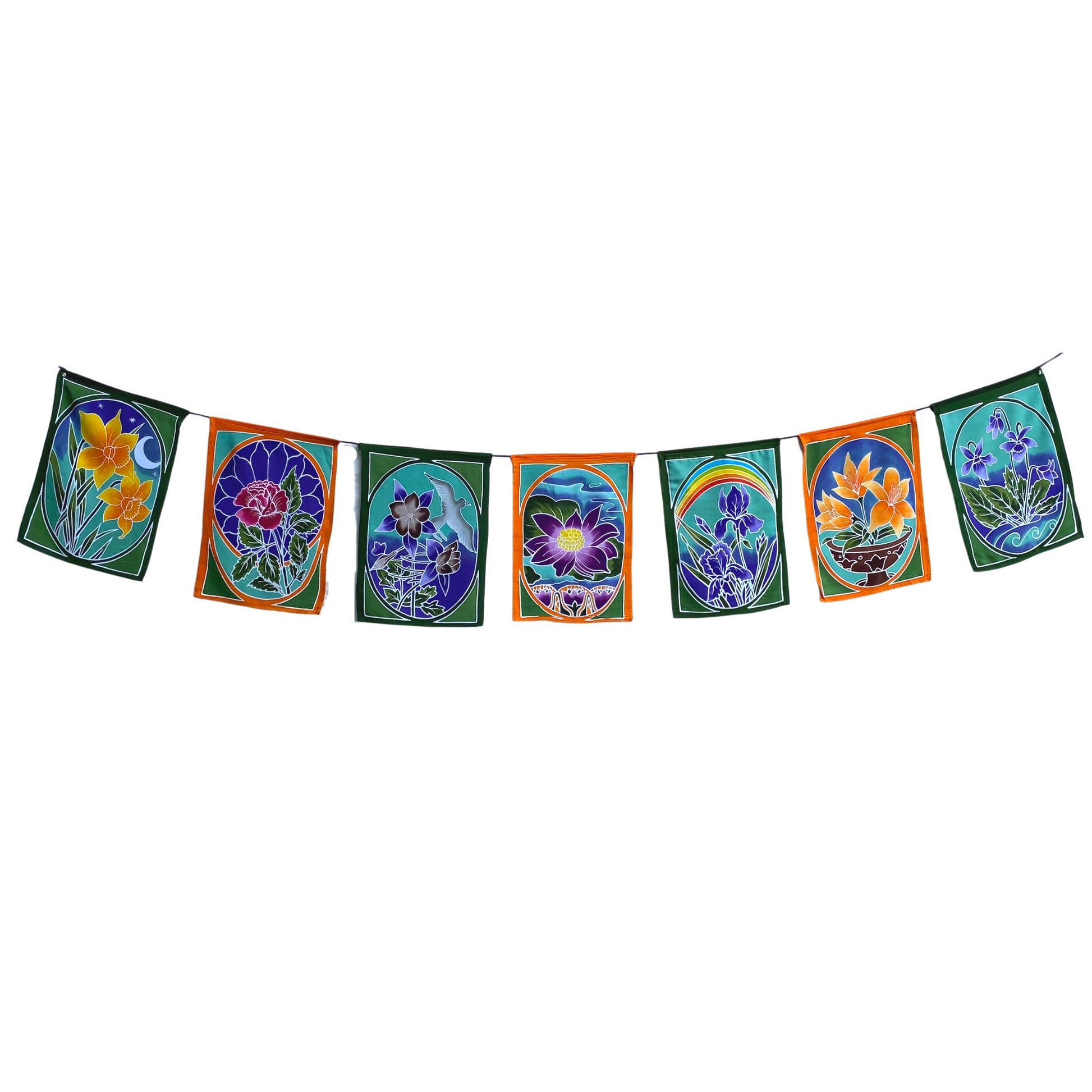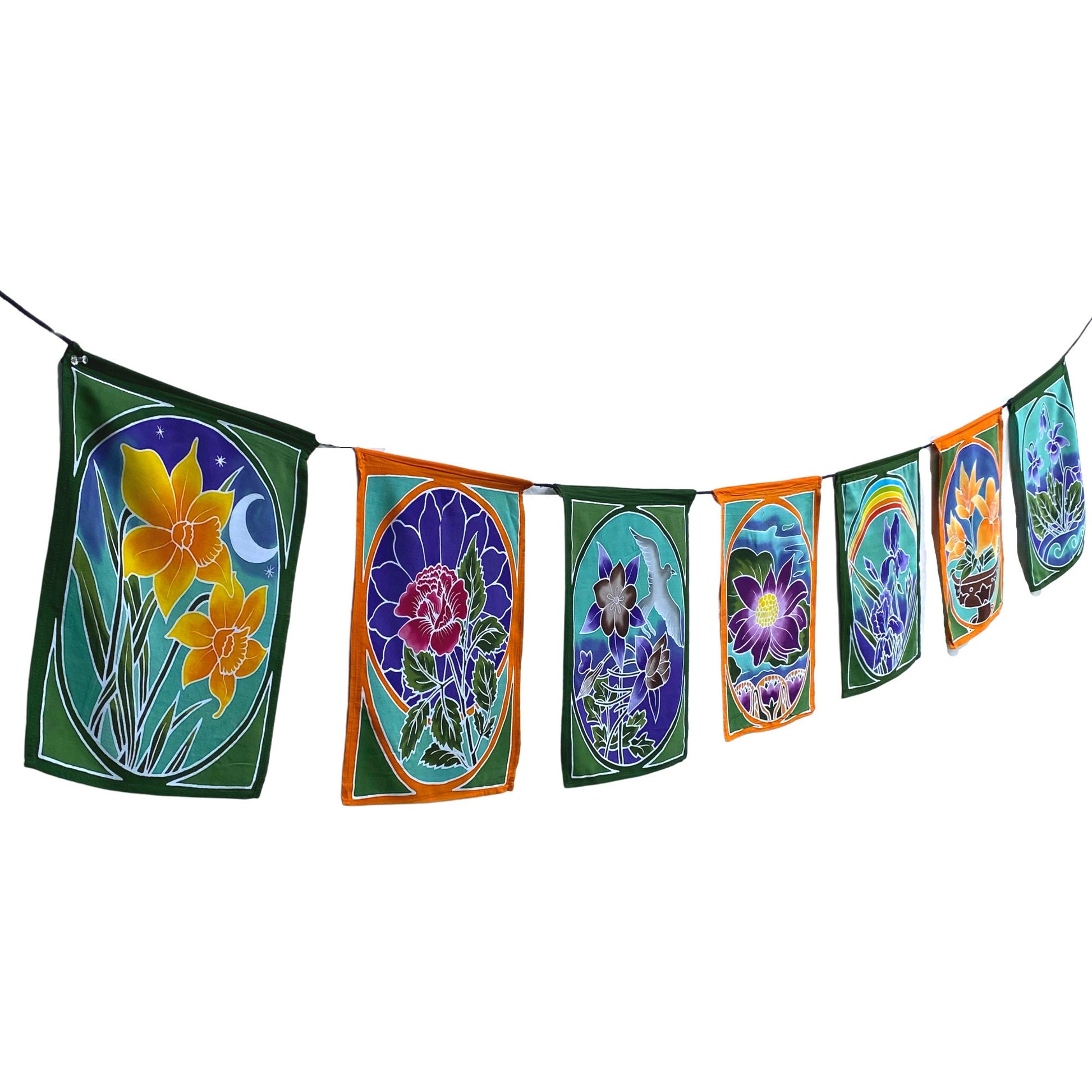 Sacred Lotus Garden Prayer Flag Wall Art Hanging string are all completely hand crafted on the Island of Bali. Each flag is painstakingly hand batik-ed by a group of Balinese Ladies in the Ubud Area that we have been working with since 2001. Ubud is famous for this type of batik painting. The wax is drawn on to each hanging in the desired design. The colors are then brushed on by hand with simple bamboo brushes , and blended. The wax forms a block and prevents the colors from bleeding into one another. When they are done applying the colors, the dyes are set, and the wax is removed. The amazing fabrics are laid out in the rice fields to dry. This results in a beautiful depth of color you would never find in a mass produced machine printed fabric.