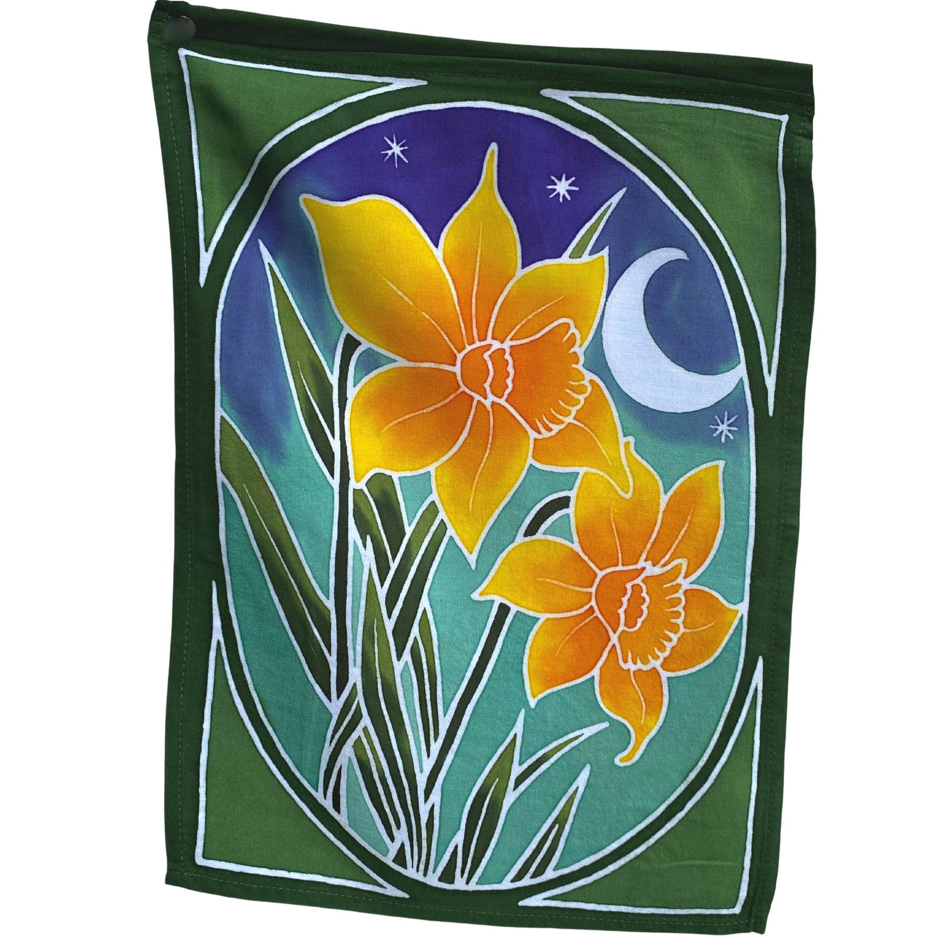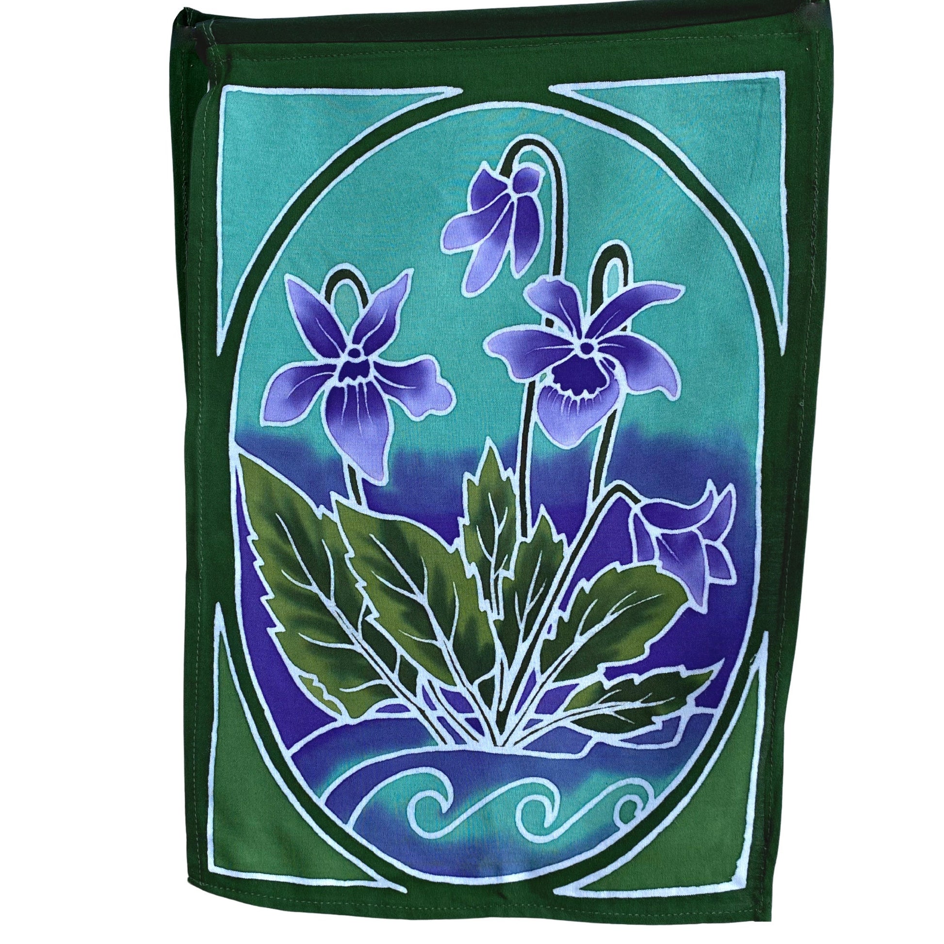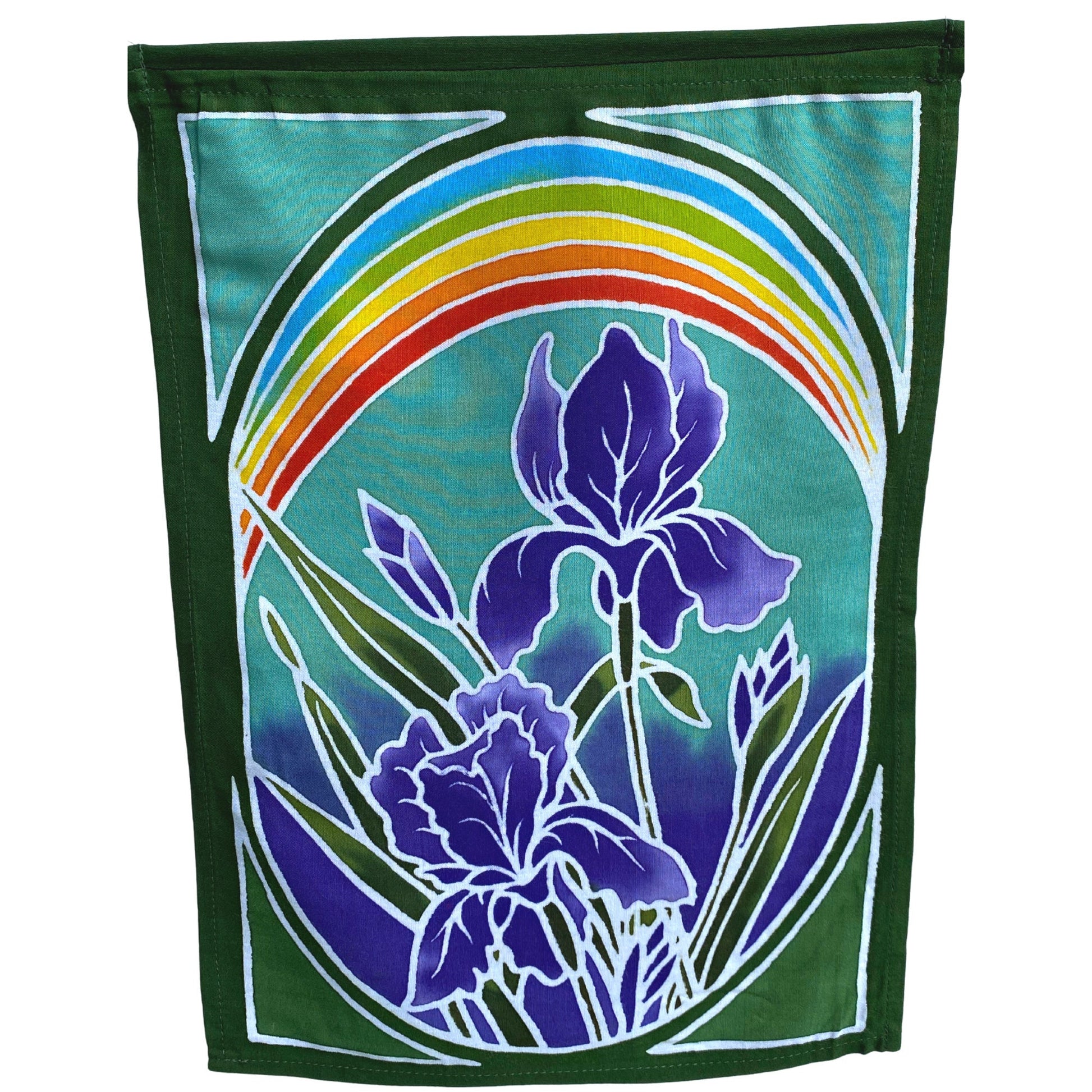 Sacred Lotus Garden Prayer Flag Wall Art Hanging string are all completely hand crafted on the Island of Bali. Each flag is painstakingly hand batik-ed by a group of Balinese Ladies in the Ubud Area that we have been working with since 2001. Ubud is famous for this type of batik painting. The wax is drawn on to each hanging in the desired design. The colors are then brushed on by hand with simple bamboo brushes , and blended. The wax forms a block and prevents the colors from bleeding into one another. When they are done applying the colors, the dyes are set, and the wax is removed. The amazing fabrics are laid out in the rice fields to dry. This results in a beautiful depth of color you would never find in a mass produced machine printed fabric.