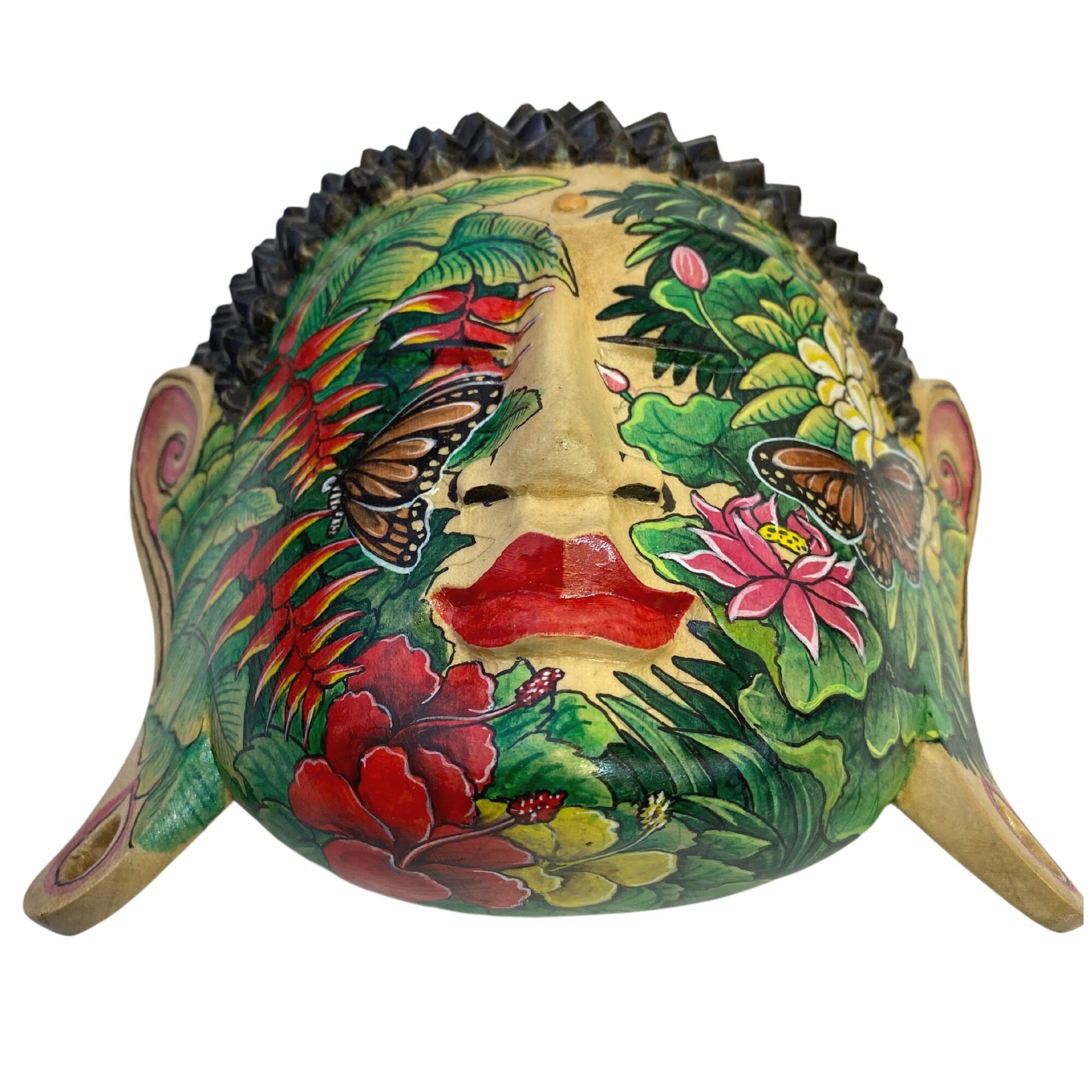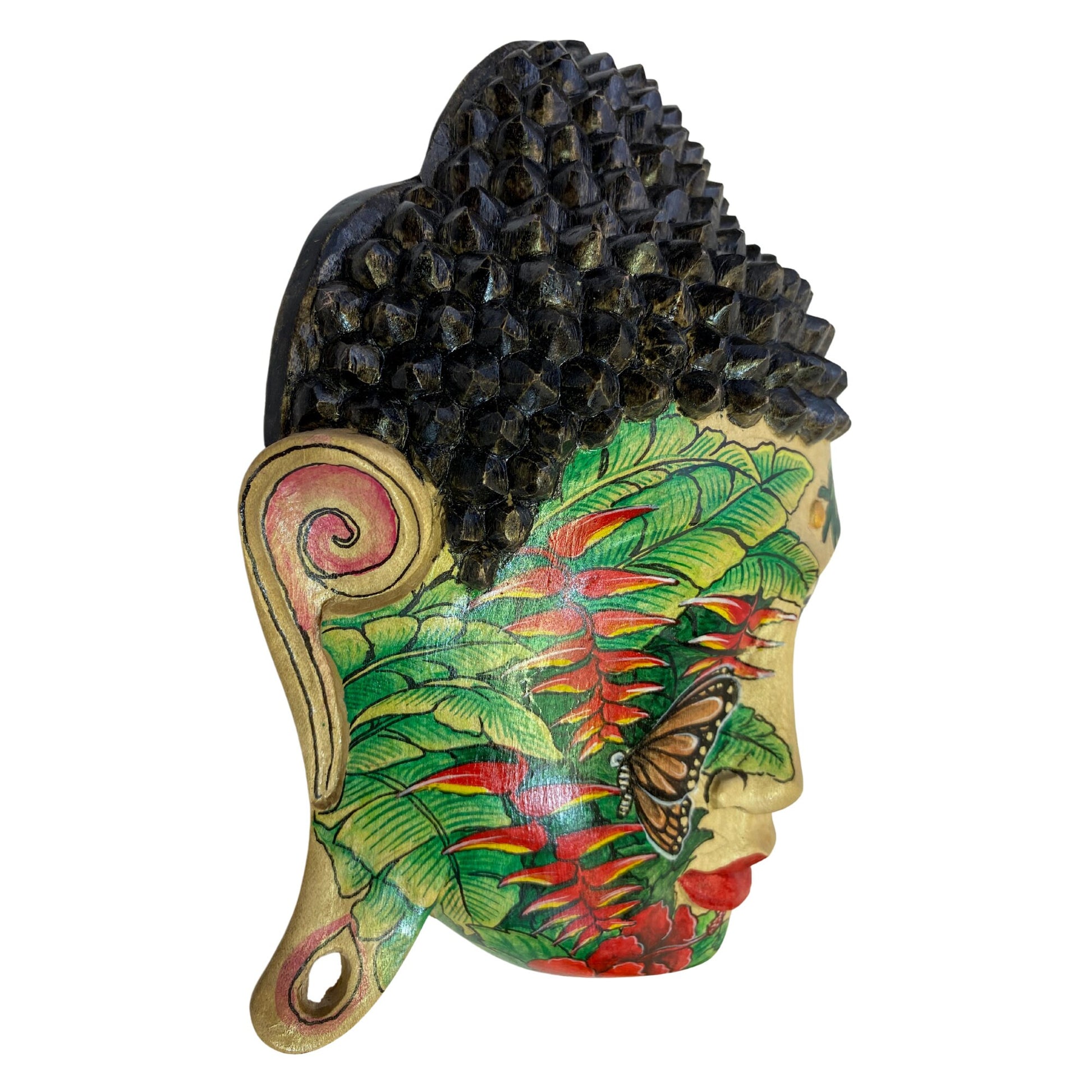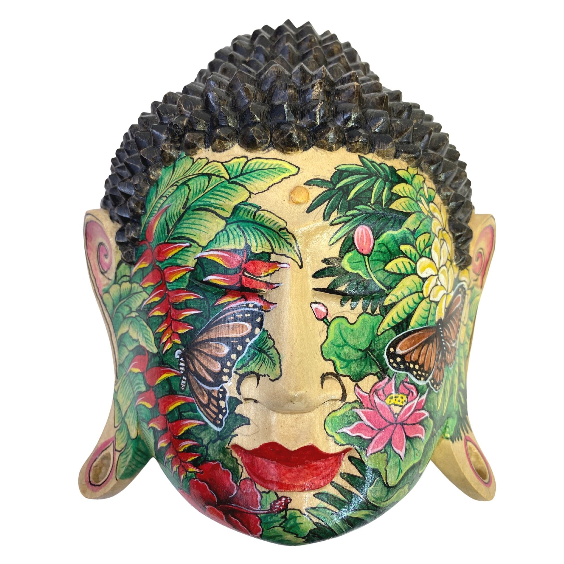 Beautiful hand carved Rainforest Mystic Buddha Mask, crafted from smooth grained & dense crocodile wood, the finely detailed painting is added by hand with colorful acrylic paints in restful and serene shades of green depicting Bali's colorful butterflies, and lush tropical heliconia, frangipani and lotus flowers among lush foliage.