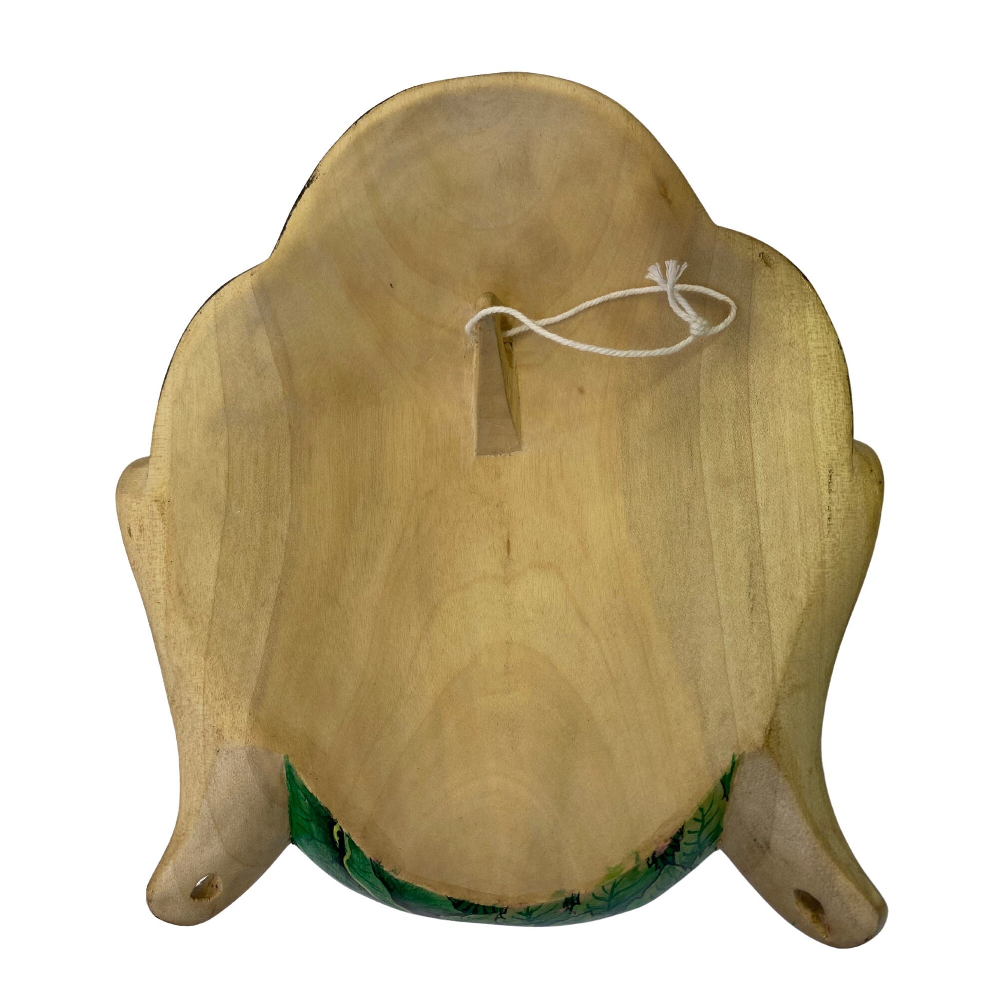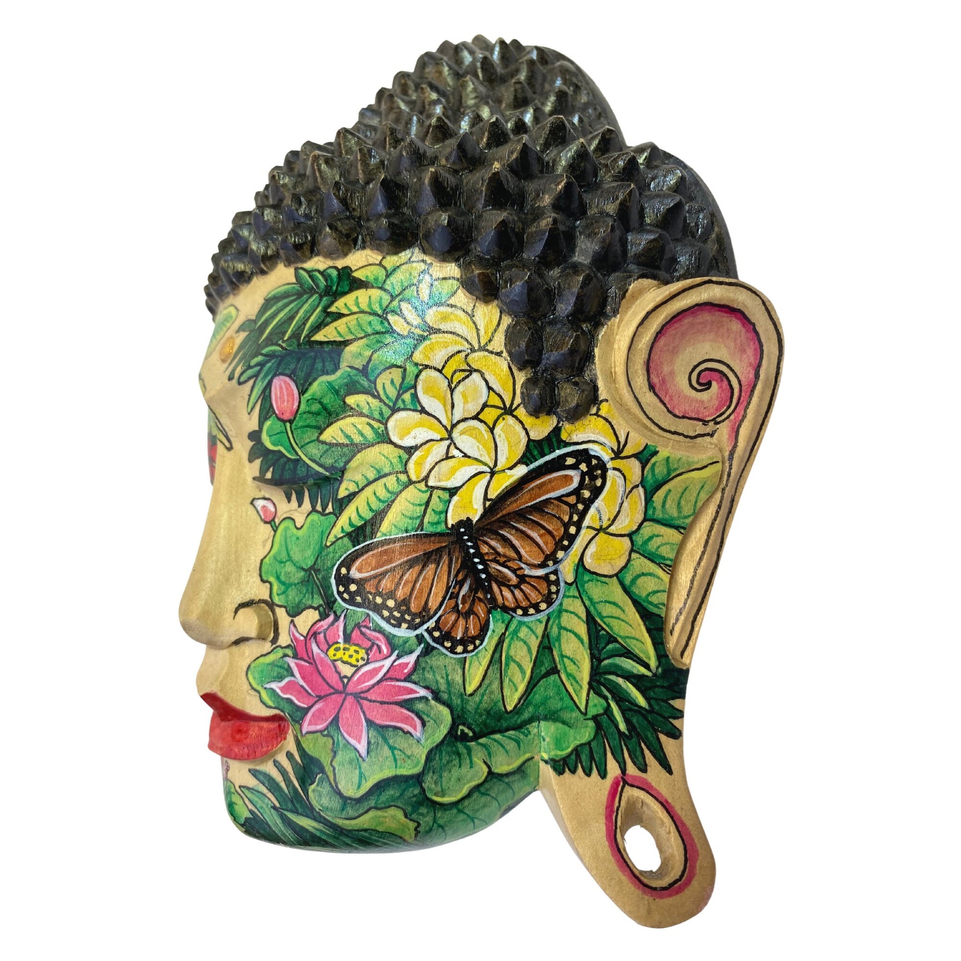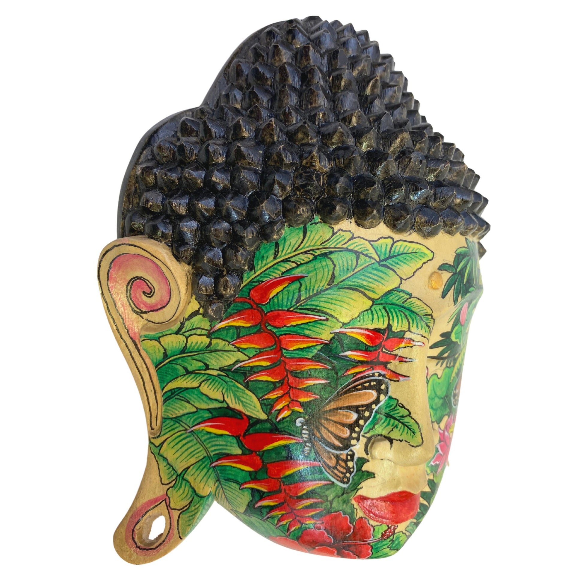 Beautiful hand carved Rainforest Mystic Buddha Mask, crafted from smooth grained & dense crocodile wood, the finely detailed painting is added by hand with colorful acrylic paints in restful and serene shades of green depicting Bali's colorful butterflies, and lush tropical heliconia, frangipani and lotus flowers among lush foliage.