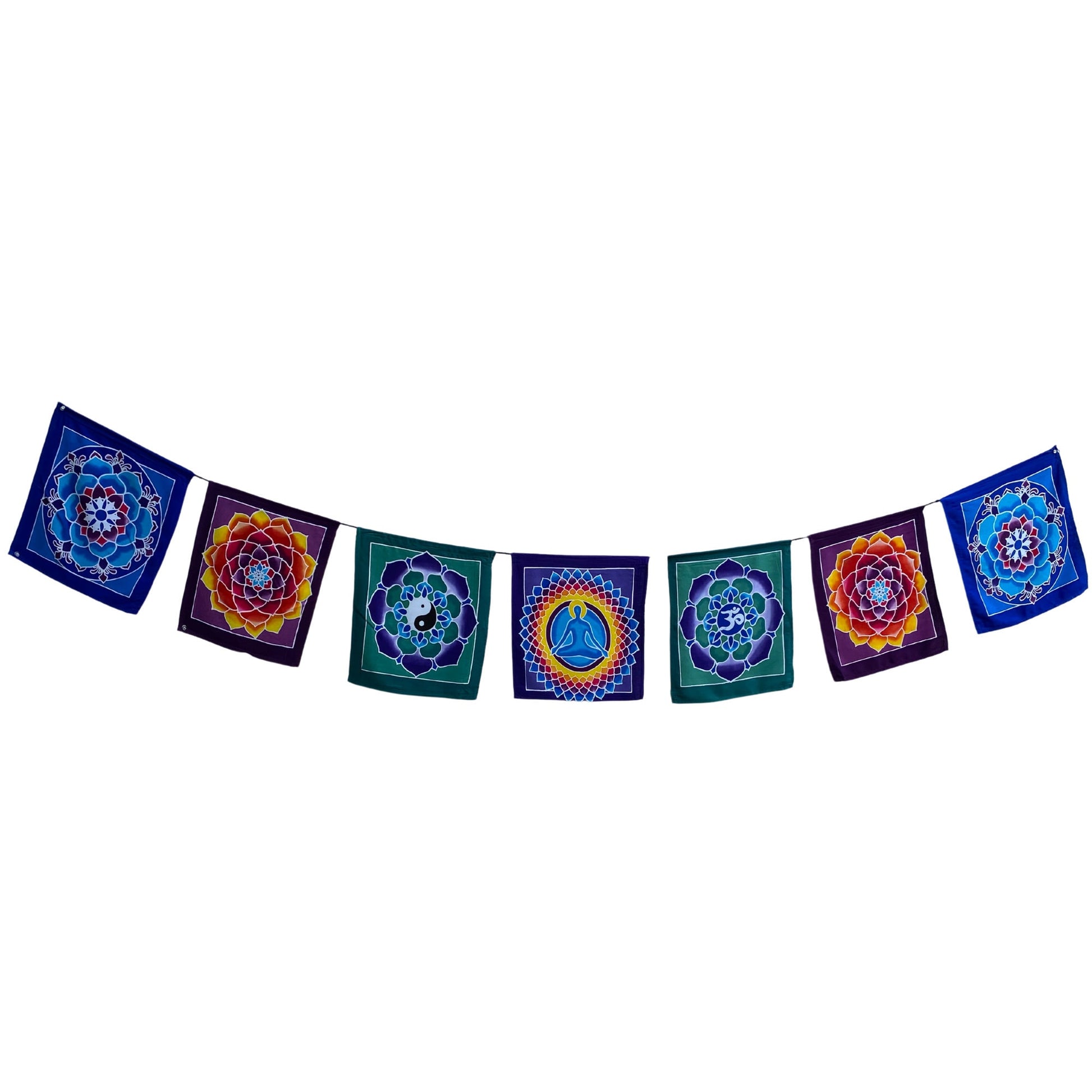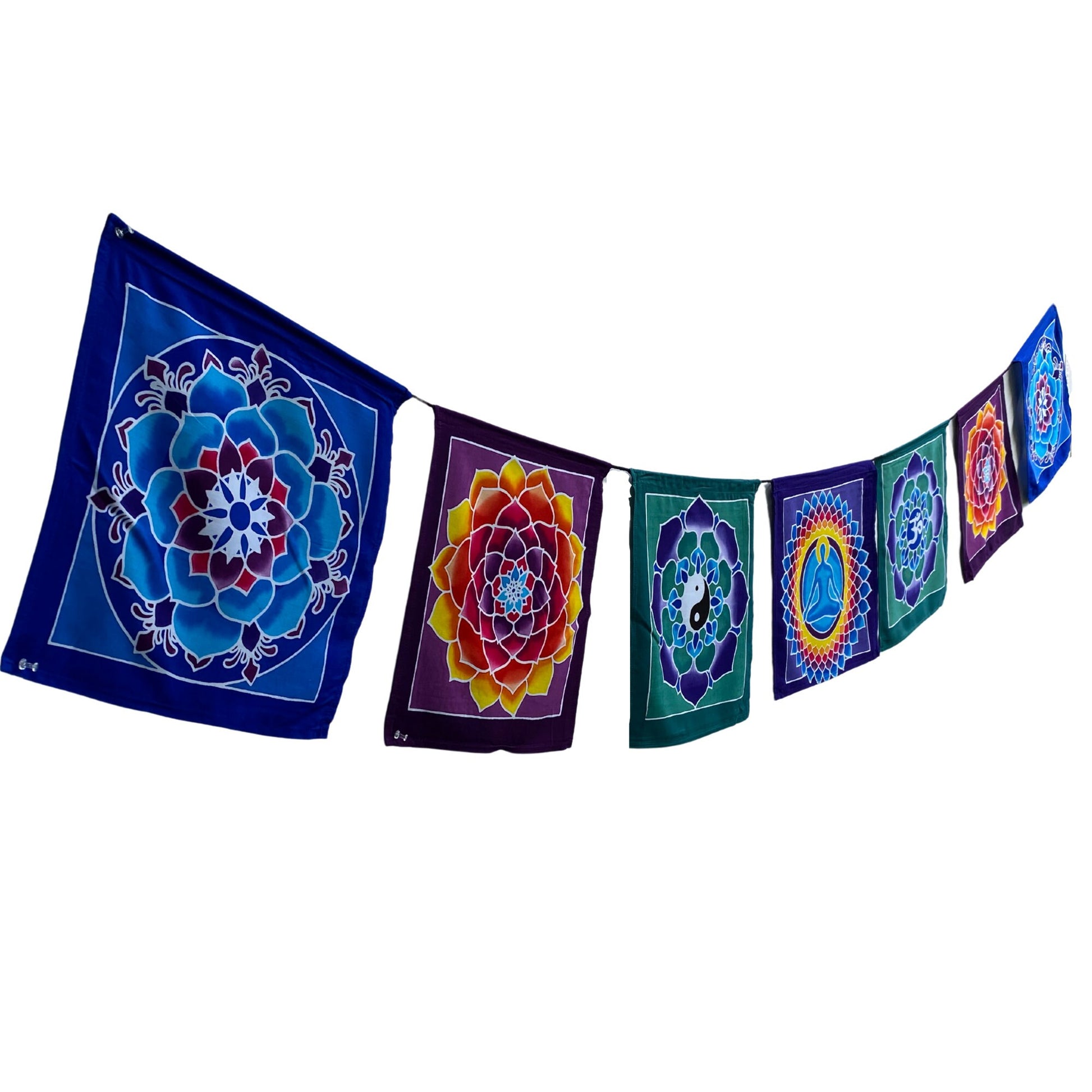 Enhance meditation and healing body work with these beautiful flags. Seven beautifully hand batik richly colored mandala flags sewn onto a cord.
