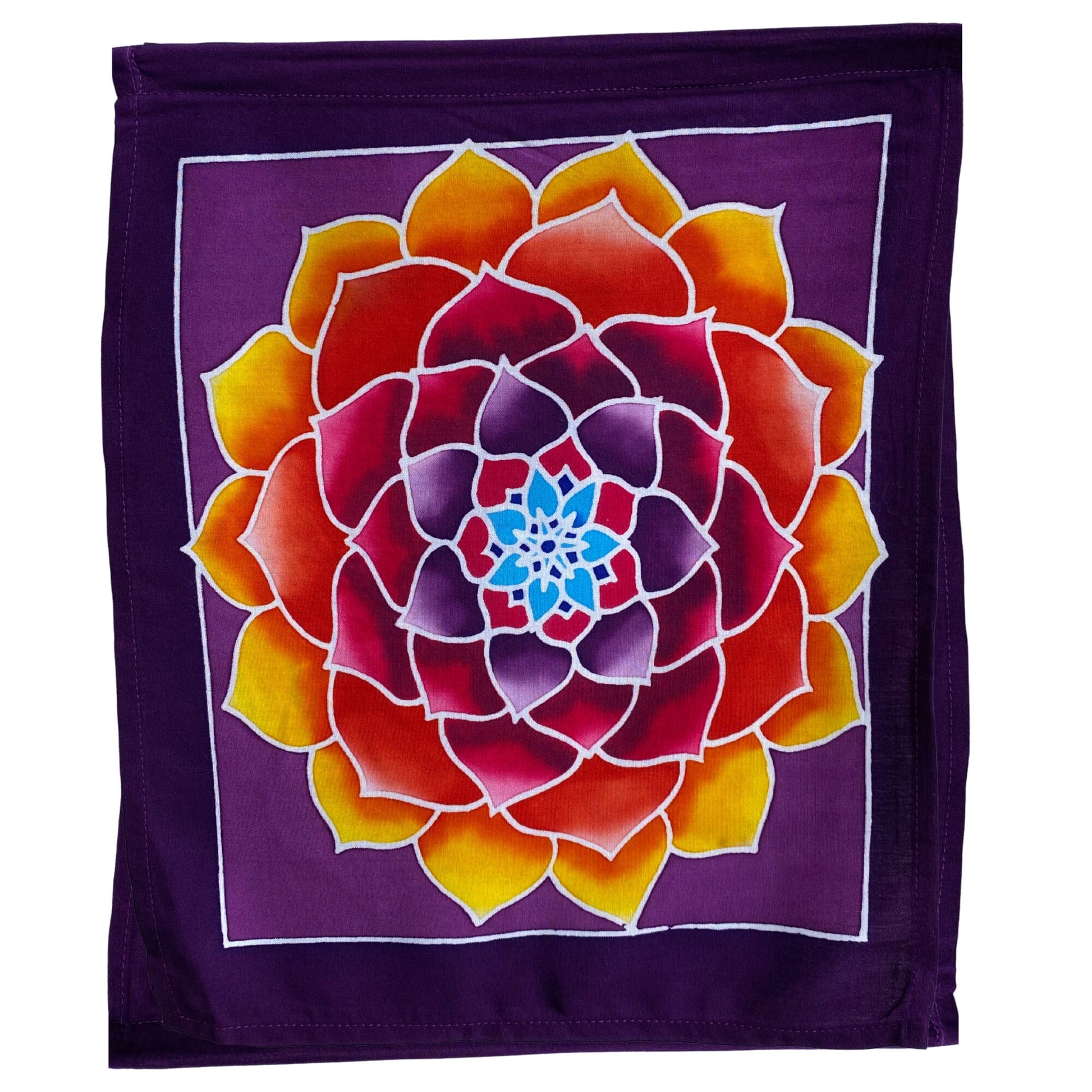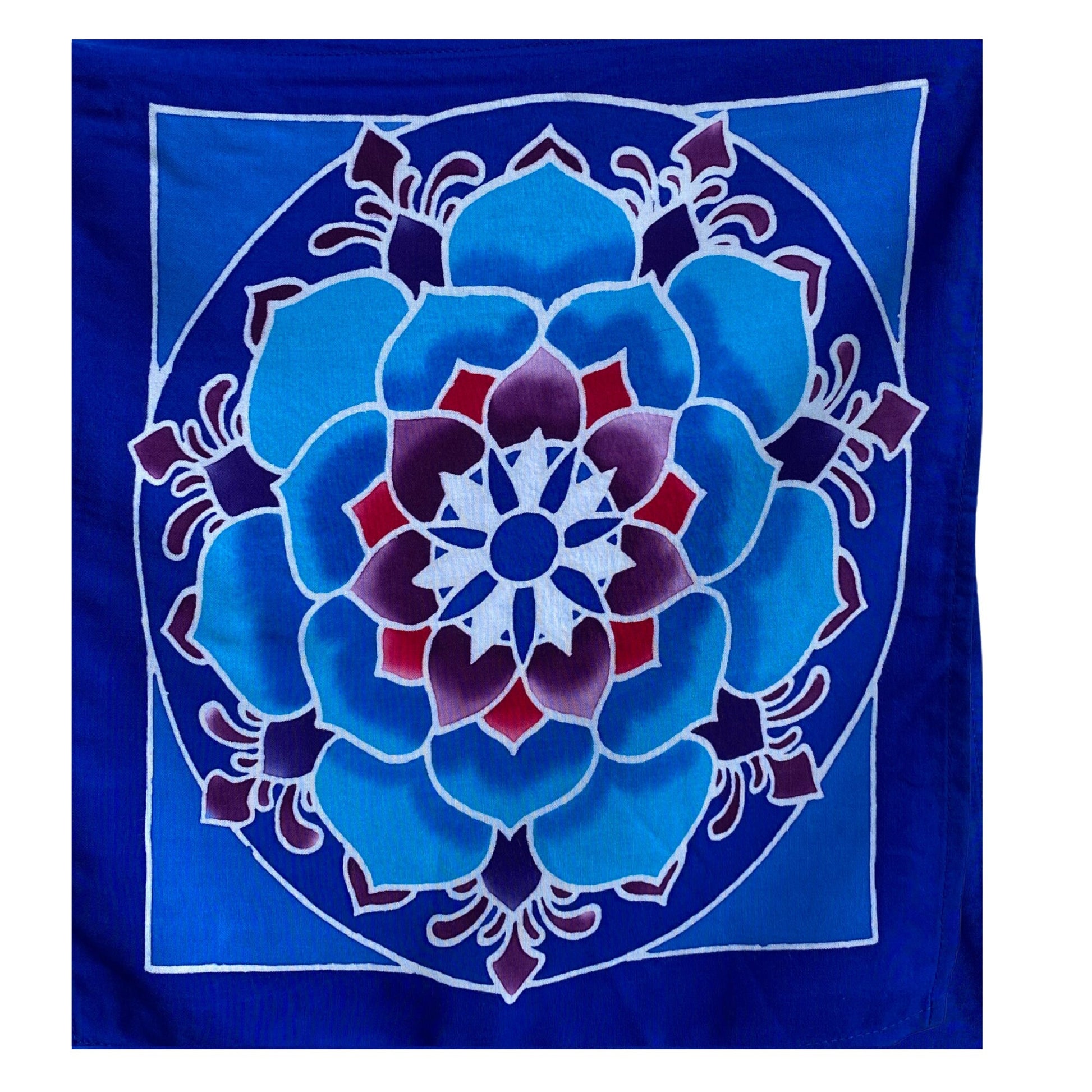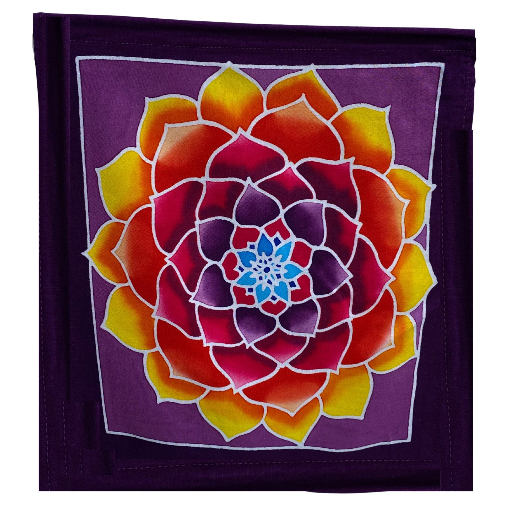 Beautiful Hand Batik Lotus Sacred Mandala Pray Flag set are all completely hand crafted on the Island of Bali. Each flag is painstakingly hand batik-ed by a group of Balinese Ladies in the Ubud Area. Ubud is famous for this type of batik painting. The wax is drawn on to each hanging in the desired design. The colors are then brushed on by hand with simple bamboo brushes , and blended. The wax forms a block and prevents the colors from bleeding into one another. When they are done applying the colors, the dyes are set, and the wax is removed. And the amazing fabrics are laid out in the rice fields to dry. This results in a beautiful depth of color you would never find in a mass produced machine printed fabric.