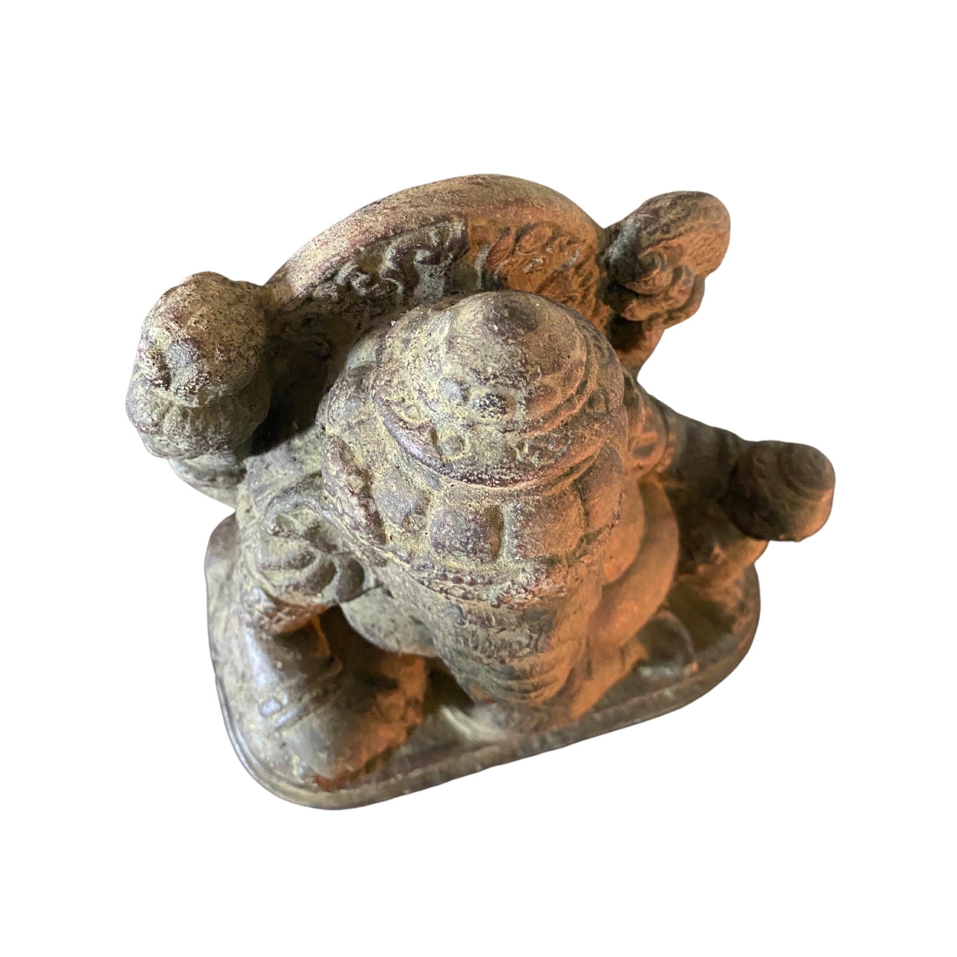 Ganesha Reclining Garden Statue crafted in hand cast lava stone. This kind, happy 4 armed Ganesha is reclining with his big pot belly, each hand is holding a different attribute of Ganesha, a mala, trident, axe & his beloved sweetmeat. Please see more photos. This is a really great sculpture and will be gorgeous inside your home or in your garden.