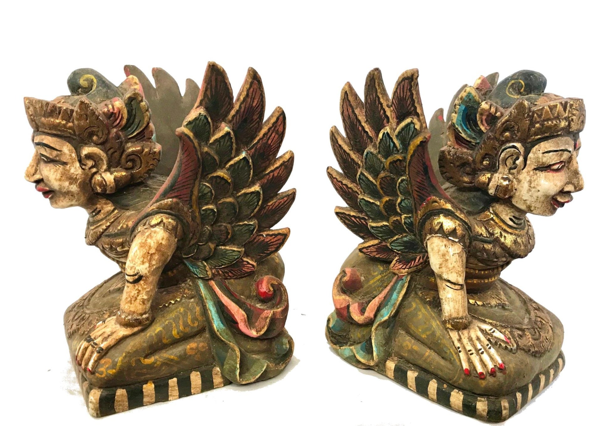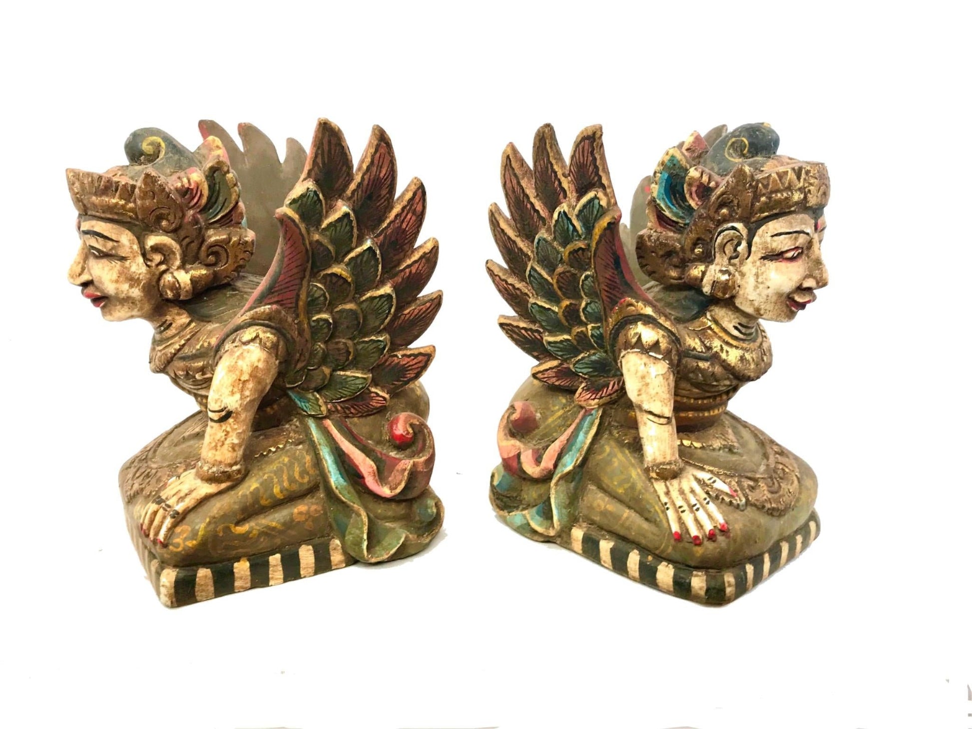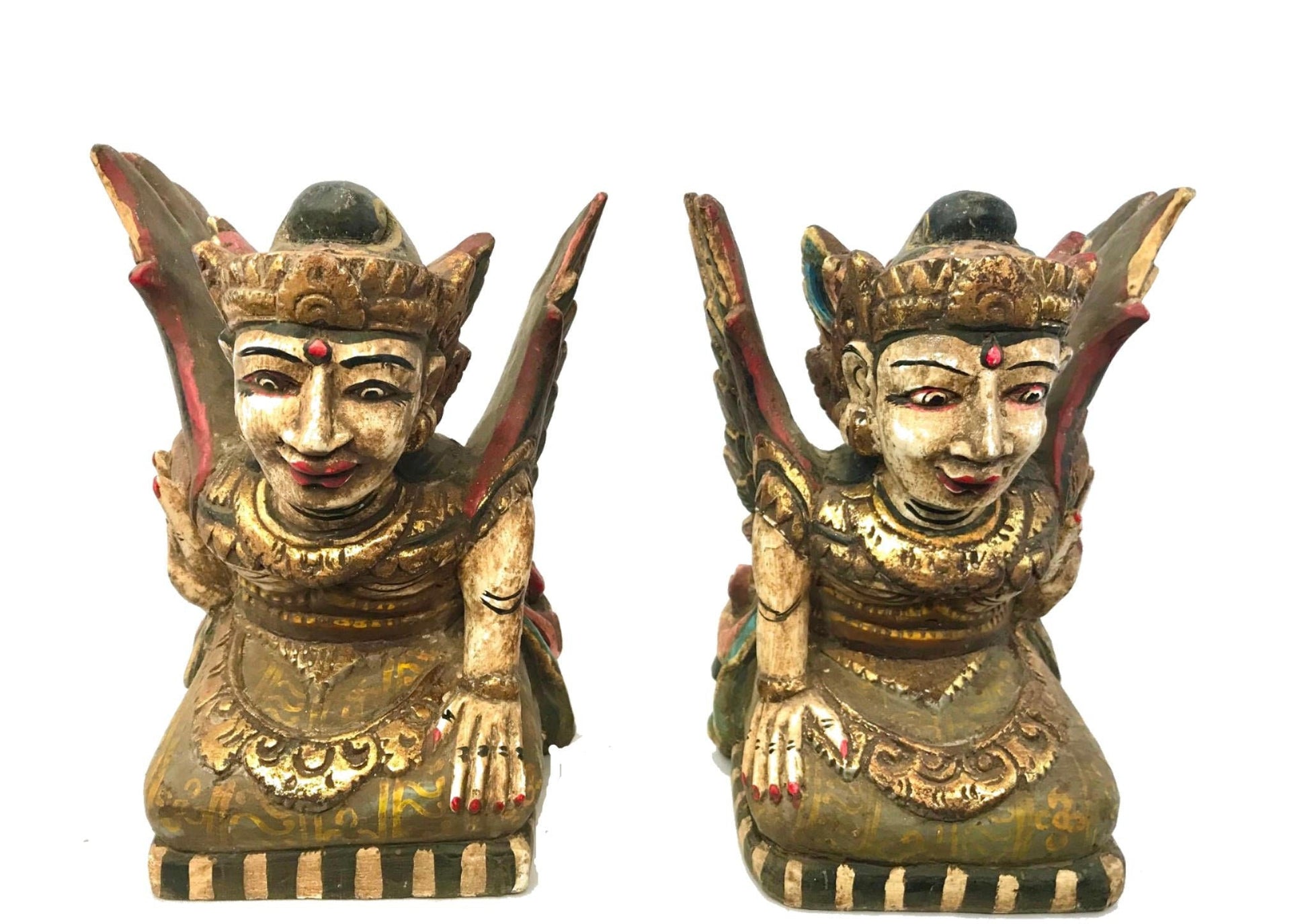 Pair of Winged Dewi Bidadari Goddess Vintage Balinese Pratima Temple Guardian Statues, hand carved and painted wood.