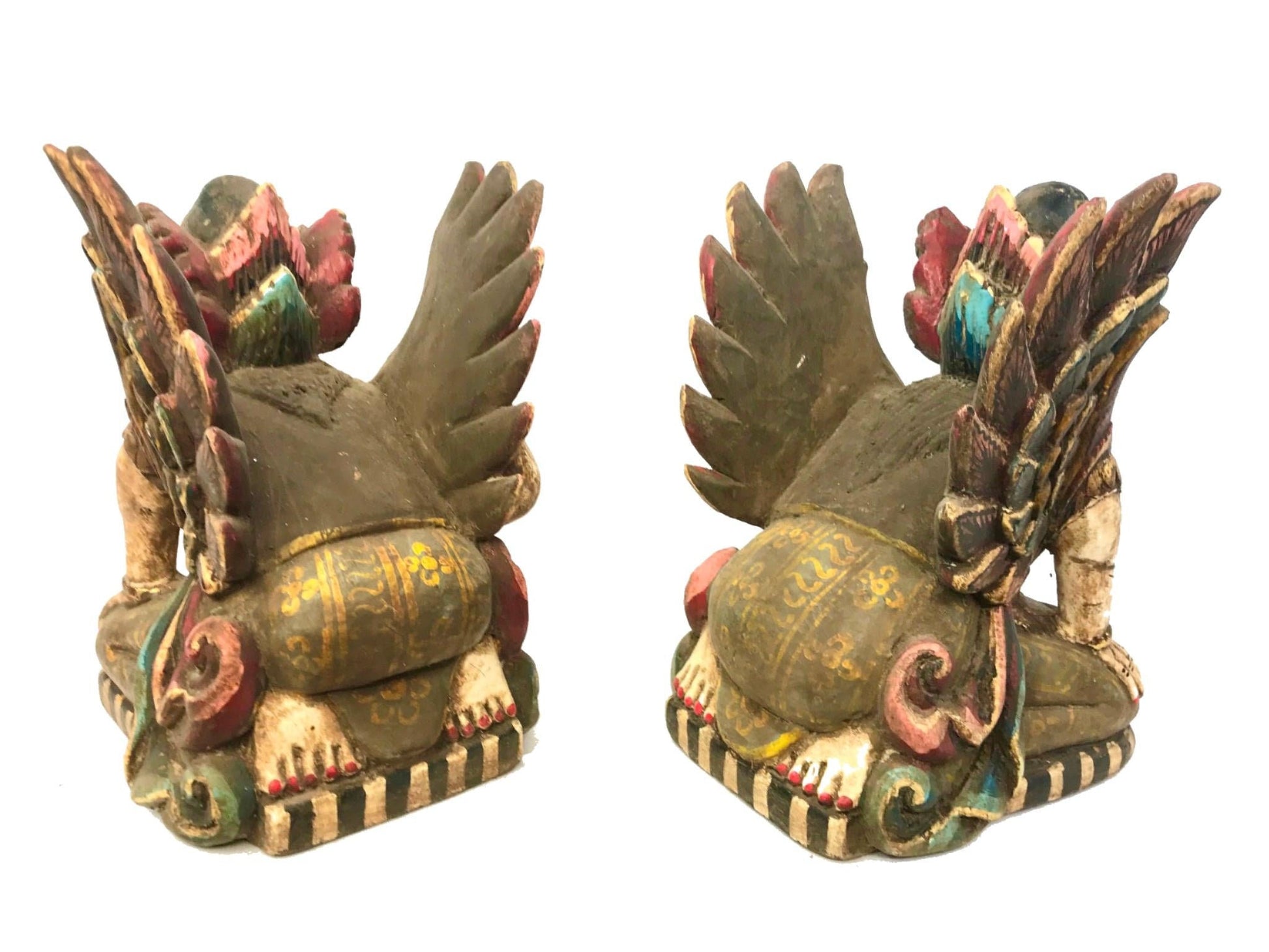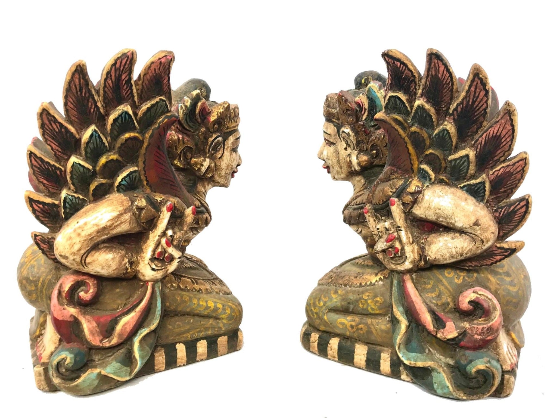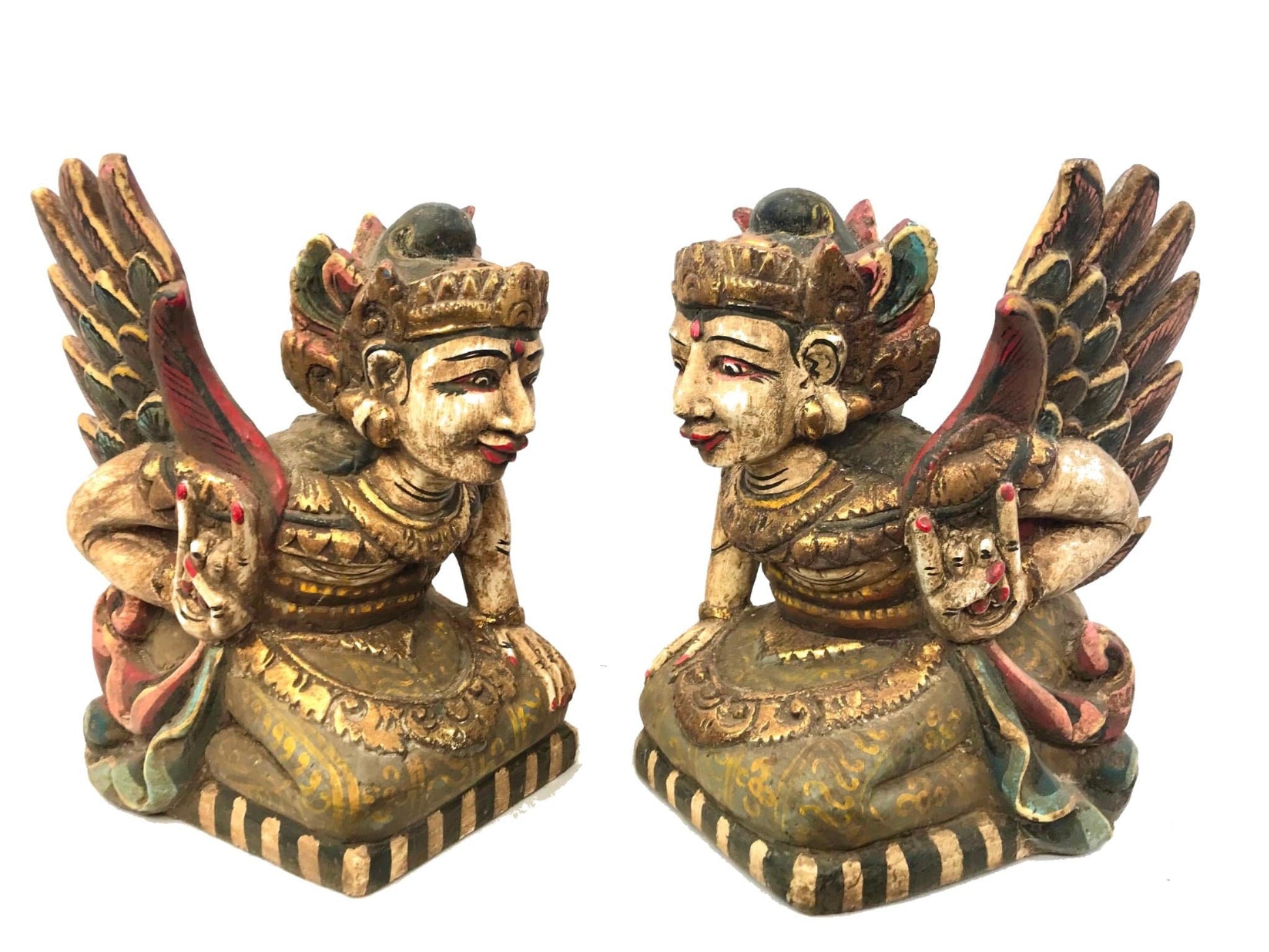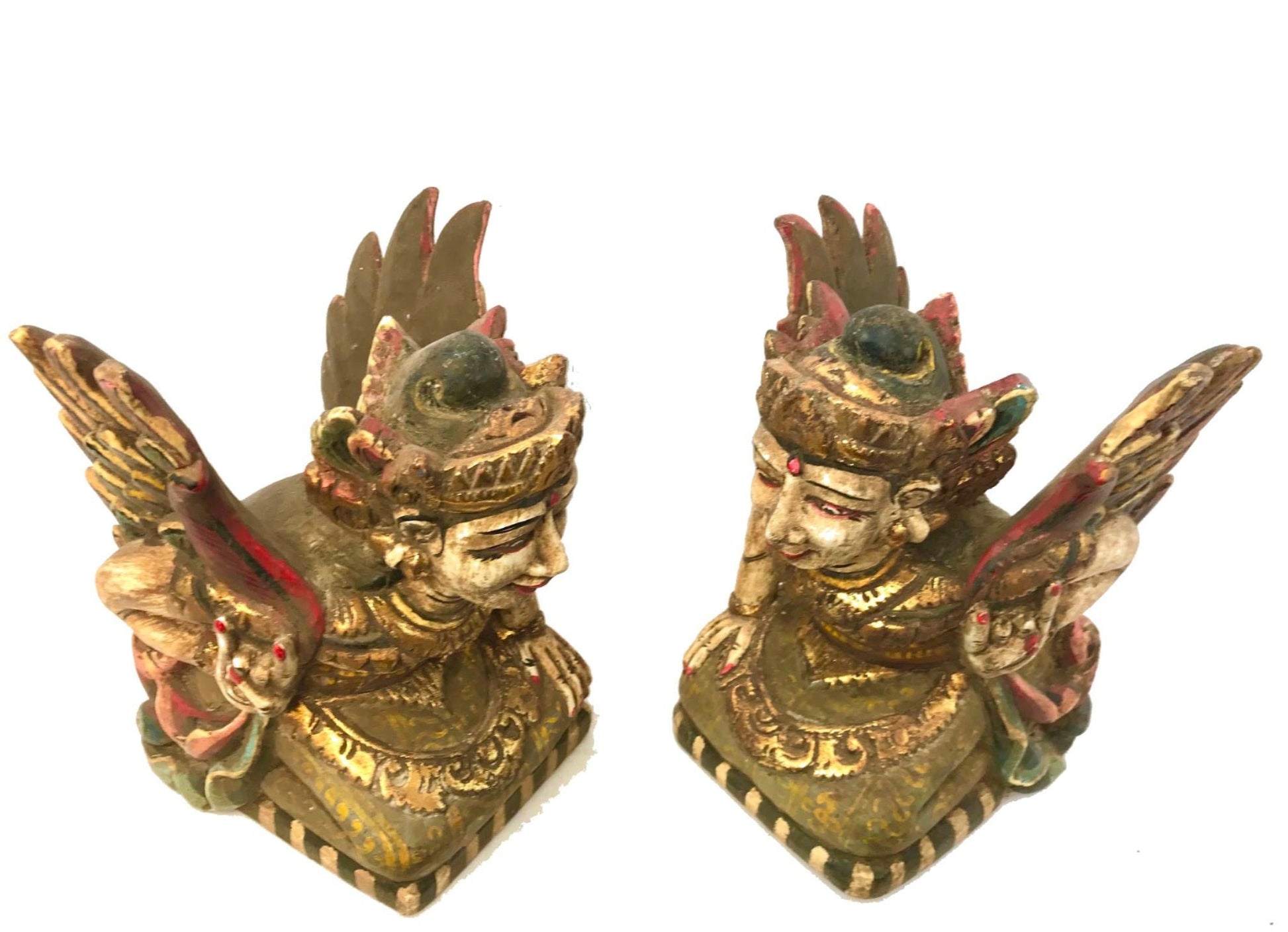 Pair of Winged Dewi Bidadari Goddess Vintage Balinese Pratima Temple Guardian Statues, hand carved and painted wood.