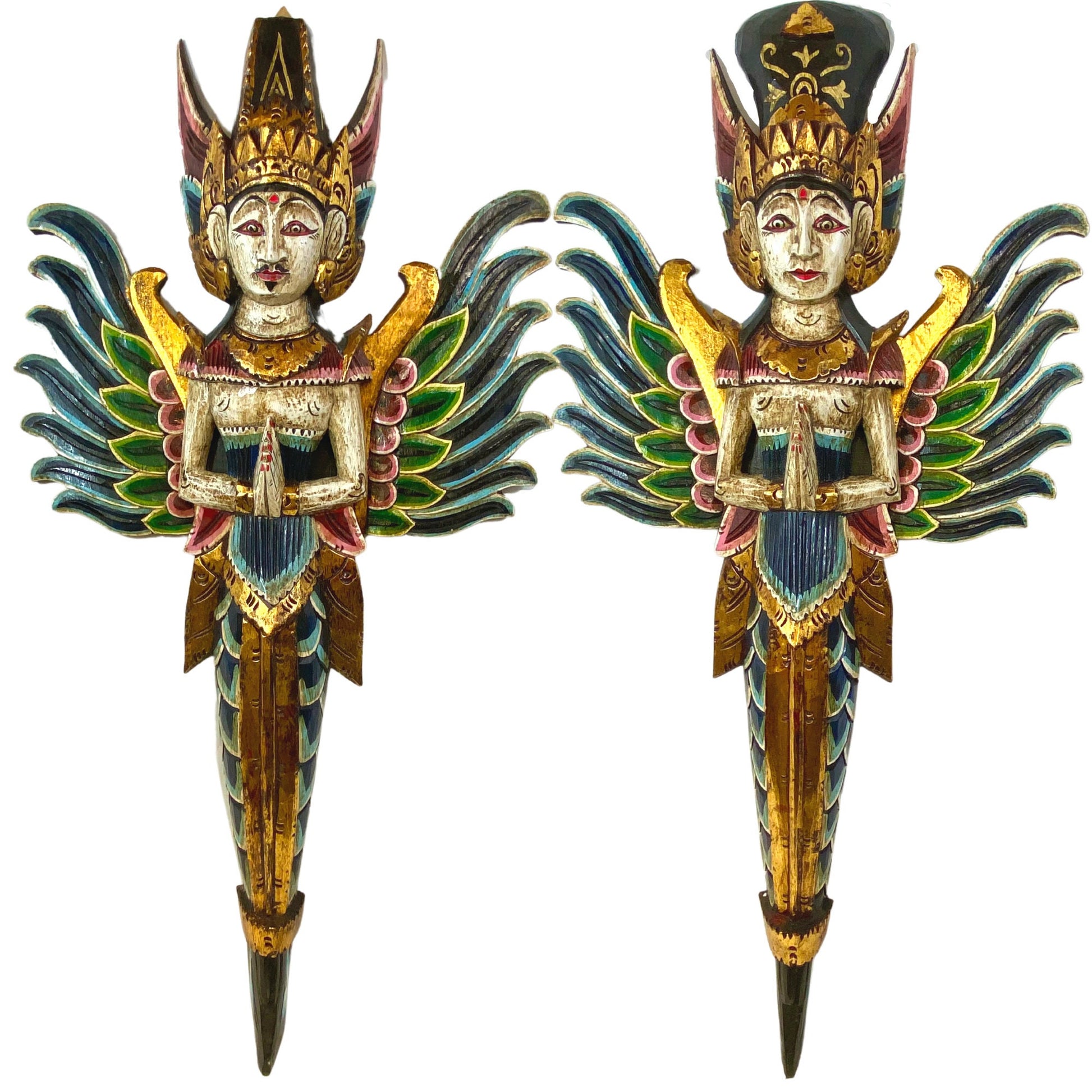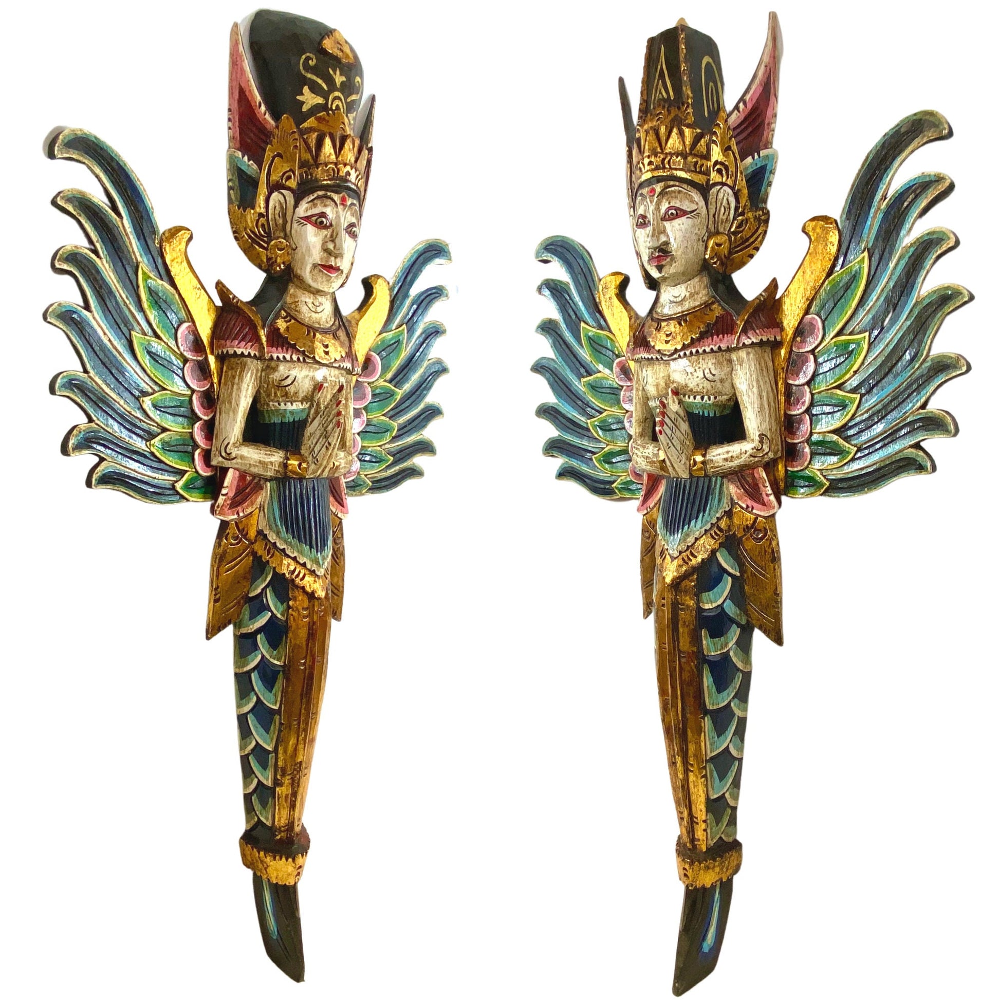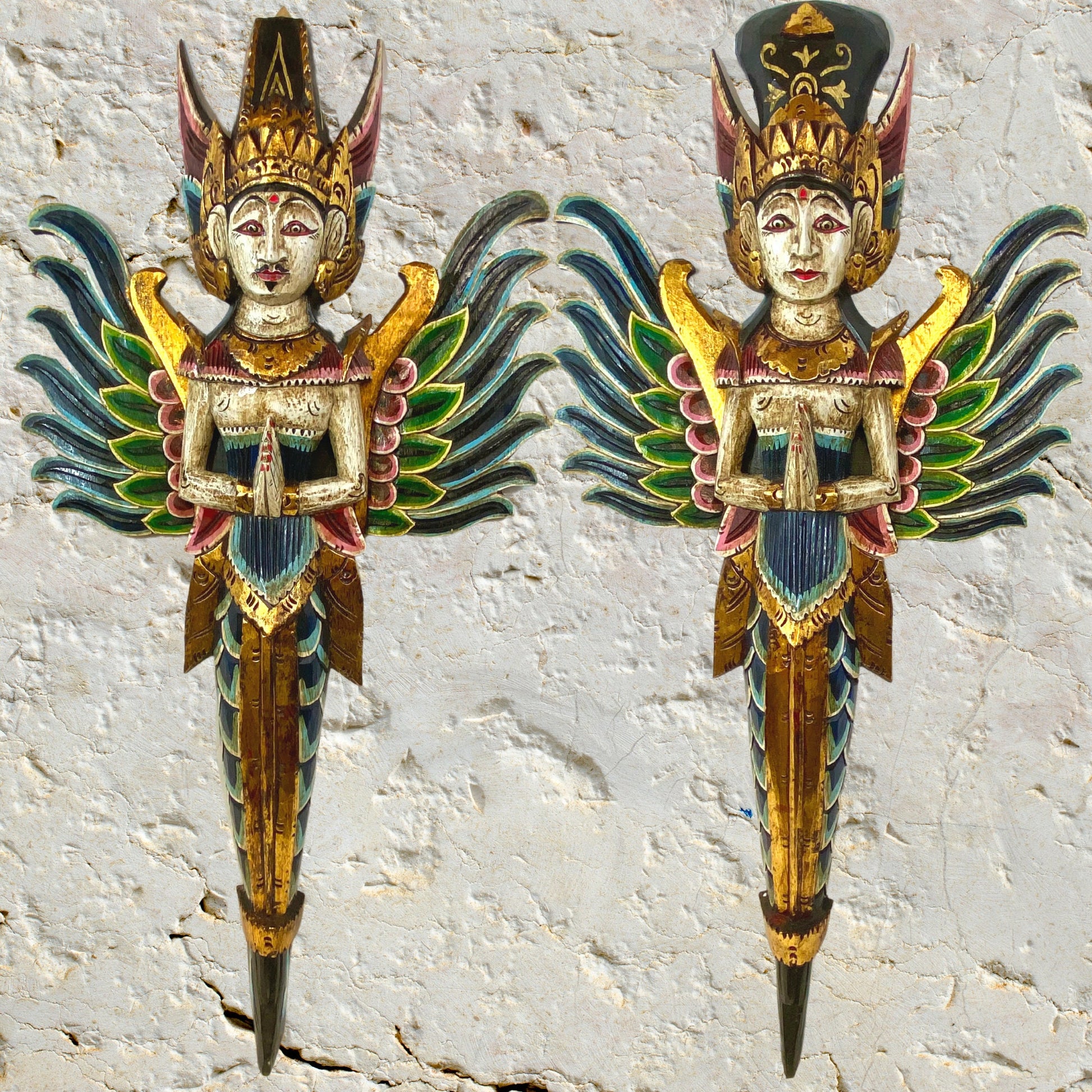 Balinese Folk Art Winged Mermaid Rama & Sita Wall Art Statues hand carved in wood, set of 2. The Balinese artist painted this in the traditional fashion, in rich shades of teal, green & red with touches of gold leaf and black. Wings removable for easy shipping and storage.