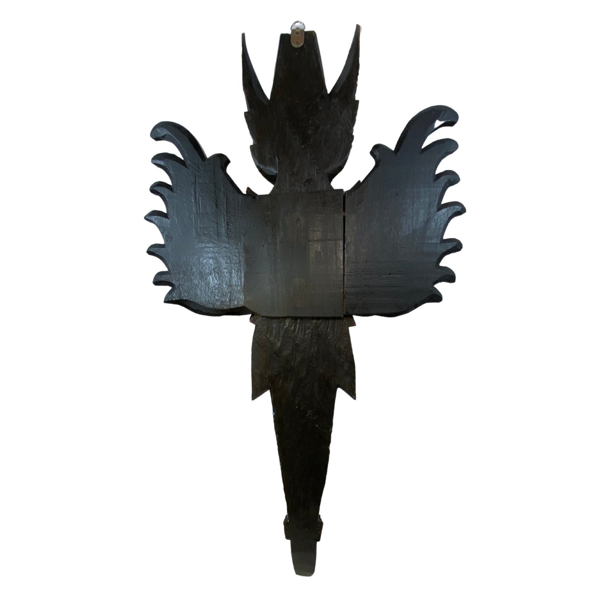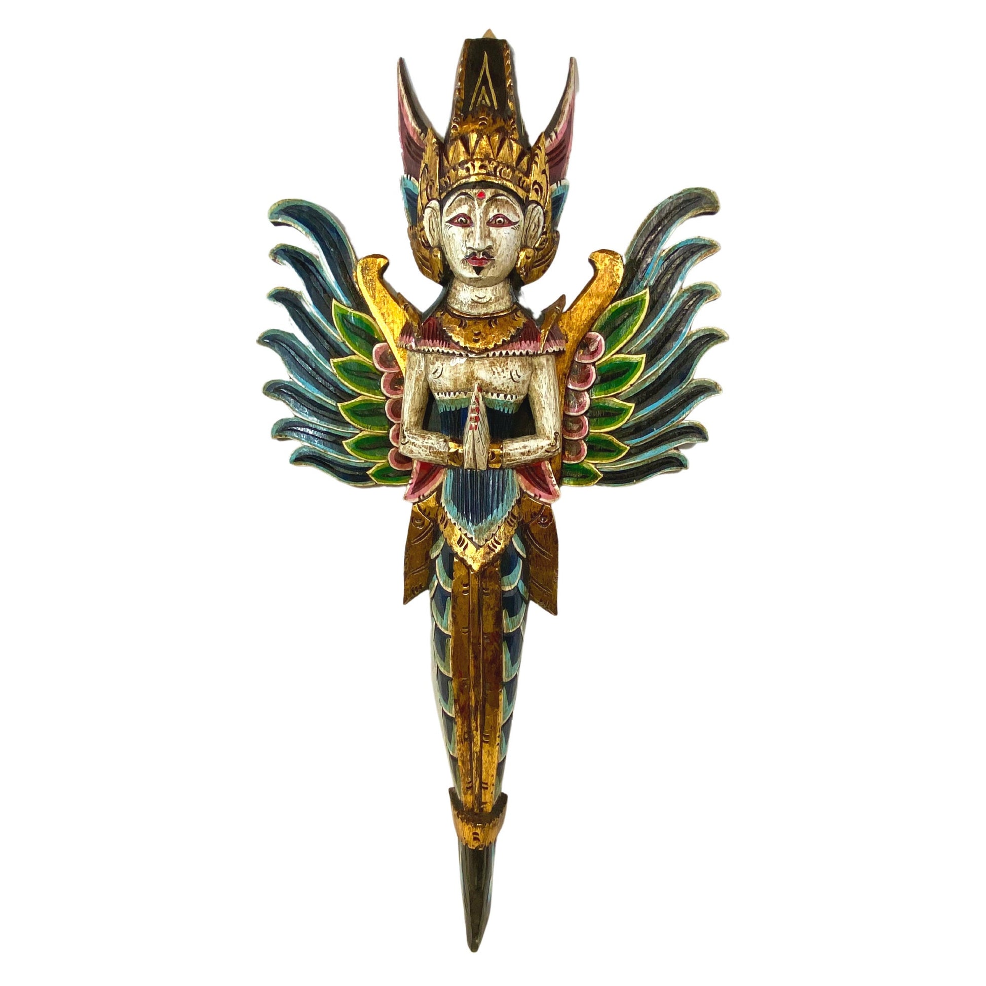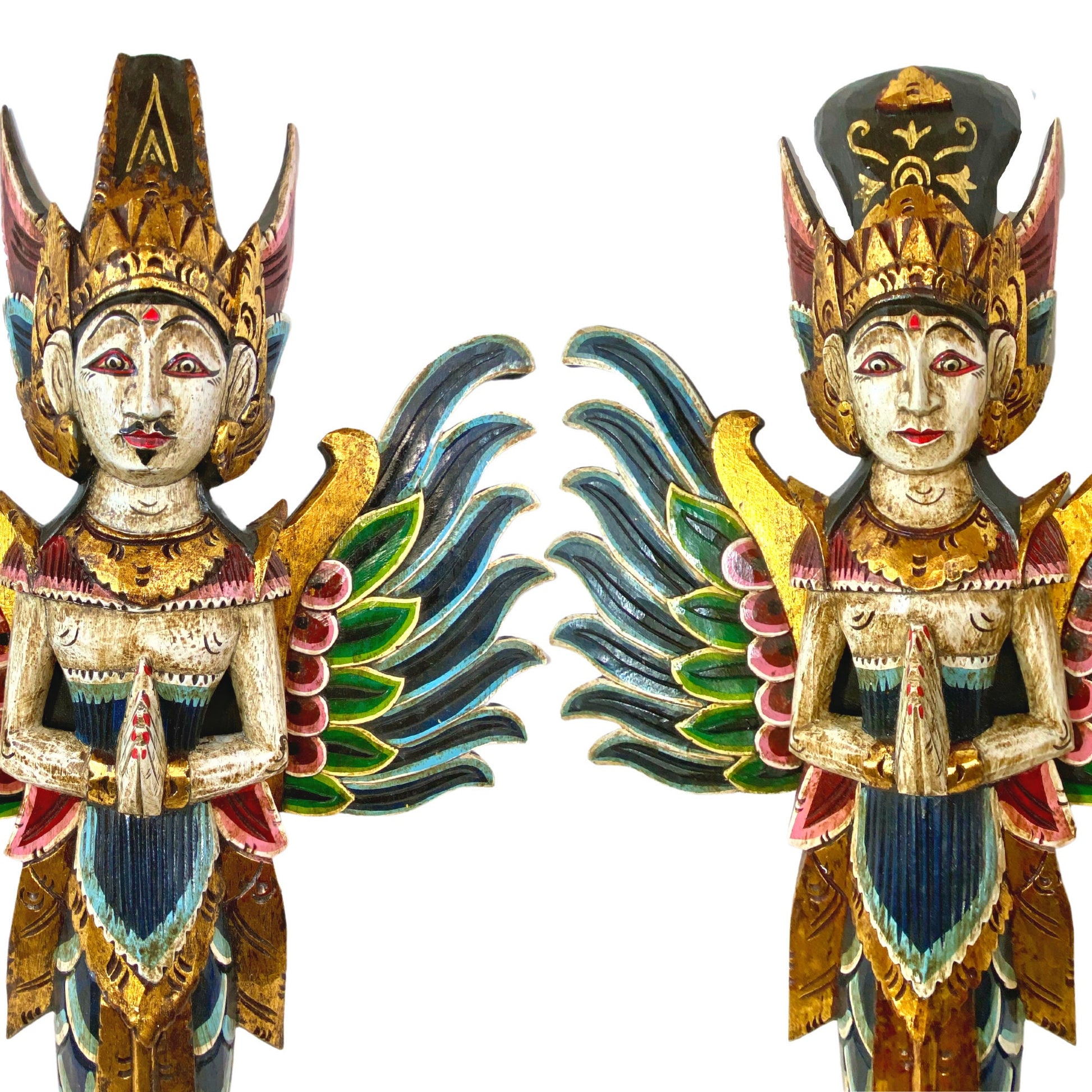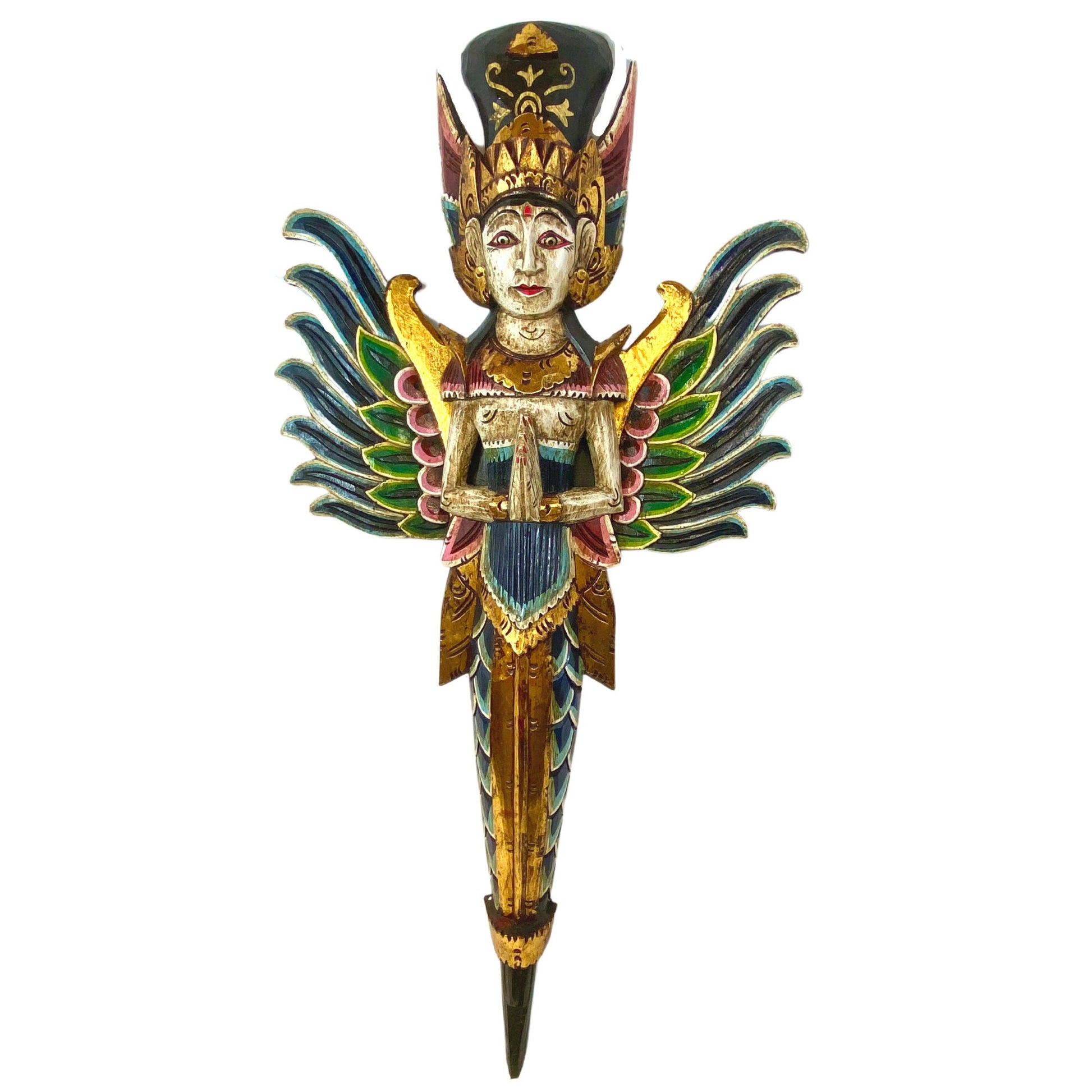 Balinese Folk Art Winged Mermaid Rama & Sita Wall Art Statues hand carved in wood, set of 2. The Balinese artist painted this in the traditional fashion, in rich shades of teal, green & red with touches of gold leaf and black. Wings removable for easy shipping and storage.